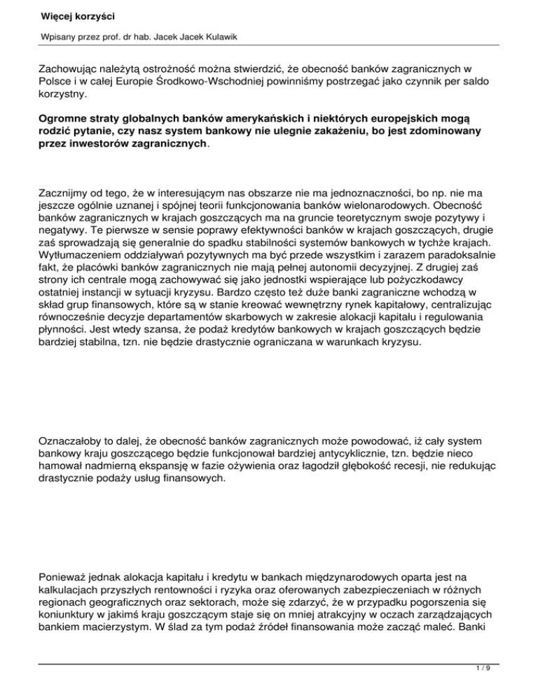 Więcej korzyści Wpisany przez prof. dr hab. Jacek Jacek Kulawik Zachowując należytą ostrożność można stwierdzić, że obecność banków zagranicznych w Polsce i w całej Europie Środkowo-Wschodniej powinniśmy postrzegać jako czynnik per saldo korzystny. Ogromne straty globalnych banków amerykańskich i niektórych europejskich mogą rodzić pytanie, czy nasz system bankowy nie ulegnie zakażeniu, bo jest zdominowany przez inwestorów zagranicznych. Zacznijmy od tego, że w interesującym nas obszarze nie ma jednoznaczności, bo np. nie ma jeszcze ogólnie uznanej i spójnej teorii funkcjonowania banków wielonarodowych. Obecność banków zagranicznych w krajach goszczących ma na gruncie teoretycznym swoje pozytywy i negatywy. Te pierwsze w sensie poprawy efektywności banków w krajach goszczących, drugie zaś sprowadzają się generalnie do spadku stabilności systemów bankowych w tychże krajach. Wytłumaczeniem oddziaływań pozytywnych ma być przede wszystkim i zarazem paradoksalnie fakt, że placówki banków zagranicznych nie mają pełnej autonomii decyzyjnej. Z drugiej zaś strony ich centrale mogą zachowywać się jako jednostki wspierające lub pożyczkodawcy ostatniej instancji w sytuacji kryzysu. Bardzo często też duże banki zagraniczne wchodzą w skład grup finansowych, które są w stanie kreować wewnętrzny rynek kapitałowy, centralizując równocześnie decyzje departamentów skarbowych w zakresie alokacji kapitału i regulowania płynności. Jest wtedy szansa, że podaż kredytów bankowych w krajach goszczących będzie bardziej stabilna, tzn. nie będzie drastycznie ograniczana w warunkach kryzysu. Oznaczałoby to dalej, że obecność banków zagranicznych może powodować, iż cały system bankowy kraju goszczącego będzie funkcjonował bardziej antycyklicznie, tzn. będzie nieco hamował nadmierną ekspansję w fazie ożywienia oraz łagodził głębokość recesji, nie redukując drastycznie podaży usług finansowych. Ponieważ jednak alokacja kapitału i kredytu w bankach międzynarodowych oparta jest na kalkulacjach przyszłych rentowności i ryzyka oraz oferowanych zabezpieczeniach w różnych regionach geograficznych oraz sektorach, może się zdarzyć, że w przypadku pogorszenia się koniunktury w jakimś kraju goszczącym staje się on mniej atrakcyjny w oczach zarządzających bankiem macierzystym. W ślad za tym podaż źródeł finansowania może zacząć maleć. Banki 1/9 Więcej korzyści Wpisany przez prof. dr hab. Jacek Jacek Kulawik zagraniczne będą zatem zachowywały się procyklicznie. Sprawą otwartą jest więc wpływ netto ich obecności na przebieg koniunktury kraju gospodarza. Bliższa ciału koszula? Dotychczasowe rozważania wskazują, iż banki wielonarodowe bardzo mocno konfrontowane są z problemem typu „bliższa ciału koszula" i problemem „kapitał nie ma ojczyzny, ale kapitaliści tak". Istnieje przecież duża pokusa, by w sytuacji pogorszenia się koniunktury w kraju ich pochodzenia w pierwszym rzędzie ograniczać podaż kredytów na rynkach zagranicznych, szczególnie gdy bank macierzysty nie ma zbyt dużo funduszy pożyczkowych. Może się jednak zdarzyć, że za granicą cykl ekonomiczny znajduje się w innej fazie niż w kraju pochodzenia i są realne szanse na robienie opłacalnych interesów. Podobnie może wyglądać zachowanie banków wielonarodowych w sytuacji dobrej koniunktury w kraju macierzystym. Ogólnie bardzo duży wpływ na decyzje kredytowe ich central każdorazowo wywierać będzie kondycja finansowa banku - matki i konsekwencja w kierowaniu się zasadą optymalizowania relacji zwrot - ryzyko. Trzeba wreszcie wspomnieć i o tym, że potencjalnym zagrożeniem jest również możliwość zakażenia filii zagranicznej przez spółkę - matkę poprzez wewnątrzgrupowe transfery zysków i strat oraz optymalizację podatkową. Wpływ na zachowanie się placówki banku międzynarodowego na rynku goszczącym wywiera również strategia wchodzenia na niego. Jeśli placówka ta zakładana jest od nowa (inwestycja typu greenfield) często obserwuje się jej agresywne starania, by możliwie szybko uzyskać określony udział w rynku. Strategia ta wynika również z dążenia banku - matki do zachowania cały czas pełnej kontroli nad funkcjonowaniem filii zagranicznej. Bank wielonarodowy może wchodzić do innych krajów również na zasadzie przejmowania banków tam już istniejących (strategia take-over). Z reguły wówczas więzi między bankiem macierzystym a jego zagranicznymi filiami są luźniejsze niż w pierwszej strategii. Jeśli menedżment banku przejmowanego nie zostanie wymieniony, przez jakiś czas bank przejęty może też kontynuować 2/9 Więcej korzyści Wpisany przez prof. dr hab. Jacek Jacek Kulawik poprzednią politykę biznesową. Sama polityka i strategia oraz model biznesowy mają także wpływ na odmienność w funkcjonowaniu filii banków zagranicznych oraz banków miejscowych. Jeśli te pierwsze preferują podejście transakcyjne, to będą bardziej czułe na wahania koniunktury, regulując szybko np. podaż kredytów. Banki lokalne z kolei mają więcej możliwości, by tworzyć trwałe relacje ze swoimi klientami, dzięki czemu np. ich polityka kredytowa może być ukierunkowana na cały cykl ekonomiczny, tzn. są gotowe wesprzeć swoich klientów również w okresie dekoniunktury lub pogorszenia się ich kondycji ekonomicznej. Wreszcie zachowanie obydwu typów banków wprost zależy od ich położenia finansowego: im jest ono lepsze, tym łatwiej wychodzą naprzeciw potrzebom ich klientów. Empiria i teoria Badań empirycznych jest znacznie więcej niż teoretycznych. Wynika z nich m.in. to, że faktycznie banki wielonarodowe są w stanie tworzyć wewnętrzne rynki kapitałowe. W ślad za tym zachowanie ich filii zagranicznych na rynku kredytowym jest mocno determinowane przez zasoby kapitału i płynności w centralach. Nie należą też do rzadkości sytuacje