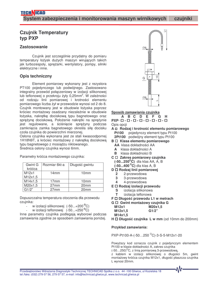 czujniki L1 System zabezpieczenia i monitorowania maszyn wirnikowych Czujnik Temperatury typ PXP Zastosowanie ∅6 Opis techniczny G Parametry kró ca monta owego czujnika: Gwint G kró ca M12x1 M12x1,5 M14x1,5 M20x1,5 G1/2” Rozmiar 6kt-a Długo gwintu 14mm 10mm 17mm 27mm 27mm 10mm 20mm 20mm Dopuszczalna temperatura otoczenia dla przewodu czujnika: - w izolacji silikonowej (-50...+200 OC) - w izolacji teflonowej (-50...+250 OC) Inne parametry czujnika podlegaj wyborowi podczas zamawiania zgodnie ze sposobem zamawiania poni ej. ∅6 L Element pomiarowy wykonany jest z rezystora PT100 pojedynczego lub podwójnego. Zastosowano integralny przewód poł czeniowy w izolacji silikonowej lub teflonowej o przekroju yły 0,25mm2. W zale no ci od rodzaju linii pomiarowej i krotno ci elementu pomiarowego liczba ył w przewodzie wynosi od 2 do 8. Czujnik montowany jest w obudowie ło yska poprzez króciec monta owy osadzany niezale nie w obudowie ło yska, nakr tk dociskow typu bagnetowego oraz spr yn dociskow . Poło enie nakr tki na spr ynie jest regulowane, a ci ni cie spr yny podczas zamkni cia zamka bagnetowego okre la sił docisku czoła czujnika do powierzchni mierzonej. Osłona czujnika wykonana jest ze stali kwasoodpornej 1H18N9T, a króciec monta owy z nakr tk dociskow typu bagnetowego z mosi dzu niklowanego. rednica osłony czujnika wynosi 6mm. 10 Czujnik jest szczególnie przydatny do pomiaru temperatury ło ysk du ych maszyn wiruj cych takich jak turbozespoły, spr arki, wentylatory, pompy, silniki elektryczne i inne. Sposób zamawiania czujnika A B C D E F G H PXP- - - - - - - Opis opcji A Rodzaj i krotno elementu pomiarowego Pt100 pojedynczy element typu Pt100 2Pt100 podwójny element typu Pt100 B Klasa elementu pomiarowego AA klasa dokładno ci AA A klasa dokładno ci A B klasa dokładno ci B C Zakres pomiarowy czujnika (-50...250OC) dla klas AA, A, B (-50...400 OC) dla klas A, B D Rodzaj linii pomiarowej 2 2-przewodowa 3 3-przewodowa 4 4-przewodowa E Rodzaj izolacji przewodu S izolacja silikonowa T izolacja teflonowa F Długo przewodu L1 w metrach G Gwint monta owy czujnika G M12x1 M20x1,5 M12x1,5 G1/2” M14x1,5 H Długo czujnika L w mm (od 10mm do 200mm) Przykład zamawiania: PXP-Pt100-A-(-50…250 OC)-3-S-5-M12x1-20 Powy szy kod oznacza czujnik z pojedynczym elementem Pt100 w klasie dokładno ci A, zakres czujnika (-50…250)OC, z lini pomiarow 3-przewodow , z kablem w izolacji silikonowej o długo ci 5m, gwint monta owy kró ca czujnika M12x1, długo płaszcza czujnika L wynosi 20mm. Przedsi biorstwo Wdra ania Diagnostyki Technicznej TECHNICAD Spółka z o.o. 44 -100 Gliwice, ul Kozielska 18 tel./faks: (032) 279 07 56, 279 07 57, e-mail: [email protected], www.technicad.gliwice.pl