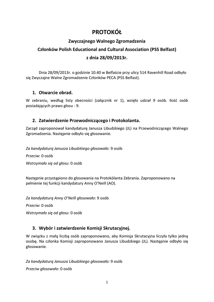 PROTOKÓŁ Zwyczajnego Walnego Zgromadzenia Członków Polish Educational and Cultural Association (PSS Belfast) z dnia 28/09/2013r. Dnia 28/09/2013r. o godzinie 10.40 w Belfaście przy ulicy 514 Ravenhill Road odbyło się Zwyczajne Walne Zgromadzenie Członków PECA (PSS Belfast). 1. Otwarcie obrad. W zebraniu, według listy obecności (załącznik nr 1), wzięło udział 9 osób. Ilość osób posiadających prawo głosu - 9. 2. Zatwierdzenie Przewodniczącego i Protokolanta. Zarząd zaproponował kandydaturę Janusza Libudzkiego (JL) na Przewodniczącego Walnego Zgromadzenia. Następnie odbyło się głosowanie. Za kandydaturą Janusza Libudzkiego głosowało: 9 osób Przeciw: 0 osób Wstrzymało się od głosu: 0 osób Następnie przystąpiono do glosowania na Protokólanta Zebrania. Zaproponowano na pełnienie tej funkcji kandydatury Anny O’Neill (AO). Za kandydaturą Anny O’Neill głosowało: 9 osób Przeciw: 0 osób Wstrzymało się od głosu: 0 osób 3. Wybór i zatwierdzenie Komisji Skrutacyjnej. W związku z małą liczbą osób zaproponowano, aby Komisja Skrutacyjna liczyła tylko jedną osobę. Na członka Komisji zaproponowano Janusza Libudzkiego (JL). Następnie odbyło się głosowanie. Za kandydaturą Janusza Libudzkiego głosowało: 9 osób Przeciw głosowało: 0 osób 1 Wstrzymało się od głosu: 0 osób UCHWAŁA NR 1 z dnia 28/09/13 Zwyczajnego Walnego Zgromadzenia Członków PECA Walne Zgromadzenie dla celów niniejszego posiedzenia powołało Janusza Libudzkiego do podliczania głosów w czasie zebrania. 4. Zatwierdzenie porządku Zebrania. Przewodniczący zebrania zapoznał uczestników z porządkiem obrad składającym się z następujących punktów: 1. Otwarcie Walnego Zgromadzenia. 2. Wybór Przewodniczącego i Protokolanta. 3. Wybór i zatwierdzenie Komisji Skrutacyjnej. 4. Zatwierdzenie porządku Zebrania. 5. Odczytanie protokołu z poprzedniego Walnego Zgromadzenia. 6. Przedstawienie sprawozdania Zarządu oraz raportu finansowego Stowarzyszenia. 7. Głosowanie nad absolutorium dla ustępującego Zarządu PECA (PSS Belfast). 8. Wybór nowych członków zarządu Stowarzyszenia. 9. Wolne głosy i wnioski. 10. Zamknięcie Zgromadzenia. Przystąpiono do głosowania nad agendą przedstawioną przez Przewodniczącego. Za przyjęciem agendy głosowało: 9 osób Przeciw głosowało: 0 osób Wstrzymało się od głosu: 0 osób UCHWAŁA NR 2 z dnia 28/09/13 Zwyczajnego Walnego Zgromadzenia Członków PECA Nadzwyczajne Walne Zgromadzenie zaakceptowało porządek obrad dla celów niniejszego posiedzenia. 5. Odczytanie protokołu z poprzedniego Walnego Zgromadzenia. Przewodniczący, przedstawił protokołu z ostatniego Walnego Zgromadzenia. Poinformował również, że oryginał protokołu jest dostępny do wglądu u Sekretarza PECA. 2 6. Przedstawienie sprawozdania Zarządu oraz raportu finansowego Stowarzyszenia. Przewodniczący odczytał sprawozdanie z działalności Zarządu za rok 2012/2013. Raport finansowy Stowarzyszenia za rok 2012/2013 został przedstawiony przez Monikę Turkiewicz. 7. Głosowanie nad absolutorium dla ustępującego Zarządu PECA (PSS Belfast). Przystąpiono do głosowania nad absolutorium. Za udzieleniem absolutorium głosowało: 9 osób Przeciw głosowało: 0 osób Wstrzymało się od głosu: 0 osób UCHWAŁA NR 3 z dnia 28/09/13 Zwyczajnego Walnego Zgromadzenia Członków PECA Zwyczajne Walne Zgromadzenie udzieliło absolutorium Zarządowi PECA za rok 2012/2013. W związku z tym Zarząd został rozwiązany i przystąpiono do wyborów nowego Zarządu PECA. Adnotacja O godzinie 12:10 zgromadzenie opuściła Beata Piotrkowska zmieniając stan obecnych i posiadających prawo głosu do 8 osób. 8. Wybór nowych członków zarządu Stowarzyszenia. Chęć pracy w Zarządzie PECA wyrazili: Katarzyna Garbal, Janusz Libudzki, Anna O’Neill. Przystąpiono do głosowania nad poszczególnymi kandydatami na Członków Zarządu. 3 Kandydat: Katarzyna Garbal Za przyjęciem kandydatury głosowało: 8 osób, przeciw: 0 osób, wstrzymało się: 0 osób. Kandydat: Janusz Libudzki Za przyjęciem kandydatury głosowało: 8 osób, przeciw: 0 osób, wstrzymało się: 0 osób. Kandydat: Anna O’Neill Za przyjęciem kandydatury głosowało: 8 osób, przeciw: 0 osób, wstrzymało się: 0 osób. UCHWAŁA NR 4 z dnia 28/09/13 Zwyczajnego Walnego Zgromadzenia Członków PECA Zwyczajne Walne Zgromadzenie wybrało do Zarządu Stowarzyszenia na lata 2013/14 następujące osoby: Katarzynę Garbal, Janusza Libudzkiego Annę O’Neill. Adnotacja Ze względu na niedostateczną ilość osób wyrażających zgodę na prace w Zarządzie, zaistniała konieczność rekrutacji nowych członków do Zarządu. 9. Wolne głosy i wnioski. W trakcie zebrania zgłoszono następujące tematy do dyskusji: Stwierdzono potrzebę przywrócenia sprawozdania rocznego Dyrektor PSS Belfast do porządku Zwyczajnego Walnego Zgromadzenia. Zaobserwowano konieczność uściślenia zakresu obowiązków Pani Dyrektor PSS w nowym kontrakcie z naciskiem na otrzymywanie tygodniowych raportów ( time sheets) i konieczności informowania o swoich zamierzeniach. Wycieczka do Gdańska – Poproszono o uściślenie wysokości stawki wynagrodzenia dla Pani Dyrektor w trakcie wycieczki . Stwierdzono ogólne małe zainteresowanie wycieczką (tylko ośmioro zainteresowanych uczniów). Omówiono propozycje przywrócenia Komisji rewizyjnej w formie zlecenia audytu przez organizacje z zewnątrz. 4 Omówiono potrzebę postepowania w celu ustalenia procedur Health & Safety i Access NI, oraz przeprowadzenia szkoleń First Aid dla nauczycieli i Zarządu. Odnotowano potrzebę umieszczenia Certyfikatu Ubezpieczenia PSS w widocznym miejscu na terenie szkoły. Omówiono wieloaspektowe relacje pomiędzy Personelem St. Michael’s Primary School a PSS. Skomentowano nieprofesjonalną postawę nauczyciela od wychowania fizycznego na zajęciach dodatkowych. Omówiono potrzebę wyznaczenia przedstawiciela do zorganizowania stanow