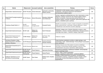 Lp. 1 Szkoła Zespół Szkół. Gastronomicznych Miejscowość nauczyciel opiekun dane uczestników Potrawy Ocena Agnieszka Leśniewska, Natalia Lipińska Podhalański comber jagnięcy podany na polencie z śliwką szydłowską, z pieczonymi kolorowymi marchewkami i karmelizowanym jabłkiem łąckim 185 Sylwia Milczewska Klaudiusz Gałkowski, Karol Bobkowski Comber z jagnięciny podhalańskiej sous vide, marynowany w winie głogowym, świeżym rozmarynie oraz młodych pędach świerku, podany na kaszotto z kaszy gryczanej palonej śliwowicą, ze świeżymi rydzami, żurawiną i oscypkiem, glazurowany jagnięcym pół glasem, z dodatkiem pudru z jarmużu 180 50-547 Wrocław Teresa Szewczak 2 Zespół Szkół Ponadgimnazjalnych 86-100 Świecie w Świeciu 3 Powiatowy Zespół Szkół nr 1 83-400 Kościerzyna Tomasz Grzegorzewski Krzysztof Konkol Roladki ze szczupaka z musem z karpia na kaszotto ze szpinakiem, łezką z pieczonej dyni i marchewki, chipsem jabłkowym i sosem truskawkowym oraz akcentem szczawiu zajęczego 177 4 Zespół Szkół Gastronomicznych, 90-357 Łódź Małgorzata Węglewska Kamil Piotrowski Galaretki z białego wina z Karpiem Zatorskim w piance z wiśni Nadwiślanki, z musem z bryndzy podhalańskiej, zielonego groszku z nutą mięty oraz musem z marchwi i mango z nutą imbiru 177 5 Zespół Szkół Gastronomiczno Spożywczych w Olsztynie 10-560 Olsztyn Małgorzata Marciniec Ida Popis, Piotr Kłosowski Cielęcina z rogożą 175 6 Technikum Żywienia i Usług Gastronomicznych w Złockiem z siedzibą w Muszynie 33-370 Muszyna Agnieszka Kmiecik Zuzanna Kmiecik, Klaudia Polańska Ciasto fasolowe przekładane konfiturą z jabłka łąckiego, suski sechlońskiej, miodu wielokwiatowego i miodu pitnego na puszystym sosie waniliowym 172 7 Zespół Szkół Gospodarczych w Rzeszowie 35-055 Rzeszów Beata Łuka Oskar Dąbrowski Delikatna Kaczka sous Vide podana na puree ze słodkiego ziemniaka w towarzystwie pasztetu gęsiego w otoczce z wiśni nadwiślańskich oraz puree z topinaburu i jabłka łąckiego 166 Zespół Szkół Gastronomicznych nr 1 Zespół Szkół Gastronomicznych nr 1 66-400 Gorzów Wielkopolski 66-400 Gorzów Wielkopolski Publiczne Technikum nr.2 im. Bronisława Koraszewskiego 45-867 Opole 8 9 10 Paweł Salamon Agnieszka Dymińska Paweł Salamon Maciej Pisarek Piotr Wasik Natalia Czech, Krystian Supron Aromatyczna przepiórka z pastewnym krokietem, winną kapustą i sosem z palonego masła "Pierny " jeleń z sosem sechlońskim podany z zapiekanym pasternakiem i prażonym jabłkiem Roladka z królika faszerowana oscypkiem i aromatyzowaną czwórniakiem żurawiną, z dodatkiem świeżych kopytek z liśćmi wiosennego mniszka lekarskiego pod kawowym ciastkiem cygaretkowym 164 163 163