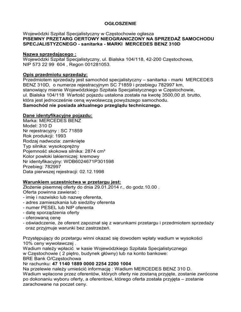 OGŁOSZENIE Wojewódzki Szpital Specjalistyczny w Częstochowie ogłasza PISEMNY PRZETARG OERTOWY NIEOGRANICZONY NA SPRZEDAś SAMOCHODU SPECJALISTYZCNEGO - sanitarka - MARKI MERCEDES BENZ 310D Nazwa sprzedającego : Wojewódzki Szpital Specjalistyczny, ul. Bialska 104/118, 42-200 Częstochowa, NIP 573 22 99 604 , Regon 001281053. Opis przedmiotu sprzedaŜy: Przedmiotem sprzedaŜy jest samochód specjalistyczny – sanitarka - marki MERCEDES BENZ 310D, o numerze rejestracyjnym SC 71859 i przebiegu 782997 km, stanowiący mienie Wojewódzkiego Szpitala Specjalistycznego w Częstochowie, ul. Bialska 104/118 Wartość pojazdu ustalona została na kwotę 3500,00 zł. brutto, która jest jednocześnie ceną wywoławczą powyŜszego samochodu. Samochód nie posiada aktualnego przeglądu technicznego. Dane identyfikacyjne pojazdu: Marka: MERCEDES BENZ Model: 310 D Nr rejestracyjny : SC 71859 Rok produkcji: 1993 Rodzaj nadwozia: zamknięte Typ silnika: wysokopręŜny Pojemność skokowa silnika: 2874 cm³ Kolor powłoki lakierniczej: kremowy Nr identyfikacyjny: WDB6024671P301598 Przebieg: 782997 Data pierwszej rejestracji: 02.12.1998 Warunkiem uczestnictwa w przetargu jest: ZłoŜenie pisemnej oferty do dnia 29.01.2014 r., do godz.10.00 . Oferta powinna zawierać : - imię i nazwisko lub nazwę oferenta, - adres zamieszkania lub siedziby oferenta - numer PESEL lub NIP oferenta - datę sporządzenia oferty - oferowaną cenę - oświadczenie, Ŝe oferent zapoznał się z warunkami przetargu i przedmiotem sprzedaŜy oraz przyjmuje warunki bez zastrzeŜeń. Przystępujący do przetargu winni okazać się dowodem wpłaty wadium w wysokości 10% ceny wywoławczej . Wadium naleŜy wpłacić w kasie Wojewódzkiego Szpitala Specjalistycznego w Częstochowie ( 2 piętro, budynek główny) lub na konto bankowe: BRE Bank O/Częstochowa Nr rachunku: 47 1140 1889 0000 2254 2200 1004 Na przelewie naleŜy umieścić informację : Wadium MERCEDES BENZ 310 D. Wadium wpłacone przez oferentów, których oferty nie zostaną przyjęte, zostanie zwrócone po dokonaniu wyboru oferty, a oferentowi, którego oferta została przyjęta – zostanie zarachowane na poczet ceny. Wadium przepada na rzecz sprzedawcy , jeŜeli oferent, którego oferta zostanie przyjęta uchyli się od zawarcia umowy. KaŜdy oferent moŜe złoŜyć tylko jedną ofertę. Oferty naleŜy składać w Kancelarii Wojewódzkiego Szpitala Specjalistycznego ul. Bialska 104/118 w Częstochowie, pawilon D II piętro (budynek główny), w zaklejonych kopertach z napisem: „Przetarg ofertowy nieograniczony na sprzedaŜ samochodu MERCEDES BENZ 310 D. ”. Pozostałe informacje : 1. Otwarcie ofert nastąpi w dniu 29.01.2014 roku o godz. 10.30 w sali nr 9 budynek P. 2. Samochód zostanie sprzedany za najwyŜszą zaoferowaną cenę. Odbiór samochodu następuje po wpłacie oferowanej kwoty. 3. W przypadku zaoferowania takiej samej ceny przez więcej niŜ jednego oferenta zostanie dodatkowo przeprowadzona licytacja ustna. 4. Wojewódzki Szpital Specjalistyczny w Częstochowie nie bierze odpowiedzialności za stan techniczny sprzedawanego w przetargu samochodu. 5. Oferty cenowe poniŜej ceny wywoławczej nie będą rozpatrywane. 6. Wszelkich informacji dotyczących sprzedawanego samochodu uzyskać moŜna w pok. nr 9 budynek P, w siedzibie Wojewódzkiego Szpitala Specjalistycznego w Częstochowie lub pod numerem telefonu 34 367 3421 / 3604. Zastrzega się, Ŝe przysługuje prawo zamknięcia przetargu bez wybrania którejkolwiek z ofert.