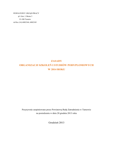 POWIATOWY URZĄD PRACY pl. Gen. J. Bema 3 33-100 Tarnów tel/fax (14) 6882344, 6882345 ZASADY ORGANIZACJI SZKOLEŃ I STUDIÓW PODYPLOMOWYCH W 2014 ROKU Pozytywnie zaopiniowane przez Powiatową Radę Zatrudnienia w Tarnowie na posiedzeniu w dniu 20 grudnia 2013 roku Grudzień 2013 ZASADY organizacji szkoleń i studiów podyplomowych w Powiatowym Urzędzie Pracy w Tarnowie w 2014 r. Organizacja szkoleń i studiów podyplomowych odbywa się na podstawie: 1. Ustawa z dnia 20 kwietnia 2004 r. o promocji zatrudnienia i instytucjach rynku pracy (Dz. U. z 2013 r. poz. 674, z późn. zm.). 2. Rozporządzenie Ministra Pracy i Polityki Społecznej z dnia 14 września 2010 r. w sprawie standardów i warunków prowadzenia usług rynku pracy (Dz. U. Nr 177, poz. 1193 z późn. zm.). 3. Niniejszych zasad. §1 SZKOLENIA I. Zasady ogólne. 1. Szkolenia organizowane są w celu podniesienia kwalifikacji zawodowych i innych kwalifikacji, zwiększających szanse na podjęcie lub utrzymanie zatrudnienia, innej pracy zarobkowej lub działalności gospodarczej, w szczególności w przypadku: 1) braku kwalifikacji zawodowych; 2) konieczności zmiany lub uzupełnienia kwalifikacji; 3) utraty zdolności do wykonywania pracy w dotychczas wykonywanym zawodzie; 4) braku umiejętności aktywnego poszukiwania pracy. 2. O skierowanie na szkolenie może ubiegać się: 1) osoba bezrobotna zarejestrowana w Urzędzie, 2) osoba poszukująca pracy zarejestrowana w Urzędzie, która: jest w okresie wypowiedzenia stosunku pracy lub stosunku służbowego z przyczyn dotyczących zakładu pracy, jest zatrudniona u pracodawcy, wobec którego ogłoszono upadłość lub który jest w stanie likwidacji, z wyłączeniem likwidacji w celu prywatyzacji, otrzymuje świadczenie socjalne przysługujące na urlopie górniczym lub górniczy zasiłek socjalny, określone w odrębnych przepisach, uczestniczy w zajęciach Centrum Integracji Społecznej lub indywidualnym programie integracji, o którym mowa w przepisach o pomocy społecznej, jest żołnierzem rezerwy, pobiera rentę szkoleniową, pobiera świadczenie szkoleniowe, podlega ubezpieczeniu społecznemu rolników w pełnym zakresie na podstawie przepisów o ubezpieczeniu społecznym rolników jako domownik lub małżonek rolnika, jeżeli zamierza podjąć zatrudnienie, inną pracę zarobkową lub działalność gospodarczą poza rolnictwem, jest pracownikiem oraz osobą wykonującą inną pracę zarobkową lub działalność gospodarczą w wieku 45 lat i powyżej, zainteresowaną pomocą w rozwoju zawodowym, po zarejestrowaniu się w urzędzie pracy. 3. Szkolenie odbywa się w formie kursu realizowanego według planu nauczania obejmującego przeciętnie nie mniej niż 25 godzin zegarowych w tygodniu, chyba że przepisy odrębne przewidują niższy wymiar szkolenia. Szkolenie może trwać do 6 miesięcy a w sytuacjach uzasadnionych programem szkolenia w danym zawodzie nie dłużej niż 12 miesięcy. W przypadku osób bez kwalifikacji zawodowych szkolenie może trwać do 12 miesięcy a w sytuacjach uzasadnionych programem szkolenia w danym zawodzie nie dłużej niż 24 miesiące. 4. W przypadku zawodów wymagających szczególnych predyspozycji psychofizycznych, skierowanie na szkolenie powinno być poprzedzone określeniem przez doradcę zawodowego predyspozycji do wykonywania zawodu a w uzasadnionych przypadkach szkolenie może być poprzedzone skierowaniem na badania lekarskie lub psychologiczne finansowane z Funduszu Pracy. 5. Skierowanie na szkolenie jest możliwe po złożeniu oświadczenie o nieuczestniczeniu w szkoleniu finansowanym ze środków Funduszu Pracy na podstawie skierowania z powiatowego urzędu pracy w okresie ostatnich 3 lat lub o udziale w takim szkoleniu w okresie ostatnich 3 lat i wskazaniu urzędu pracy, który wydał skierowanie, jeżeli łączna kwota środków na koszty szkolenia tej osoby nie przekracza dziesięciokrotności minimalnego wynagrodzenia za pracę na jedną osobę w okresie kolejnych 3 lat. 6. Warunkiem przyjęcia na szkolenie finansowane przez Urząd jest otrzymanie skierowania. 7. Osobie skierowanej na szkolenie w okresie jego odbywania przysługuje stypendium w wysokości 120 % zasiłku dla bezrobotnych jeżeli miesięczny wymiar godzin szkolenia wynosi co najmniej 150 godzin. W przypadku niższego miesięcznego wymiaru godzin szkolenia wysokość stypendium ustala się proporcjonalnie, z tym że stypendium nie może być niższe niż 20 % zasiłku dla bezrobotnych. Bezrobotnemu uprawnionemu w tym samym okresie do stypendium oraz zasiłku przysługuje prawo wyboru świadczenia. Stypendium nie przysługuje za dni nieusprawiedliwionej nieobecności na szkoleniu. Stypendium nie przysługuje osobie bezrobotnej, jeżeli w okresie odbywania szkolenia przysługuje jej z tego tytułu, inny rodzaj świadczenia pieniężnego w wysokości równej lub wyższej niż stypendium finansowane ze środków Funduszu Pracy. Bezrobotnemu, który w trakcie szkolenia podjął zatrudnienie, inną pracę zarobkową lub działalność gospodarczą przysługuje stypendium w wysokości 20 % zasiłku dla bezrobotnych niezależnie od wymiaru godzin szkolenia od dnia podjęcia zatrudnienia, innej pracy zarobkowej lub działalności gospodarczej do dnia zakończenia szkolenia. 8. Osoba skierowana na szkolenie w przypadku podjęcia zatrudnienia, innej pracy zarobkowej lub działalności gospodarczej w trakcie szkolenia ma prawo do ukończenia szkolenia bez konieczności ponoszenia jego kosztów. 9. Osoba skierowana na szkolenie może ubiegać się o zwrot kosztów dojazdu na szkolenie w przypadku gdy odbywa się ono poza miejscem zamieszkania. 10. Osoba, która z własnej winy nie ukończyła szkolenia, jest zobowiązana do zwrotu kosztów szkolenia chyba że przyczyną nieukończenia szkolenia jest podjęcie zatrudnienia, innej pracy zarobkowej lub działalności gospodarczej. 11. Osoba, która bez uzasadnionej przyczyny odmówi udziału w szkoleniu, z własnej winy przerwie