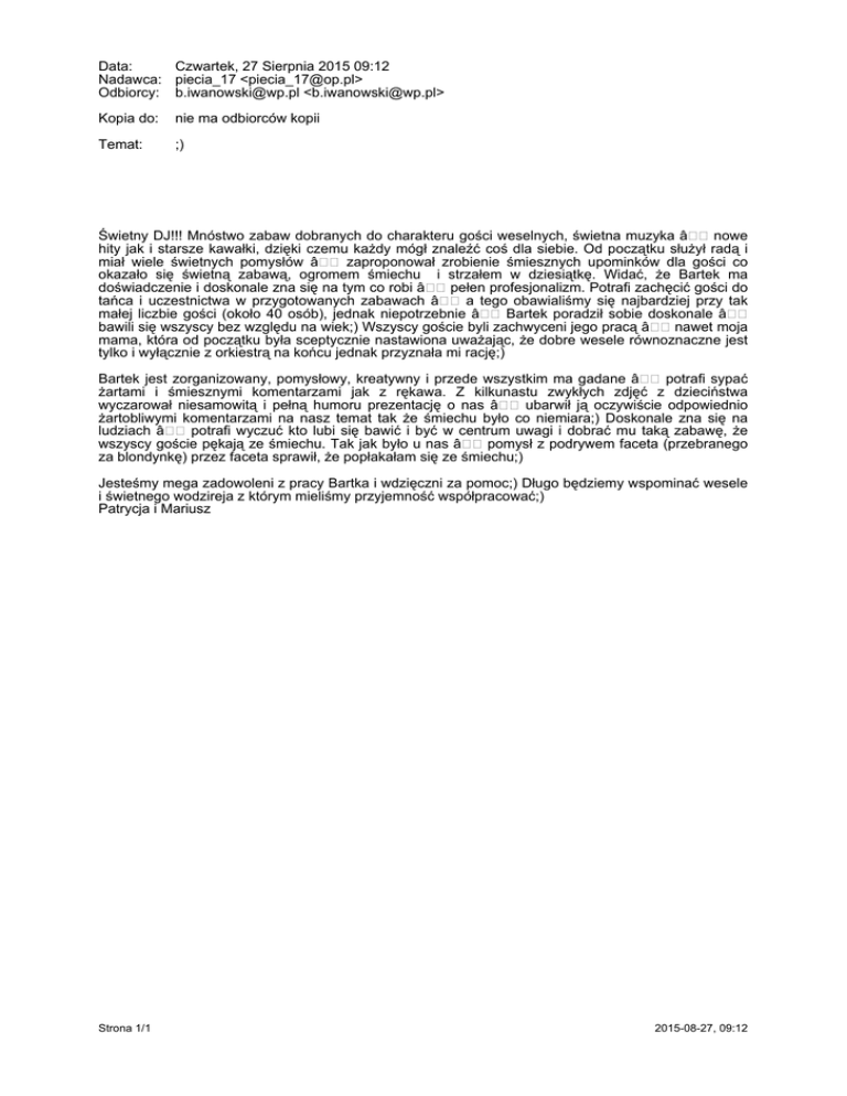 Data: Czwartek, 27 Sierpnia 2015 09:12 Nadawca: piecia_17 <[email protected]> Odbiorcy: [email protected] <[email protected]> Kopia do: nie ma odbiorców kopii Temat: ;) Świetny DJ!!! Mnóstwo zabaw dobranych do charakteru gości weselnych, świetna muzyka â nowe hity jak i starsze kawałki, dzięki czemu każdy mógł znaleźć coś dla siebie. Od początku służył radą i miał wiele świetnych pomysłów â zaproponował zrobienie śmiesznych upominków dla gości co okazało się świetną zabawą, ogromem śmiechu i strzałem w dziesiątkę. Widać, że Bartek ma doświadczenie i doskonale zna się na tym co robi â pełen profesjonalizm. Potrafi zachęcić gości do tańca i uczestnictwa w przygotowanych zabawach â a tego obawialiśmy się najbardziej przy tak małej liczbie gości (około 40 osób), jednak niepotrzebnie â Bartek poradził sobie doskonale â bawili się wszyscy bez względu na wiek;) Wszyscy goście byli zachwyceni jego pracą â nawet moja mama, która od początku była sceptycznie nastawiona uważając, że dobre wesele równoznaczne jest tylko i wyłącznie z orkiestrą na końcu jednak przyznała mi rację;) Bartek jest zorganizowany, pomysłowy, kreatywny i przede wszystkim ma gadane â potrafi sypać żartami i śmiesznymi komentarzami jak z rękawa. Z kilkunastu zwykłych zdjęć z dzieciństwa wyczarował niesamowitą i pełną humoru prezentację o nas â ubarwił ją oczywiście odpowiednio żartobliwymi komentarzami na nasz temat tak że śmiechu było co niemiara;) Doskonale zna się na ludziach â potrafi wyczuć kto lubi się bawić i być w centrum uwagi i dobrać mu taką zabawę, że wszyscy goście pękają ze śmiechu. Tak jak było u nas â pomysł z podrywem faceta (przebranego za blondynkę) przez faceta sprawił, że popłakałam się ze śmiechu;) Jesteśmy mega zadowoleni z pracy Bartka i wdzięczni za pomoc;) Długo będziemy wspominać wesele i świetnego wodzireja z którym mieliśmy przyjemność współpracować;) Patrycja i Mariusz Strona 1/1 2015-08-27, 09:12