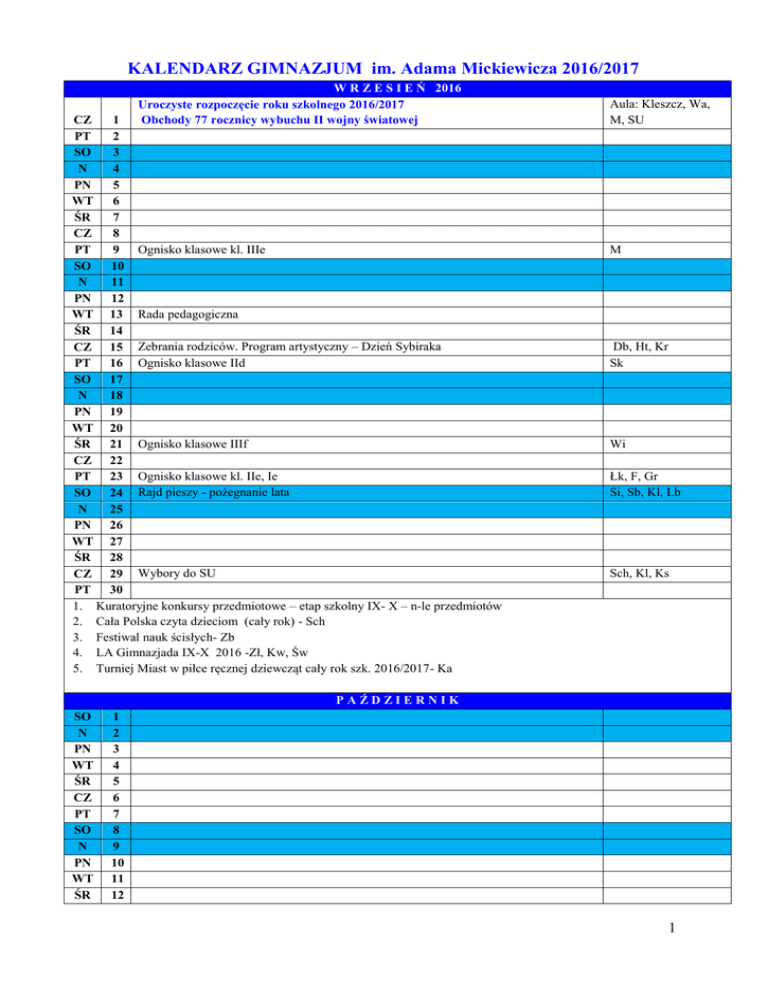 KALENDARZ GIMNAZJUM im. Adama Mickiewicza 2016/2017 W R Z E S I E Ń 2016 Uroczyste rozpoczęcie roku szkolnego 2016/2017 Obchody 77 rocznicy wybuchu II wojny światowej CZ 1 PT 2 SO 3 N 4 PN 5 WT 6 ŚR 7 CZ 8 PT 9 Ognisko klasowe kl. IIIe SO 10 N 11 PN 12 WT 13 Rada pedagogiczna ŚR 14 CZ 15 Zebrania rodziców. Program artystyczny – Dzień Sybiraka PT 16 Ognisko klasowe IId SO 17 N 18 PN 19 WT 20 ŚR 21 Ognisko klasowe IIIf CZ 22 PT 23 Ognisko klasowe kl. IIe, Ie SO 24 Rajd pieszy - pożegnanie lata N 25 PN 26 WT 27 ŚR 28 CZ 29 Wybory do SU PT 30 1. Kuratoryjne konkursy przedmiotowe – etap szkolny IX- X – n-le przedmiotów 2. Cała Polska czyta dzieciom (cały rok) - Sch 3. Festiwal nauk ścisłych- Zb 4. LA Gimnazjada IX-X 2016 -Zł, Kw, Św 5. Turniej Miast w piłce ręcznej dziewcząt cały rok szk. 2016/2017- Ka Aula: Kleszcz, Wa, M, SU M Db, Ht, Kr Sk Wi Łk, F, Gr Si, Sb, Kl, Lb Sch, Kl, Ks PAŹDZIERNIK SO N PN WT ŚR CZ PT SO N PN WT ŚR 1 2 3 4 5 6 7 8 9 10 11 12 1 CZ PT SO N PN WT ŚR CZ PT SO N PN WT ŚR CZ PT SO N PN 1. 2. 3. 4. 13 Dzień stroju galowego - spotkanie z nauczycielami 14 „Nauczycielom z okazji DEN” 15 16 17 18 Ślubowanie klas I , „otrzęsiny” 19 20 21 Informacja dla rodziców o ocenach (kartki z ocenami) 22 23 24 24-28.10 -Tydzień Krajów Niemieckojęzycznych 25 26 27 28 29 30 31 Dzień wolny od zajęć do odpracowania 5.11.2016 Międzynarodowy Miesiąc Bibliotek Szkolnych – Sch Eksperymenty fizyczno -chemiczne" -Si, Pr Warsztaty profilaktyczne "Stop dopalaczom i narkotykom" edukator z SANEPiDu Rozgrywki w piłkę nożną X-XI 2016 -Św Ht,Db ,W, n-le Wych. kl I, SU Wychow. klas n-le j. niem LISTOPAD WT ŚR CZ PT SO N PN WT ŚR CZ PT SO N PN WT ŚR CZ PT SO N PN WT ŚR CZ PT SO N 1 2 3 4 5 6 7 8 9 10 11 12 13 14 15 16 17 18 19 20 21 22 23 24 25 26 27 Wszystkich Świętych Rajd pieszy z okazji Dnia Niepodległości Si, Kl, Wa Dzień stroju galowego: Święto Niepodległości – akademia Narodowe Święto Niepodległości Polski - udział w akademii dla miasta T, Mc, Kr W Przegląd form profilaktycznych(wiersz, scenka) n-le poloniści Dzień otwarty w szkole -spotkania nauczycieli z rodzicami (godz. 15-16) Dyskoteka andrzejkowa I-III Konkurs szkolny z matematyki i fizyki "Jeden z dziesięciu" Sch, Kl, Ks Do, Pt 2 PN WT ŚR 1. 2. 3. 4. 28 29 30 Wycieczka kl. I do Pomorskiego Parku Naukowo- Technologicznego w Poznaniu Dzień patrona szkoły – czytanie dzieł A. Mickiewicza (XI – I.2017) –T, Mc, Kr, Ht, Wr Realizacja programu profilaktycznego XI.2016 -VI. 2017 - Si, Sb, Lb Konkurs na mistrza krzyżówek i łamigłówek -Jd Alfik matematyczny - Ku -B-H GRUDZIEŃ CZ PT SO N PN WT ŚR CZ PT SO N PN WT ŚR CZ PT SO N PN WT ŚR CZ PT SO N PN WT ŚR CZ PT SO 1 2 3 4 5 Wycieczka do Poczdamu 6 Mikołajki 7 Ogłoszenie konkursu na świąteczną kartkę, stroik, bombkę 8 9 10 11 12 13 14 15 Zebrania rodziców, kiermasz świąteczny, koncert bożonarodzeniowy- godz.16.30 16 17 18 19 20 21 22 23 Zimowa przerwa świąteczna 24 25 Święta Bożego Narodzenia 26 Święta Bożego Narodzenia 27 28 29 30 31 1. Mikołajkowy rajd pieszy - Si, Kl, Wa 2. Obrazkowy słownik językowy XII.2016- IV.2017- n-le języka niemieckiego S T Y C Z E Ń 2015 N 1 PN 2 WT 3 ŚR 4 Powiatowy konkurs wiedzy geograficznej "Jeden z dziesięciu" CZ 5 PT 6 Trzech Króli SO 7 N 8 PN 9 Gr, M, Mc Sch Sch, Kl, Ks Gu, W, SU, pol M, Łk, B-H 3 WT ŚR CZ PT SO N PN WT ŚR CZ PT SO N PN WT ŚR CZ PT SO N PN WT 10 Szkolny turniej wiedzy chemicznej dla klas II 11 Konkurs czytelniczy 12 Dyskoteka karnawałowa 13 14 15 16 17 18 19 Rada klasyfikacyjna 20 Koniec I semestru 21 22 23 24 25 26 Zebrania rodziców 27 28 29 30 31 1. Wyjazd do teatru (1x w semestrze) zespół j. polskiego 2. "Szóstka w rozumie" -Jd, Zb 3. I- II 2017 Powiatowe rozgrywki w grach zespołowych - piłka ręczna Ka-dz., Mł-ch, - piłka koszykowa M-dz, Si -ch - piłka siatkowa Zł (dz, ch) - unihokej Kw Si, Sb Sch, Sch, Kl, Ks LUTY ŚR CZ PT SO N PN WT ŚR CZ PT SO N PN WT ŚR CZ PT SO N PN WT 1 2 3 4 5 6 7 8 9 10 11 12 13 14 15 16 17 18 19 20 21 Rada pedagogiczna - podsumowanie pracy za I semestr Poczta Walentynkowa Sch, Kl, Ks Ferie zimowe 4 ŚR CZ PT SO N PN WT 22 23 24 25 26 27 28 ŚR CZ PT SO N PN WT ŚR CZ PT SO N PN WT ŚR CZ PT SO N PN WT ŚR CZ PT SO N PN WT ŚR CZ PT 1. 2. 3. 4. Zebrania rodziców uczniów klas III MARZEC 1 2 3 4 5 6 7 8 Konkurs Języka Polskiego dla uczniów klas terapeutycznych 9 10 11 12 13 14 Dzień nieedukacyjny: Targi Edukacyjne, konkurs wiedzy o UE dla SP 15 16 17 Informacja dla rodziców o ocenach (kartki z ocenami) 18 19 20 21 Dzień wiosny -pokaz talentów, „Światowy Dzień Wody” 22 Ogłoszenie konkursu na świąteczną kartkę, pisankę, palmę 23 24 25 Rajd pieszy "Powitanie wiosny" 26 27 28 29 30 31 Konkurs j. niem.: "Mistrz słówek", "Rozmówki niemieckie" - Łk Tydzień czystości wód -Si, Sb, Lb Kangur matematyczny - Do III-IV 2017 Rejonowe rozgrywki w grach zespołowych - piłka ręczna Ka-dz., Mł-ch, - piłka koszykowa M-dz, Si -ch - piłka siatkowa Zł (dz, ch) Mc, Kr, Ht Pt, Gr Wychow. klas SU, Lb, Si, Sb, Sch, Kl, Ks Si, Sb, Lb KWIECIEŃ SO N PN 1 2 3 5 WT ŚR CZ PT SO N PN WT ŚR CZ PT SO N PN WT ŚR CZ PT SO N PN WT ŚR CZ PT SO N 4 5 6 Kiermasz świąteczny 7 8 9 10 11 12 13 Przerwa wiosenna 14 15 16 17 18 19 Dzień nieedukacyjny: Egzamin gimnazjalny - cześć humanistyczna 20 Dzień nieedukacyjny: Egzamin gimnazjalny - cześć matematyczno – fizyczna 21 Dzień nieedukacyjny: Egzamin gimnazjalny - języki obce 22 23 24 25 Dyskoteka wiosenna 26 27 Obchody światowego Dnia Ziemi, Dzień otwarty w szkole (godz. 15-16) 28 Dzień stroju galowego: Konstytucja 3 Maja – znamy swoją historię. 29 30 1. Sudoku - Zb 2. Maks Mat -Ku Sch, Kl, Ks Sch, Kl, Ks n-le Db, Kr MAJ PN WT ŚR CZ PT SO N PN WT ŚR CZ PT SO N PN WT ŚR CZ PT SO N 1 2 3 4 5 6 7 8 9 10 11 12 13 14 15 16 17 18 19 20 21 Święto pracy Dzień wolny od zajęć do odpracowania 6.05.2017 (sobota) Rocznica uchwa