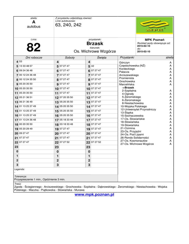 strefa: A autobus Z przystanku odjeżdżają również: Linie autobusowe: 63, 240, 242 Linia: 82 Dni robocze 4 53 5 13 33 48 57 6 09 24 36 48 7 00 12 24 36 48 8 00 12 24 35 50 9 05 20 35 50 10 05 20 35 50 11 05 20 35 50 12 05 21 36 51 13 06 21 36 49 14 01 13 25 37 49 15 01 13 25 37 49 16 01 13 25 37 49 17 01 13 24 36 48 18 00 20 35 50 19 05 20 29 49 20 09 27 47 21 07 27 47 22 07 27 47 23 0 1 2 3 MPK Poznań przystanek: Brzask Rozkład jazdy obowiązuje od: 2015-02-10 do: 2015-02-10 kierunek: Os. Wichrowe Wzgórze 4 5 6 7 8 9 10 11 12 13 14 15 16 17 18 19 20 21 22 23 0 1 2 3 Soboty 07 27 47 07 27 47 07 27 47 07 27 47 07 27 47 07 27 47 07 27 47 07 20 35 50 05 20 35 50 05 20 35 50 05 20 35 50 05 20 35 50 05 18 33 48 03 18 33 48 07 27 47 07 27 47 07 27 47 07 27 52 4 5 6 7 8 9 10 11 12 13 14 15 16 17 18 19 20 21 22 23 0 1 2 3 Święta 42 07 27 47 07 27 47 07 27 47 07 27 47 07 27 47 07 27 47 07 27 47 07 27 47 07 27 47 07 27 47 07 27 47 07 27 47 07 27 47 07 27 47 07 27 47 07 27 47 07 27 52 Przystanki strefa Górczyn Częstochowska (NŻ) Kordeckiego Palacza Arciszewskiego Promienista Grochowska Marcelińska →Brzask 2-Szpitalna 4-Ogrody 5-Żeromskiego 6-Żeromskiego 8-Niestachowska 10-Wojska Polskiego 12-Uniwersytet Przyrodniczy 13-Śląska 15-Sochaczewska 17-Os. Słowiańskie 18-Słowiańska 19-Słowiańska 21-Ozimina 23-Os. Przyjaźni 24-Os. Pod Lipami 26-Rondo Solidarności 27-Os. Kosmonautów 27-Os. Wichrowe Wzgórze Legenda: - Tolerancja: Przyspieszenie 1 min., Opóźnienie 3 min. Trasa: Zgoda - Ściegiennego - Arciszewskiego - Grochowska - Szpitalna - Dąbrowskiego - Żeromskiego - Niestachowska - Wojska Polskiego - Maczka - Piątkowska - Słowiańska - Murawa www.mpk.poznan.pl A A A A A A A A A A A A A A A A A A A A A A A A A A