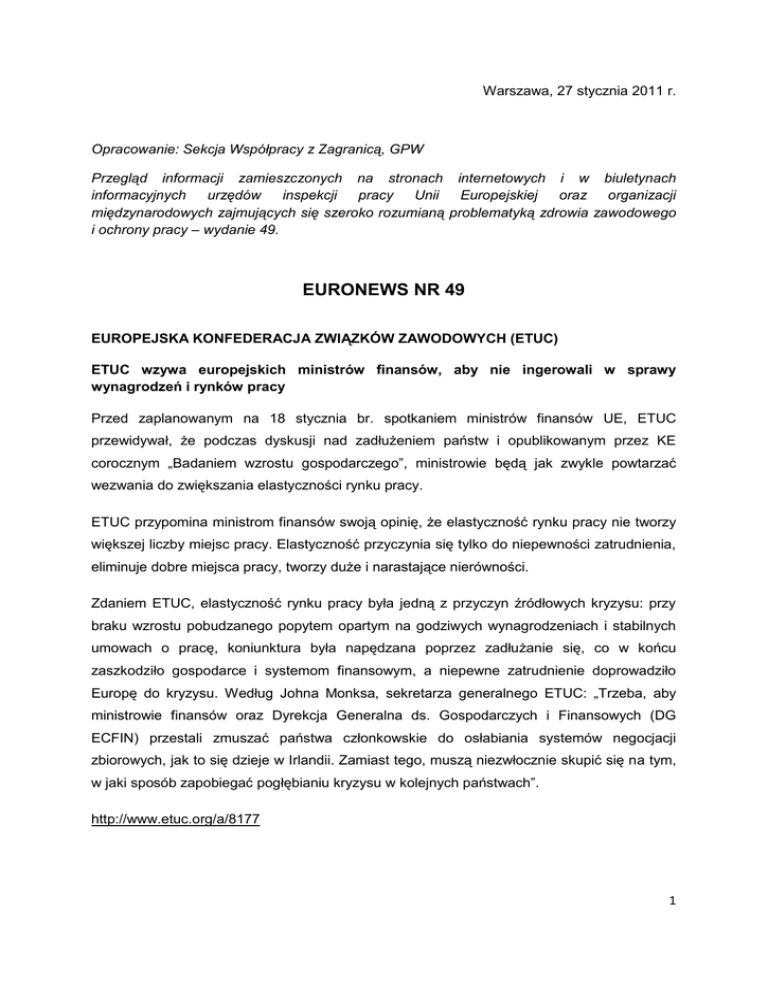 Warszawa, 27 stycznia 2011 r. Opracowanie: Sekcja Współpracy z Zagranicą, GPW Przegląd informacji zamieszczonych na stronach internetowych i w biuletynach informacyjnych urzędów inspekcji pracy Unii Europejskiej oraz organizacji międzynarodowych zajmujących się szeroko rozumianą problematyką zdrowia zawodowego i ochrony pracy – wydanie 49. EURONEWS NR 49 EUROPEJSKA KONFEDERACJA ZWIĄZKÓW ZAWODOWYCH (ETUC) ETUC wzywa europejskich ministrów finansów, aby nie ingerowali w sprawy wynagrodzeń i rynków pracy Przed zaplanowanym na 18 stycznia br. spotkaniem ministrów finansów UE, ETUC przewidywał, że podczas dyskusji nad zadłużeniem państw i opublikowanym przez KE corocznym „Badaniem wzrostu gospodarczego”, ministrowie będą jak zwykle powtarzać wezwania do zwiększania elastyczności rynku pracy. ETUC przypomina ministrom finansów swoją opinię, że elastyczność rynku pracy nie tworzy większej liczby miejsc pracy. Elastyczność przyczynia się tylko do niepewności zatrudnienia, eliminuje dobre miejsca pracy, tworzy duże i narastające nierówności. Zdaniem ETUC, elastyczność rynku pracy była jedną z przyczyn źródłowych kryzysu: przy braku wzrostu pobudzanego popytem opartym na godziwych wynagrodzeniach i stabilnych umowach o pracę, koniunktura była napędzana poprzez zadłużanie się, co w końcu zaszkodziło gospodarce i systemom finansowym, a niepewne zatrudnienie doprowadziło Europę do kryzysu. Według Johna Monksa, sekretarza generalnego ETUC: „Trzeba, aby ministrowie finansów oraz Dyrekcja Generalna ds. Gospodarczych i Finansowych (DG ECFIN) przestali zmuszać państwa członkowskie do osłabiania systemów negocjacji zbiorowych, jak to się dzieje w Irlandii. Zamiast tego, muszą niezwłocznie skupić się na tym, w jaki sposób zapobiegać pogłębianiu kryzysu w kolejnych państwach”. http://www.etuc.org/a/8177 1 MIĘDZYNARODOWA ORGANIZACJA PRACY Globalne trendy zatrudnienia 2011 W opublikowanym 24 stycznia br. raporcie „Globalne trendy zatrudnienia 2011”, MOP prognozuje, że w bieżącym roku wzrost liczby miejsc pracy nadal będzie niewielki, szczególnie w krajach rozwiniętych, a priorytetem pozostanie wzrost zatrudnienia wśród ludzi młodych. Oficjalna liczba bezrobotnych na świecie w 2010 r. wynosiła 205 milionów (w tym 78 milionów osób młodych), czyli zasadniczo nie zmieniła się od roku 2009, i była o 27,6 milionów wyższa niż przed kryzysem ekonomicznym, trwającym od 2007 roku. W Europie Środkowej i Południowo-Wschodniej, najwyższe bezrobocie 10,4% zanotowano w 2009 roku (co oznaczało najwyższy wskaźnik regionalny na świecie), a w 2010 r. obniżyło się do poziomu 9,6%. W 2009 roku wzrosło globalne zatrudnienie w rolnictwie, ponieważ sektor ten charakteryzuje się niższą wydajnością i służy on jako bufor dla osób tracących pracę w przemyśle i usługach. http://www.ilo.org/global/about-the-ilo/press-and-media-centre/pressreleases/WCMS_150581/lang--en/index.htm ESTONIA Związki za podatkiem progresywnym i zwiększeniem świadczeń socjalnych W listopadzie 2011 r., związki zawodowe złożyły w estońskim parlamencie swoje propozycje zmian przepisów w zakresie zatrudnienia i stosunków pracy, wynagrodzeń, ubezpieczeń społecznych oraz podatków. Przedstawiony przez stronę pracowniczą projekt wprowadzenia dochodowego podatku progresywnego spotkał się z silnym sprzeciwem pracodawców. Natomiast organizacje pracodawców wyraziły gotowość do rozmów nt. większości pozostałych postulatów m.in. podniesienia płacy minimalnej (do 60% średniego wynagrodzenia), ubezpieczeń od wypadków przy pracy, chorób zawodowych oraz zwiększenia świadczeń socjalnych. http://www.eurofound.europa.eu/eiro/2010/12/articles/ee1012019i.htm 2 HISZPANIA Bezpieczeństwo na drogach Podległa Kongresowi Deputowanych komisja zajmująca się kwestiami związanymi z bezpieczeństwem drogowym, wystąpiła z wnioskiem do Rządu o zwiększenie działań nastawionych na promocję wśród przedsiębiorców planowania obejmującego kwestie bezpieczeństwa na drodze, jako środka prewencyjnego w odniesieniu do wypadków drogowych występujących w trakcie godzin pracy, jak również wypadków, które mają miejsce podczas przemieszczania się pomiędzy domem a miejscem pracy. W ramach propozycji niższej Izby Parlamentu, wszystkie grupy zgodziły się skierować prośbę do Rządu, aby w okresie najbliższego roku wypromowana została kampania informacyjna mająca na celu podniesienie świadomości pracodawców i pracowników na temat zagrożeń wynikających z poruszania się na drogach w trakcie i po godzinach pracy. Rząd zachęcany jest również do podjęcia kroków prowadzących do włączenia tematyki bezpieczeństwa na drogach do zagadnień z zakresu prewencji ryzyka wewnątrz organów administracji publicznej, jak również włączenia pozycji zatytułowanej „edukacja drogowa” do planów szkoleń ustawicznych i zawodowych pracowników, którzy na co dzień wykonują prace związane z prowadzeniem pojazdów. W celu przeprowadzenia tego typu inicjatyw związanych z bezpieczeństwem i zdrowiem w pracy, Komisja zakłada dokonanie pewnych modyfikacji w Ustawie o Prewencji Ryzyka Zawodowego i w Statucie Pracowników. http://www.lineaprevencion.com/ESP/44/Pages/Web/Actualidad/Noticia375El_Congreso_soli cita_al_Gobierno_que_incentive_planes_de_seguridad_vial_en_las_empresas_para_preven ir_accidentes_laborales_.aspx Prewencja w szkołach Autonomiczny Rząd (Junta) Andaluzji wydał publikację o charakterze dydaktycznym, poświęconą prewencji ryzyka zawodowego w jednostkach oświatowych. Publikacja ta wpisuje się w program „Naucz się dorastać w bezpieczeństwie”, w ramach którego promuje się kulturę prewencyjną wśród uczniów. Przedstawiciele andaluzyjskich ministerstw Zatrudnienia i Edukacji zaprezentowali w dniu 17 stycznia br. podręcznik dydaktyczny, wydany przez Rząd Andaluzji z myślą