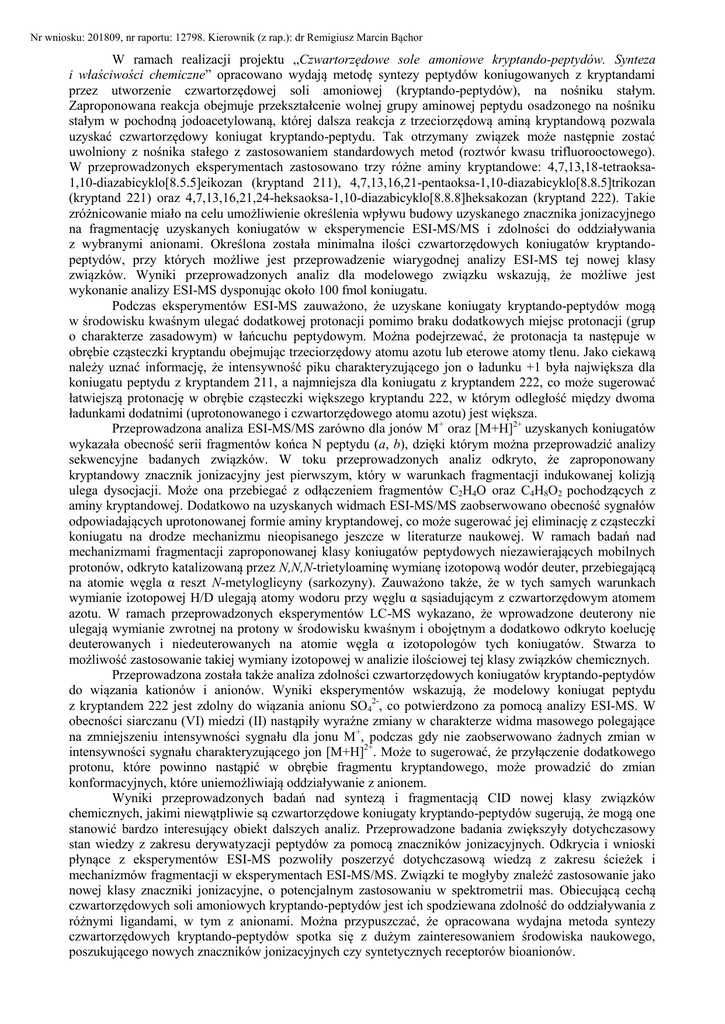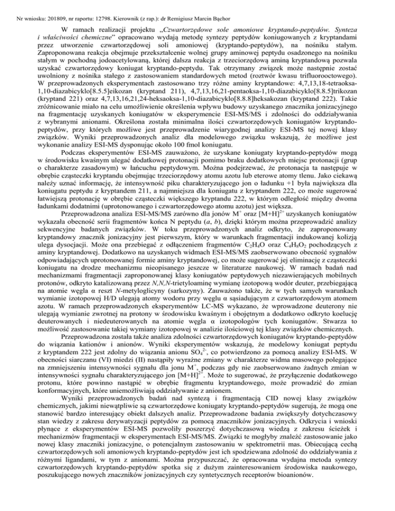Nr wniosku: 201809, nr raportu: 12798. Kierownik (z rap.): dr Remigiusz Marcin Bąchor W ramach realizacji projektu „Czwartorzędowe sole amoniowe kryptando-peptydów. Synteza i właściwości chemiczne” opracowano wydają metodę syntezy peptydów koniugowanych z kryptandami przez utworzenie czwartorzędowej soli amoniowej (kryptando-peptydów), na nośniku stałym. Zaproponowana reakcja obejmuje przekształcenie wolnej grupy aminowej peptydu osadzonego na nośniku stałym w pochodną jodoacetylowaną, której dalsza reakcja z trzeciorzędową aminą kryptandową pozwala uzyskać czwartorzędowy koniugat kryptando-peptydu. Tak otrzymany związek może następnie zostać uwolniony z nośnika stałego z zastosowaniem standardowych metod (roztwór kwasu trifluorooctowego). W przeprowadzonych eksperymentach zastosowano trzy różne aminy kryptandowe: 4,7,13,18-tetraoksa1,10-diazabicyklo[8.5.5]eikozan (kryptand 211), 4,7,13,16,21-pentaoksa-1,10-diazabicyklo[8.8.5]trikozan (kryptand 221) oraz 4,7,13,16,21,24-heksaoksa-1,10-diazabicyklo[8.8.8]heksakozan (kryptand 222). Takie zróżnicowanie miało na celu umożliwienie określenia wpływu budowy uzyskanego znacznika jonizacyjnego na fragmentację uzyskanych koniugatów w eksperymencie ESI-MS/MS i zdolności do oddziaływania z wybranymi anionami. Określona została minimalna ilości czwartorzędowych koniugatów kryptandopeptydów, przy których możliwe jest przeprowadzenie wiarygodnej analizy ESI-MS tej nowej klasy związków. Wyniki przeprowadzonych analiz dla modelowego związku wskazują, że możliwe jest wykonanie analizy ESI-MS dysponując około 100 fmol koniugatu. Podczas eksperymentów ESI-MS zauważono, że uzyskane koniugaty kryptando-peptydów mogą w środowisku kwaśnym ulegać dodatkowej protonacji pomimo braku dodatkowych miejsc protonacji (grup o charakterze zasadowym) w łańcuchu peptydowym. Można podejrzewać, że protonacja ta następuje w obrębie cząsteczki kryptandu obejmując trzeciorzędowy atomu azotu lub eterowe atomy tlenu. Jako ciekawą należy uznać informację, że intensywność piku charakteryzującego jon o ładunku +1 była największa dla koniugatu peptydu z kryptandem 211, a najmniejsza dla koniugatu z kryptandem 222, co może sugerować łatwiejszą protonację w obrębie cząsteczki większego kryptandu 222, w którym odległość między dwoma ładunkami dodatnimi (uprotonowanego i czwartorzędowego atomu azotu) jest większa. Przeprowadzona analiza ESI-MS/MS zarówno dla jonów M+ oraz [M+H]2+ uzyskanych koniugatów wykazała obecność serii fragmentów końca N peptydu (a, b), dzięki którym można przeprowadzić analizy sekwencyjne badanych związków. W toku przeprowadzonych analiz odkryto, że zaproponowany kryptandowy znacznik jonizacyjny jest pierwszym, który w warunkach fragmentacji indukowanej kolizją ulega dysocjacji. Może ona przebiegać z odłączeniem fragmentów C2H4O oraz C4H8O2 pochodzących z aminy kryptandowej. Dodatkowo na uzyskanych widmach ESI-MS/MS zaobserwowano obecność sygnałów odpowiadających uprotonowanej formie aminy kryptandowej, co może sugerować jej eliminację z cząsteczki koniugatu na drodze mechanizmu nieopisanego jeszcze w literaturze naukowej. W ramach badań nad mechanizmami fragmentacji zaproponowanej klasy koniugatów peptydowych niezawierających mobilnych protonów, odkryto katalizowaną przez N,N,N-trietyloaminę wymianę izotopową wodór deuter, przebiegającą na atomie węgla α reszt N-metyloglicyny (sarkozyny). Zauważono także, że w tych samych warunkach wymianie izotopowej H/D ulegają atomy wodoru przy węglu α sąsiadującym z czwartorzędowym atomem azotu. W ramach przeprowadzonych eksperymentów LC-MS wykazano, że wprowadzone deuterony nie ulegają wymianie zwrotnej na protony w środowisku kwaśnym i obojętnym a dodatkowo odkryto koelucję deuterowanych i niedeuterowanych na atomie węgla α izotopologów tych koniugatów. Stwarza to możliwość zastosowanie takiej wymiany izotopowej w analizie ilościowej tej klasy związków chemicznych. Przeprowadzona została także analiza zdolności czwartorzędowych koniugatów kryptando-peptydów do wiązania kationów i anionów. Wyniki eksperymentów wskazują, że modelowy koniugat peptydu z kryptandem 222 jest zdolny do wiązania anionu SO42-, co potwierdzono za pomocą analizy ESI-MS. W obecności siarczanu (VI) miedzi (II) nastąpiły wyraźne zmiany w charakterze widma masowego polegające na zmniejszeniu intensywności sygnału dla jonu M+, podczas gdy nie zaobserwowano żadnych zmian w intensywności sygnału charakteryzującego jon [M+H]2+. Może to sugerować, że przyłączenie dodatkowego protonu, które powinno nastąpić w obrębie fragmentu kryptandowego, może prowadzić do zmian konformacyjnych, które uniemożliwiają oddziaływanie z anionem. Wyniki przeprowadzonych badań nad syntezą i fragmentacją CID nowej klasy związków chemicznych, jakimi niewątpliwie są czwartorzędowe koniugaty kryptando-peptydów sugerują, że mogą one stanowić bardzo interesujący obiekt dalszych analiz. Przeprowadzone badania zwiększyły dotychczasowy stan wiedzy z zakresu derywatyzacji peptydów za pomocą znaczników jonizacyjnych. Odkrycia i wnioski płynące z eksperymentów ESI-MS pozwoliły poszerzyć dotychczasową wiedzą z zakresu ścieżek i mechanizmów fragmentacji w eksperymentach ESI-MS/MS. Związki te mogłyby znaleźć zastosowanie jako nowej klasy znaczniki jonizacyjne, o potencjalnym zastosowaniu w spektrometrii mas. Obiecującą cechą czwartorzędowych soli amoniowych kryptando-peptydów jest ich spodziewana zdolność do oddziaływania z różnymi ligandami, w tym z anionami. Można przypuszczać, że opracowana wydajna metoda syntezy czwartorzędowych kryptando-peptydów spotka się z dużym zainteresowaniem środowiska naukowego, poszukującego nowych znaczników jonizacyjnych czy syntetycznych receptorów bioanionów.