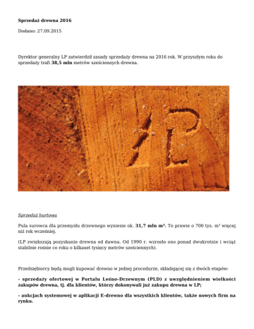 Sprzedaż drewna 2016 Dodano: 27.09.2015 Dyrektor generalny LP zatwierdził zasady sprzedaży drewna na 2016 rok. W przyszłym roku do sprzedaży trafi 38,5 mln metrów sześciennych drewna. Sprzedaż hurtowa Pula surowca dla przemysłu drzewnego wyniesie ok. 31,7 mln m³. To prawie o 700 tys. m³ więcej niż rok wcześniej. (LP zwiększają pozyskanie drewna od dawna. Od 1990 r. wzrosło ono ponad dwukrotnie i wciąż stabilnie rośnie co roku o kilkaset tysięcy metrów sześciennych). Przedsiębiorcy będą mogli kupować drewno w jednej procedurze, składającej się z dwóch etapów: - sprzedaży ofertowej w Portalu Leśno-Drzewnym (PLD) z uwzględnieniem wielkości zakupów drewna, tj. dla klientów, którzy dokonywali już zakupu drewna w LP; - aukcjach systemowej w aplikacji E-drewno dla wszystkich klientów, także nowych firm na rynku. Na podstawie wyników obydwu procedur zostanie zawarta jedna roczna umowa sprzedaży. Przedsiębiorcom uprawnionym do udziału w procedurze sprzedaży ofertowej w Portalu Leśno-Drzewnym, Lasy Państwowe oferują surowiec z uwzględnieniem wielkości zakupu drewna (nie będą licytowali ceny). Nowością jest zastąpienie dotychczasowej umowy dwuletniej uprawnieniem do przypisu drewna na kolejny 2017 rok. Przedsiębiorca, który zakupi drewno w PLD w 2016 roku, będzie miał prawo do uzyskania przypisu drewna na 2017 rok w tej samej ilości i grupie handlowo-gatunkowej, co w 2016 roku. Skorzystanie ze sprzedaży ofertowej umożliwi firmie nabycie w PLD drewna w ilości do 70% średniej jej zakupów z ostatnich dwóch lat (dotychczas - z trzech lat). Klienci portalu nadal będą składać oferty jedynie na ilość zamawianego surowca. Oferty przedsiębiorców mogą podlegać proporcjonalnej redukcji w przypadku, jeżeli w określonej jednostce organizacyjnej LP na daną grupę handlowo-gatunkową drewna będzie większy popyt niż ilość dostępnego surowca. Podobnie jak w ubiegłych latach, będzie prowadzona również sprzedaż ofertowa dla przedsiębiorców, którzy rozwijają działalność i zwiększają moce przerobowe (niezależnie od tego, czy dokonywały zakupów w poprzednim okresie). Skorzystać z tej możliwości będą mogły podmioty, które potwierdziły dokonanie inwestycji w okresie od 01.01.2014 roku do 30.06.2016 roku i przedstawiły określone przez LP dokumenty. Przedsiębiorca, którego wniosek zostanie ostatecznie zaakceptowany przez dyrektora generalnego LP weźmie udział w dwóch rocznych procedurach sprzedaży drewna w latach 2016 i 2017. Ceny ofertowe zostały ustalone przez dyrektorów RDLP w porozumieniu z nadleśniczymi. Starano się wyrównać ceny w ramach nadleśnictw poszczególnych RDLP. W procedurze ofertowej (wg wielkości zakupu), nastąpi podwyżka cen od 3% do 8%. To pierwszy wzrost od kilku lat. Systemowe aukcje internetowe w aplikacji E-drewno będą odbywały się nadal co pół roku. Oferowana przez nabywcę cena będzie tu jedynym kryterium. Ceny w procedurze E-drewno (mogą brać w nich udział wszyscy nabywcy), pozostawione zostały na poziomie przyjętym w 2014 roku (ceny są z II półrocza z 2012 roku pomniejszone o 5%). Oznacza to, że ceny minimalne w aukcjach internetowych będą o ok. 8% niższe od cen w sprzedaży ofertowej. Tak jak w poprzednich latach, w 2016 roku, bez względu na umowny termin płatności, w przypadku przedpłaty bądź zapłaty należności w terminie do 14 dni od wystawienia faktury, udzielane będzie skonto w wysokości 1,5%. Sprzedaż detaliczna Wspomniane wyżej procedury dotyczą sprzedaży hurtowej surowca dla przemysłu. Tak samo jak w latach poprzednich, na odrębnych zasadach będzie odbywała się detaliczna sprzedaż drewna na opał (cennik ustala każdy nadleśniczy). Pula drewna dla odbiorców detalicznych wyniesie 6,2 mln m3. Zakupy odbywają się bezpośrednio w nadleśnictwie. Źródło: lasy.gov.pl Zdjęcie: KG Komentarze (0) Nie dodano jeszcze żadnego komentarza.