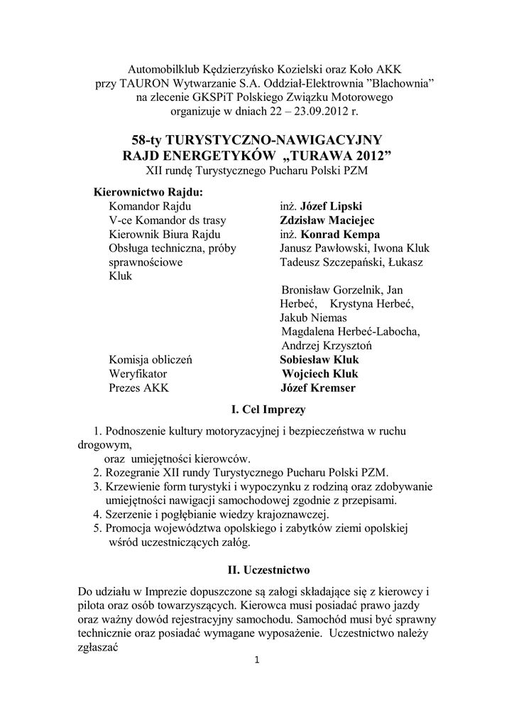 Automobilklub Kędzierzyńsko Kozielski oraz Koło AKK przy TAURON Wytwarzanie S.A. Oddział-Elektrownia ”Blachownia” na zlecenie GKSPiT Polskiego Związku Motorowego organizuje w dniach 22 – 23.09.2012 r. 58-ty TURYSTYCZNO-NAWIGACYJNY RAJD ENERGETYKÓW „TURAWA 2012” XII rundę Turystycznego Pucharu Polski PZM Kierownictwo Rajdu: Komandor Rajdu V-ce Komandor ds trasy Kierownik Biura Rajdu Obsługa techniczna, próby sprawnościowe Kluk inż. Józef Lipski Zdzisław Maciejec inż. Konrad Kempa Janusz Pawłowski, Iwona Kluk Tadeusz Szczepański, Łukasz Bronisław Gorzelnik, Jan Herbeć, Krystyna Herbeć, Jakub Niemas Magdalena Herbeć-Labocha, Andrzej Krzysztoń Sobiesław Kluk Wojciech Kluk Józef Kremser Komisja obliczeń Weryfikator Prezes AKK I. Cel Imprezy 1. Podnoszenie kultury motoryzacyjnej i bezpieczeństwa w ruchu drogowym, oraz umiejętności kierowców. 2. Rozegranie XII rundy Turystycznego Pucharu Polski PZM. 3. Krzewienie form turystyki i wypoczynku z rodziną oraz zdobywanie umiejętności nawigacji samochodowej zgodnie z przepisami. 4. Szerzenie i pogłębianie wiedzy krajoznawczej. 5. Promocja województwa opolskiego i zabytków ziemi opolskiej wśród uczestniczących załóg. II. Uczestnictwo Do udziału w Imprezie dopuszczone są załogi składające się z kierowcy i pilota oraz osób towarzyszących. Kierowca musi posiadać prawo jazdy oraz ważny dowód rejestracyjny samochodu. Samochód musi być sprawny technicznie oraz posiadać wymagane wyposażenie. Uczestnictwo należy zgłaszać 1 do 10 września 2012 r. Zgłoszenia przyjmuje kol. Józef Lipski nr tel. 77 4832656, 783163162 oraz Zdzisław Maciejec nr tel. 605685818, ODPŁATNOŚĆ: Startowe: 20 zł od załogi - obiad 20 zł. od osoby - ognisko 30 zł od osoby W ramach wpisowego załogi otrzymują: materiały rajdowe Pełne koszty uczestnictwa: * osoby dorosłe * dzieci 150 zł 100 zł * członkowie AKK 20 zł zniżki od załogi (kierowca-pilot) W ramach pełnej opłaty organizatorzy zapewniają wyżywienie, zakwaterowanie i nocleg w OW Borowik, Zielony Pensjonat oraz Kormoran, całonocną zabawę taneczną wraz z konsumpcją, ognisko – kolację z bogatym grilem, dyskotekę dla dzieci, i inne atrakcje i niespodzianki z nagrodami. III. Punktacja i nagrody Zgodnie z Regulaminem Turystycznego Pucharu Polski PZM 2012. Dla najlepszych załóg przewidziane są puchary i dyplomy oddzielnie dla kierowcy i pilota oraz atrakcyjne nagrody rzeczowe. IV. Odpowiedzialność Organizator nie przyjmuje na siebie odpowiedzialności za szkody i straty w stosunku do poszczególnych uczestników rajdu ich sprzętu oraz za spowodowane przez uczestników pośrednie i bezpośrednie szkody i straty w stosunku do osób trzecich i ich mienia. Organizator ubezpiecza dodatkowo uczestników imprezy Turystyczno Nawigacyjnej Energetyków TURAWA 2012 z tytułu NW (następstw nieszczęśliwych wypadków). Organizator wykupi polisę Ubezpieczenia Odpowiedzialności Cywilnej w związku z organizacją imprezy. Rajd jest imprezą turystyczną odbywającą się przy normalnym ruchu drogowym, bez jakich kolwiek wyłączeń. Zawodnicy bezwzględnie zobowiązani są do przestrzegania obowiązujących w Polsce przepisów o 2 ruchu drogowym i zasad bezpiecznej jazdy. V. Postanowienia końcowe 1. W czasie rajdu uczestnicy zobowiązani są do całkowitego podporządkowania się przepisom niniejszego regulaminu i wszelkim dodatkowym poleceniom i zarządzeniom organizatora. 2. Ostateczna interpretacja niniejszego regulaminu należy do władz rajdu. VI. Program rajdu i pobytu w OW Borowik, Zielony Pensjonat oraz Kormoran w Turawie ul. Biwakowa Sobota dnia 22.09.2012 r. Przyjmowanie uczestników rajdu, badanie regulaminowe (Przy Krytej Pływalni w K-Koźlu ul. Jana Pawła II). 9.15 Uroczyste otwarcie imprezy i odprawa załóg. 9.45 Start pierwszej załogi na trasę rajdu (dwa etapy o łącznej długości ok. 90 km oraz 2 próby jazdy sprawnościowej samochodem, test z dziedziny bezpieczeństwa ruchu drogowego i pomocy przedmedycznej oraz test krajoznawczy) 13.00 Planowany przyjazd pierwszej załogi na metę rajdu i zakwaterowanie 13.30 – 15.00 Obiad 16.30 - 19.30 Ognisko – kolacja: bogaty grill – (kiełbasa, krupniok, podudzie, smalec, ogórek kiszony, warzywa, pieczywo, herbata i piwo), konkursy, gry i zabawy, ogłoszenie wyników prowizorycznych. 19.00 Wręczenie nagród w klasyfikacji Pucharu Polski PZM. 20.00 – 21.30 dyskoteka dla dzieci. 20.00 – 3.00 Zabawa taneczna z konsumpcją przy orkiestrze. 8.30 – 9.00 Niedziela dnia 23.09.2012 r. 9.00- 10.00 10.00–13.00 13.00-14.00 14.30 15.00 Śniadanie Czas wolny, zwiedzanie okolicy Obiad Ogłoszenie wyników oficjalnych. Zakończenie imprezy Wyjazd z Obiektu. 3 Organizator życzy sportowej rywalizacji, miłej atmosfery i wielu wrażeń. REGULAMIN 58-go TurystycznoNawigacyjnego Rajdu Energetyków 4 TURAWA 2012 5 22-23 WRZEŚNIA 2012r Kędzierzyn-Koźle 21.08.2012 6