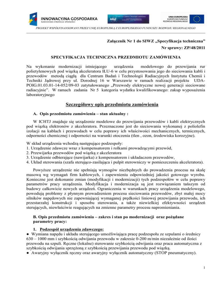 PROJEKT WSPÓŁFINANSOWANY PRZEZ UNIĘ EUROPEJSKĄ Z EUROPEJSKIEGO FUNDUSZU ROZWOJU REGIONALNEGO Załącznik Nr 1 do SIWZ „Specyfikacja techniczna” Nr sprawy: ZP/48/2011 SPECYFIKACJA TECHNICZNA PRZEDMIOTU ZAMÓWIENIA Na wykonanie modernizacji istniejącego urządzenia modelowego do przewijania rur polietylenowych pod wiązką akceleratora IŁU-6 w celu przystosowania jego do sieciowania kabli i przewodów metodą ciągłą dla Centrum Badań i Technologii Radiacyjnych Instytutu Chemii i Techniki Jądrowej przy ul. Dorodnej 16 w Warszawie w ramach realizacji projektu UDAPOIG.01.03.01-14-052/09-03 zatytułowanego „Przewody elektryczne nowej generacji sieciowane radiacyjnie”. W ramach zadania Nr 5 kategoria wydatku kwalifikowanego: zakup wyposażenia laboratoryjnego Szczegółowy opis przedmiotu zamówienia A. Opis przedmiotu zamówienia – stan aktualny : W ICHTJ znajduje się urządzenie modelowe do przewijania przewodów i kabli elektrycznych pod wiązką elektronów z akceleratora. Przeznaczone jest do sieciowania wykonanej z poliolefin izolacji na kablach i przewodach w celu poprawy ich właściwości mechanicznych, termicznych, odporności chemicznej i odporności na warunki otoczenia (tlen , ozon, środowiska korozyjne). W skład urządzenia wchodzą następujące podzespoły: 1. Urządzenie zdawcze wraz z kompensatorem i rolkami prowadzącymi przewód, 2. Przewijarka przewodów pod wiązką z akceleratora 3. Urządzenie odbierające (nawijarka) z kompensatorem i układaczem przewodów, 4. Układ sterowania (szafa sterująco-zasilająca i pulpit sterowniczy w pomieszczeniu akceleratora). Powyższe urządzenie nie spełniają wymogów niezbędnych do prowadzenia procesu na skalę masową wg wymagań firm kablowych, i zapewnieniu odpowiedniej jakości gotowego wyrobu. Konieczne jest dokonanie zmian (modyfikacji i modernizacji) tych podzespołów w celu poprawy parametrów pracy urządzenia. Modyfikacja i modernizacja są jest rozwiązaniem tańszym od budowy całkowicie nowych urządzeń. Ograniczenia w warunkach pracy urządzenia modelowego, powodują problemy z płynnym prowadzeniem procesu sieciowania przewodów, zbyt małej mocy silników napędowych nie zapewniającej wymaganej prędkości liniowej przewijania przewodu, ich przestarzałej konstrukcji i sposobu sterowania, a także niewielkiej efektywności urządzeń sterujących, niewłaściwie reagujących na zmienne parametry procesu napromieniania. B. Opis przedmiotu zamówienia – zakres i stan po modernizacji oraz pożądane parametry pracy: 1. Podzespół urządzenia zdawczego: ● Wymiana napędu i układu sterującego umożliwiająca pracę podzespołu ze szpulami o średnicy 630 – 1000 mm i szybkością odwijania przewodu w zakresie 0-200 m/min niezależnie od ilości przewodu na szpuli. Ręczne (lokalne) sterowanie szybkością odwijania oraz praca automatyczna z szybkością odwijania sprzężoną z szybkością przewijania przewodu pod wiązką. ● Awaryjny wyłącznik ręczny oraz awaryjny wyłącznik automatyczny (STOP pneumatyczny). 1 PROJEKT WSPÓŁFINANSOWANY PRZEZ UNIĘ EUROPEJSKĄ Z EUROPEJSKIEGO FUNDUSZU ROZWOJU REGIONALNEGO ● Możliwość nawijania przewodu na szpulę przy sterowaniu ręcznym z szybkością do 20 m/min przy podawaniu przewodu z podzespołu urządzenia odbiorczego (nawijającego), z udziałem lub bez udziału urządzenia do przewijania przewodu pod wiązką. ● Sprzężenie podzespołu kompensatora z podzespołem urządzenia zdawczego w sposób zapewniający prawidłowy przesuw i naciąg przewodu w całym zakresie szybkości przewijania, przy pracy ręcznej i automatycznej. ● Krańcowe wyłączniki awaryjne zatrzymujące w przypadku awarii przesuwu wszystkie podzespoły. ● Modernizacja ma zapewnić bezawaryjny transport przewodów pomiędzy głównymi podzespołami, zabezpieczenie go przed uszkodzeniem oraz wyposażyć w układacz przewodów na szpuli. 2. Podzespół przewijarki przewodów pod wiązką z akceleratora. ● Wymiana napędu, przekładni mechanicznej i sterowania umożliwiająca przewijanie przewodów pod wiązką z szybkością 0 – 200 m/min; sterowanie ręczne (lokalne) w celu optymalizacji parametrów procesu. ● Modyfikacja bębna (bębnów) przewijającego/przewijających zabezpieczająca przed zrzucanie przewodów z bębnów i innymi przypadkami nieprawidłowego przewijania w zakresie grubości przewodów 2 – 12 mm (dopuszczalna możliwość stosowania kilku bębnów o konstrukcji dedykowanej dla mniejszych podzakresów grubości przewodów). ● Praca ręczna z płynnym sterowaniem szybkości przewijania (lokalnie i zdalnie z pulpitu). ● Praca automatyczna z możliwością zapamiętania nastaw ręcznych i sprzężeniem szybkości przewijania przewodów z mocą wiązki z akceleratora. ● Płynny rozruch sprzężony z narastaniem mocy wiązki z akceleratora aż do osiągnięcia założonych wartości szybkości przewijania i mocy wiązki. ● Chłodzenie bębnów przewijających nadmuchem powietrza z wentylatora/wentylatorów. ●Możliwość wstecznego przewijania przewodów z szybkością do 20 m/min. ● Sprzężenie funkcji STOP-u awaryjnego z wyłączeniem wiązki akceleratora. ● Sprzężenie podzespołu kompensatora z podzespołem urządzenia odbiorczego w sposób zapewniający prawidłowy przesuw i naciąg przewodu w całym zakresie szybkości przewijania, przy pracy ręcznej i automatycznej. ● Krańcowe wyłączniki awaryjne zatrzymujące w przypadku awarii przesuwu wszystkie podzespoły. 3. Podzespół urządzenia odbiorczego (nawijarki): ● Wymiana napędu i układu sterującego umożliwiająca pracę podzespołu ze szpulami o średnicy 630 – 1000 mm i szybkością nawijania przewodu w zakresie 0-200 m/min niezależnie od ilości przewodu na szpuli. ● Ręczne (lokalne) sterowanie szybkością nawijania oraz praca automatyczna z szybkością nawijania sprzężoną z szybkością przewijania przewodu pod wiązką. ● Awaryjny wył