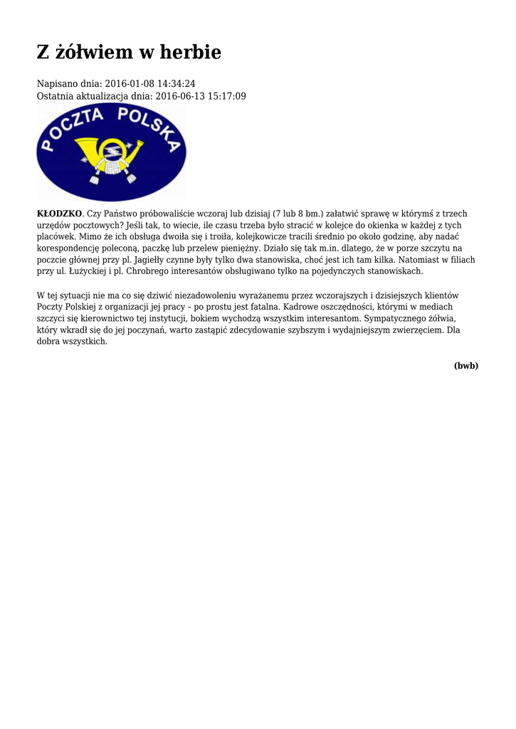 Z żółwiem w herbie Napisano dnia: 2016-01-08 14:34:24 Ostatnia aktualizacja dnia: 2016-06-13 15:17:09 KŁODZKO. Czy Państwo próbowaliście wczoraj lub dzisiaj (7 lub 8 bm.) załatwić sprawę w którymś z trzech urzędów pocztowych? Jeśli tak, to wiecie, ile czasu trzeba było stracić w kolejce do okienka w każdej z tych placówek. Mimo że ich obsługa dwoiła się i troiła, kolejkowicze tracili średnio po około godzinę, aby nadać korespondencję poleconą, paczkę lub przelew pieniężny. Działo się tak m.in. dlatego, że w porze szczytu na poczcie głównej przy pl. Jagiełły czynne były tylko dwa stanowiska, choć jest ich tam kilka. Natomiast w filiach przy ul. Łużyckiej i pl. Chrobrego interesantów obsługiwano tylko na pojedynczych stanowiskach. W tej sytuacji nie ma co się dziwić niezadowoleniu wyrażanemu przez wczorajszych i dzisiejszych klientów Poczty Polskiej z organizacji jej pracy – po prostu jest fatalna. Kadrowe oszczędności, którymi w mediach szczyci się kierownictwo tej instytucji, bokiem wychodzą wszystkim interesantom. Sympatycznego żółwia, który wkradł się do jej poczynań, warto zastąpić zdecydowanie szybszym i wydajniejszym zwierzęciem. Dla dobra wszystkich. (bwb)