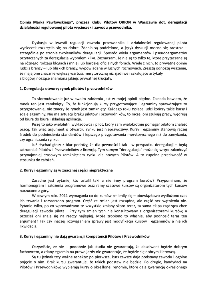 Opinia Marka Pawłowskiego*, prezesa Klubu Pilotów ORION w Warszawie dot. deregulacji działalności regulowanej pilota wycieczek i zawodu przewodnika. Dyskusja w kwestii regulacji zawodu przewodnika i działalności regulowanej pilota wycieczek rozkręciła się na dobre. Zdania są podzielone, a język dyskusji mocno się zaostrza – szczególnie po stronie zwolenników deregulacji. Spośród wielu argumentów i pseudoargumetów przytaczanych za deregulacją wybrałem kilka. Zaznaczam, że nie są to tylko te, które przytaczane są na różnego rodzaju blogach i mniej lub bardziej oficjalnych forach. Wiele z nich, to prywatne opinie ludzi z branży – lub bliskich branży, wypowiadane w luźnych rozmowach. Zresztą odnoszę wrażenie, że mają one znacznie większą wartość merytoryczną niż zjadliwe i szkalujące artykuły z blogów, noszące znamiona jakiejś prywatnej krucjaty. 1. Deregulacja otworzy rynek pilotów i przewodników To sformułowanie już w swoim założeniu jest w mojej opinii błędne. Zakłada bowiem, że rynek ten jest zamknięty. To, że funkcjonują kursy przygotowujące i egzaminy sprawdzające to przygotowanie, nie znaczy że rynek jest zamknięty. Każdego roku tysiące ludzi kończy takie kursy i zdaje egzaminy. Nie ma sytuacji braku pilotów i przewodników, to raczej oni szukają pracy, wędrują od biura do biura i składają aplikacje. Piszę to jako wieloletni wykładowca i pilot, króry sam wielokrotnie pomagał pilotom znaleźć pracę. Tak więc argument o otwarciu rynku jest nieprawdziwy. Kursy i egzaminy stanowią raczej środek do podniesienia standardów i lepszego przygotowania merytorycznego niż do zamykania, czy ograniczania rynku. Już słychać głosy z biur podróży, że dla pewności i tak - w przypadku deregulacji – będą zatrudniać Pilotów i Przewodników z licencją. Tym samym "deregulacja" może się wręcz zakończyć przynajmniej czasowym zamknięciem rynku dla nowych Pilotów. A to zupełna przeciwność w stosunku do założeń. 2. Kursy i egzaminy są w znacznej części niepraktyczne Zasadne jest pytanie, kto ustalił taki a nie inny program kursów? Przypominam, że harmonogram i założenia programowe oraz ramy czasowe kursów są organizatorom tych kursów narzucone z góry. W zeszłym roku 2011 wymagania co do kursów zmieniły się – obowiązkowo wydłużono czas ich trwania i rozszerzono program. Część ze zmian jest rozsądna, ale część bez wątpienia nie. Pytanie tylko, po co wprowadzano te wszystkie zmiany skoro teraz, ta sama ekipa rządząca chce deregulacji zawodu pilota... Przy tym zmian tych nie konsultowano z organizatorami kursów, a przecież oni znają się na rzeczy najlepiej. Może zrobiono to właśnie, aby podnosić teraz ten argument? Tak czy inaczej rozwiązaniem sprawy jest modyfikacja kursów i egzaminów a nie ich likwidacja. 3. Kursy i egzaminy nie dają gwarancji kompetencji Pilotów i Przewodników Oczywiście, że nie – podobnie jak studia nie gwarantują, że absolwent będzie dobrym fachowcem, a zdany egzamin na prawo jazdy nie gwarantuje, że będzie się dobrym kierowcą. Są tu jednak trzy ważne aspekty: po pierwsze, kurs zawsze daje podstawy zawodu i ogólne pojęcie o nim. Brak kursu gwarantuje, że takich podstaw nie będzie. Po drugie, kandydaci na Pilotów i Przewodników, wybierają kursy o określonej renomie, które dają gwarancję określonego poziomu – wybór szkół jest spory. I wreszcie trzecia sprawa – sami kandydaci. Od kilku lat można zauważyć, że na kursy słuchacze przychodzą świadomie. To już nie te czasy, gdy trafiały się osoby przypadkowe lub takie, które za licencję Pilota lub Przewodnika dostawały dodatkowe punkty na uczelniach np. na AWF. Wtedy rzeczywiście zdarzały się jednostki o żenującym wręcz poziomie, które pracowały tylko na zdany egzamin – czyli kuły na pamięć pytania do testów. Te czasy jednak minęły. Z satysfakcją można zauważyć, że poziom kandydatów na Pilotów i Przewodników jest wysoki. A stąd już tylko krok do stwierdzenia prostego, niemal matematycznego, że Dobry Kursant + Dobry Kurs = Potencjalnie Dobry Pilot. Tak więc kursy, dają pewną gwarancję, o ile trafią na dobry "materiał". Zwłaszcza, że wszystkie one mają dodatkowe wewnętrzne egzaminy i testy – dbając tym samym o swoją renomę. Całkowita deregulacja zawodu Pilota i Przewodnika spowoduje, że Ci, którzy pilotami być chcą, ale się nie nadają, będą "testowani" na turystach. 4. Można być dobrym Pilotem lub Przewodnikiem bez kursu – kursy są niepotrzebne Pewną odpowiedź na ten argument dałem w poprzednim punkcie. Pozostało jednak kilka punktów, które przez podnoszących ten argument są całkowicie pomijane a są absolutnie fundamentalne. Pilotaż to nie jest tylko robienie dobrego wrażenia i fajne opowiadanie, a takie właśnie odnoszę wrażenie czytając niektóre teksty. Z pracą tą wiąże się szereg konkretnych zadań – procedury ubezpieczeniowe w przypadku choroby, wypadku, czy utraty bagażu. Współpraca z Policją w rozmaitych przypadkach, umiejętność przewidywania i rozwiązywania rozmaitych nieraz bardzo trudnych sytuacji. Pilot powinien znać przepisy celne i paszportowe – i co najważniejsze umieć te przepisy zastosować, jeśli istnieje taka konieczność. Dla każdego praktyka, wszystko co tu piszę jest oczywiste. Jak osoba bez jakiegokolwiek przygotowania może się zmierzyć z tymi zadaniami? Powtarzam – Pilot to nie tylko Wesoły Opowiadacz. Zwolennicy deregulacji zapominają o tym, że nie zawsze wszystko idzie doskonale. Rzeczywiście, kiedy wszystko jest w porządku Wesoły Opowiadacz wystarczy, ale co w sytuacji krytycznej? Podczas swych wyjazdów wielokrotnie spotykałem pilotów bez licencji. Bardzo dobrze znali daną destynację, znali języki – ale to wcale nie znaczy, że znali się na pilotażu. Kiedy dochodziło do sytuacji kryzysowych nie wiedzieli nawet ja