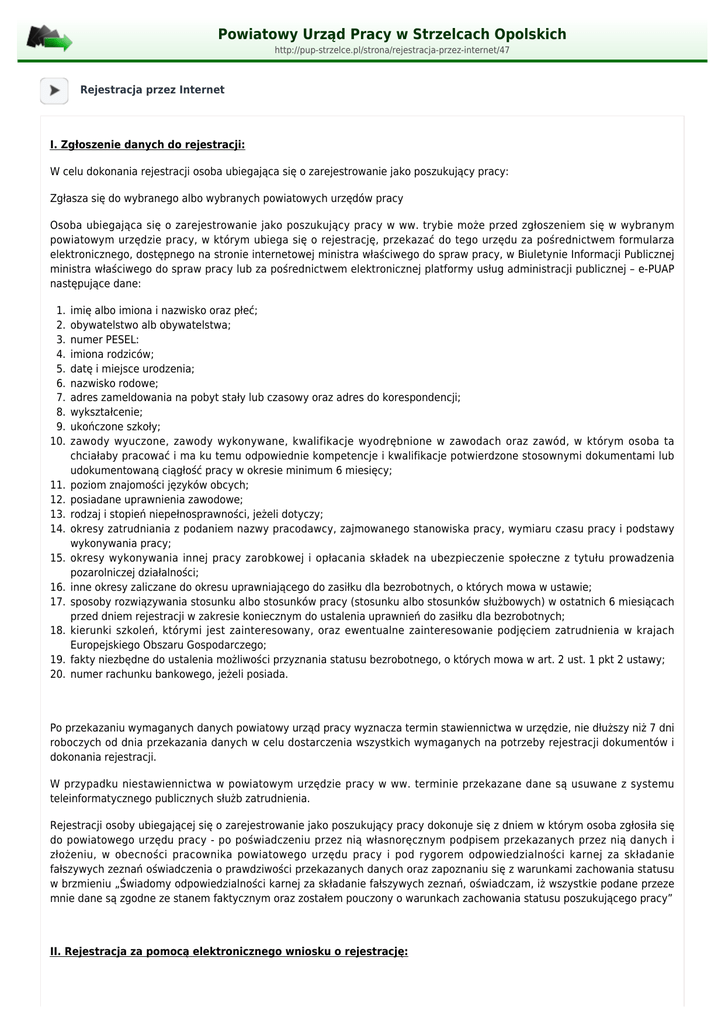 Powiatowy Urząd Pracy w Strzelcach Opolskich http://pup-strzelce.pl/strona/rejestracja-przez-internet/47 Rejestracja przez Internet I. Zgłoszenie danych do rejestracji: W celu dokonania rejestracji osoba ubiegająca się o zarejestrowanie jako poszukujący pracy: Zgłasza się do wybranego albo wybranych powiatowych urzędów pracy Osoba ubiegająca się o zarejestrowanie jako poszukujący pracy w ww. trybie może przed zgłoszeniem się w wybranym powiatowym urzędzie pracy, w którym ubiega się o rejestrację, przekazać do tego urzędu za pośrednictwem formularza elektronicznego, dostępnego na stronie internetowej ministra właściwego do spraw pracy, w Biuletynie Informacji Publicznej ministra właściwego do spraw pracy lub za pośrednictwem elektronicznej platformy usług administracji publicznej – e-PUAP następujące dane: 1. 2. 3. 4. 5. 6. 7. 8. 9. 10. 11. 12. 13. 14. 15. 16. 17. 18. 19. 20. imię albo imiona i nazwisko oraz płeć; obywatelstwo alb obywatelstwa; numer PESEL: imiona rodziców; datę i miejsce urodzenia; nazwisko rodowe; adres zameldowania na pobyt stały lub czasowy oraz adres do korespondencji; wykształcenie; ukończone szkoły; zawody wyuczone, zawody wykonywane, kwalifikacje wyodrębnione w zawodach oraz zawód, w którym osoba ta chciałaby pracować i ma ku temu odpowiednie kompetencje i kwalifikacje potwierdzone stosownymi dokumentami lub udokumentowaną ciągłość pracy w okresie minimum 6 miesięcy; poziom znajomości języków obcych; posiadane uprawnienia zawodowe; rodzaj i stopień niepełnosprawności, jeżeli dotyczy; okresy zatrudniania z podaniem nazwy pracodawcy, zajmowanego stanowiska pracy, wymiaru czasu pracy i podstawy wykonywania pracy; okresy wykonywania innej pracy zarobkowej i opłacania składek na ubezpieczenie społeczne z tytułu prowadzenia pozarolniczej działalności; inne okresy zaliczane do okresu uprawniającego do zasiłku dla bezrobotnych, o których mowa w ustawie; sposoby rozwiązywania stosunku albo stosunków pracy (stosunku albo stosunków służbowych) w ostatnich 6 miesiącach przed dniem rejestracji w zakresie koniecznym do ustalenia uprawnień do zasiłku dla bezrobotnych; kierunki szkoleń, którymi jest zainteresowany, oraz ewentualne zainteresowanie podjęciem zatrudnienia w krajach Europejskiego Obszaru Gospodarczego; fakty niezbędne do ustalenia możliwości przyznania statusu bezrobotnego, o których mowa w art. 2 ust. 1 pkt 2 ustawy; numer rachunku bankowego, jeżeli posiada. Po przekazaniu wymaganych danych powiatowy urząd pracy wyznacza termin stawiennictwa w urzędzie, nie dłuższy niż 7 dni roboczych od dnia przekazania danych w celu dostarczenia wszystkich wymaganych na potrzeby rejestracji dokumentów i dokonania rejestracji. W przypadku niestawiennictwa w powiatowym urzędzie pracy w ww. terminie przekazane dane są usuwane z systemu teleinformatycznego publicznych służb zatrudnienia. Rejestracji osoby ubiegającej się o zarejestrowanie jako poszukujący pracy dokonuje się z dniem w którym osoba zgłosiła się do powiatowego urzędu pracy - po poświadczeniu przez nią własnoręcznym podpisem przekazanych przez nią danych i złożeniu, w obecności pracownika powiatowego urzędu pracy i pod rygorem odpowiedzialności karnej za składanie fałszywych zeznań oświadczenia o prawdziwości przekazanych danych oraz zapoznaniu się z warunkami zachowania statusu w brzmieniu „Świadomy odpowiedzialności karnej za składanie fałszywych zeznań, oświadczam, iż wszystkie podane przeze mnie dane są zgodne ze stanem faktycznym oraz zostałem pouczony o warunkach zachowania statusu poszukującego pracy” II. Rejestracja za pomocą elektronicznego wniosku o rejestrację: W celu dokonania rejestracji osoba ubiegająca się o zarejestrowania jako poszukujący pracy : Wypełnia wniosek o dokonanie rejestracji za pośrednictwem formularza elektronicznego dostępnego na stronie internetowej ministra właściwego do spraw pracy, w Biuletynie Informacji Publicznej ministra właściwego do spraw pracy lub za pośrednictwem elektronicznej platformy usług administracji publicznej. W ww. wniosku osoba ubiegająca się o zarejestrowanie jako bezrobotny podaje następujące dane: 1. 2. 3. 4. 5. 6. 7. 8. 9. 10. 11. 12. 13. 14. 15. 16. 17. 18. 19. 20. imię albo imiona i nazwisko oraz płeć; obywatelstwo albo obywatelstwa; numer PESEL: imiona rodziców; datę i miejsce urodzenia; nazwisko rodowe; adres zameldowania na pobyt stały lub czasowy oraz adres do korespondencji; wykształcenie; ukończone szkoły; zawody wyuczone, zawody wykonywane, kwalifikacje wyodrębnione w zawodach oraz zawód, w którym osoba ta chciałaby pracować i ma ku temu odpowiednie kompetencje i kwalifikacje potwierdzone stosownymi dokumentami lub udokumentowaną ciągłość pracy w okresie minimum 6 miesięcy; poziom znajomości języków obcych; posiadane uprawnienia zawodowe; rodzaj i stopień niepełnosprawności, jeżeli dotyczy; okresy zatrudniania z podaniem nazwy pracodawcy, zajmowanego stanowiska pracy, wymiaru czasu pracy i podstawy wykonywania pracy; okresy wykonywania innej pracy zarobkowej i opłacania składek na ubezpieczenie społeczne z tytułu prowadzenia pozarolniczej działalności; inne okresy zaliczane do okresu uprawniającego do zasiłku dla bezrobotnych,o których mowa w ustawie; sposoby rozwiązywania stosunku albo stosunków pracy (stosunku albo stosunków służbowych) w ostatnich 6 miesiącach przed dniem rejestracji w zakresie koniecznym do ustalenia uprawnień do zasiłku dla bezrobotnych; kierunki szkoleń, którymi jest zainteresowany, oraz ewentualne zainteresowanie podjęciem zatrudnienia w krajach Europejskiego Obszaru Gospodarczego; fakty niezbędne do ustalenia możliwości przyznania statusu bezrobotnego, o których mowa w art. 2 ust. 1 pkt 2 ustawy; numer rachunku bankowego, jeżeli posiada. wskazuje wybrany albo wybrane powiatowe urzędy pracy oraz opatruje wniosek: ● ● ● bezpie