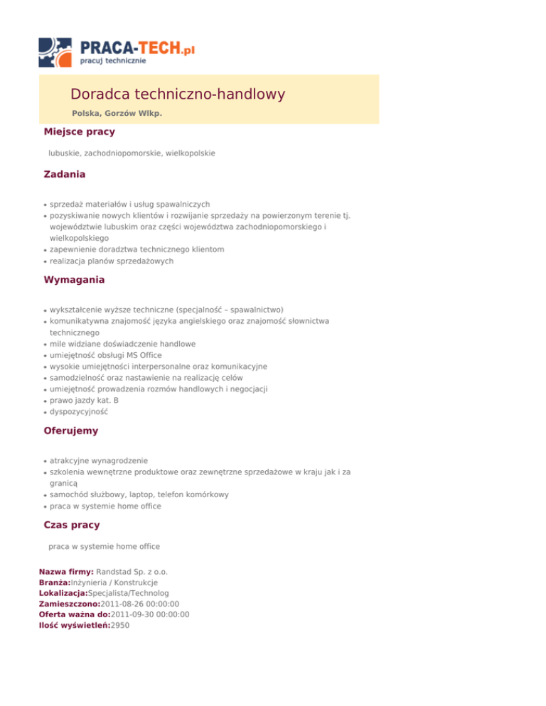 Doradca techniczno-handlowy Polska, Gorzów Wlkp. Miejsce pracy lubuskie, zachodniopomorskie, wielkopolskie Zadania ● ● ● ● sprzedaż materiałów i usług spawalniczych pozyskiwanie nowych klientów i rozwijanie sprzedaży na powierzonym terenie tj. województwie lubuskim oraz części województwa zachodniopomorskiego i wielkopolskiego zapewnienie doradztwa technicznego klientom realizacja planów sprzedażowych Wymagania ● ● ● ● ● ● ● ● ● wykształcenie wyższe techniczne (specjalność – spawalnictwo) komunikatywna znajomość języka angielskiego oraz znajomość słownictwa technicznego mile widziane doświadczenie handlowe umiejętność obsługi MS Office wysokie umiejętności interpersonalne oraz komunikacyjne samodzielność oraz nastawienie na realizację celów umiejętność prowadzenia rozmów handlowych i negocjacji prawo jazdy kat. B dyspozycyjność Oferujemy ● ● ● ● atrakcyjne wynagrodzenie szkolenia wewnętrzne produktowe oraz zewnętrzne sprzedażowe w kraju jak i za granicą samochód służbowy, laptop, telefon komórkowy praca w systemie home office Czas pracy praca w systemie home office Nazwa firmy: Randstad Sp. z o.o. Branża:Inżynieria / Konstrukcje Lokalizacja:Specjalista/Technolog Zamieszczono:2011-08-26 00:00:00 Oferta ważna do:2011-09-30 00:00:00 Ilość wyświetleń:2950