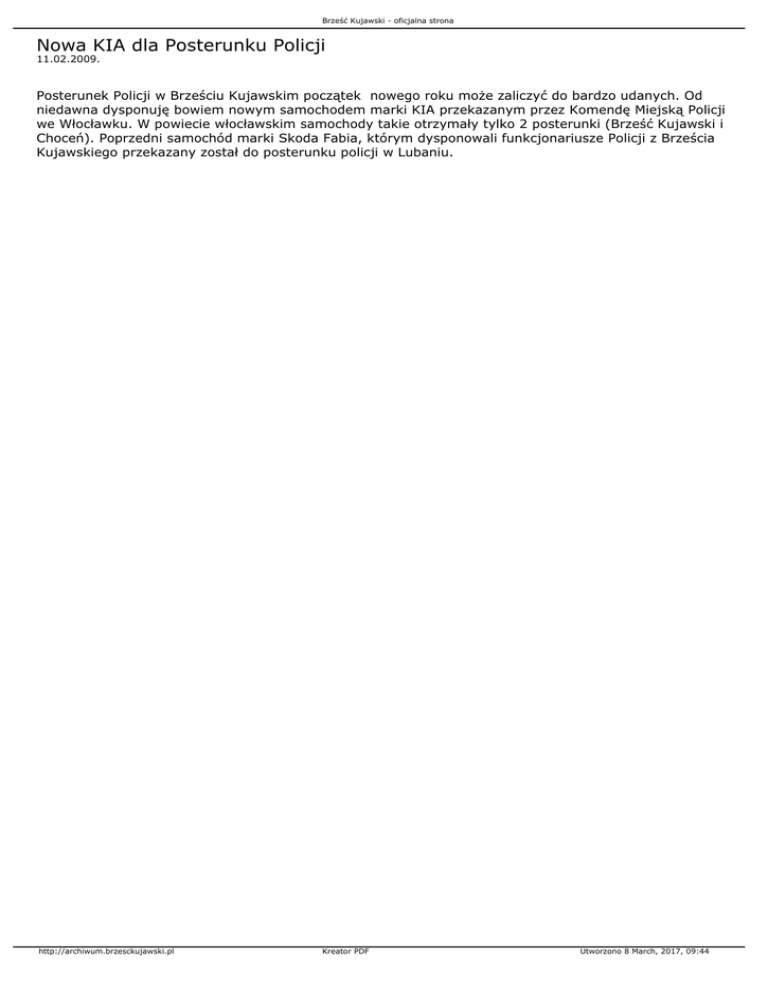 Brześć Kujawski - oficjalna strona Nowa KIA dla Posterunku Policji 11.02.2009. Posterunek Policji w Brześciu Kujawskim początek nowego roku może zaliczyć do bardzo udanych. Od niedawna dysponuję bowiem nowym samochodem marki KIA przekazanym przez Komendę Miejską Policji we Włocławku. W powiecie włocławskim samochody takie otrzymały tylko 2 posterunki (Brześć Kujawski i Choceń). Poprzedni samochód marki Skoda Fabia, którym dysponowali funkcjonariusze Policji z Brześcia Kujawskiego przekazany został do posterunku policji w Lubaniu. http://archiwum.brzesckujawski.pl Kreator PDF Utworzono 8 March, 2017, 09:44
