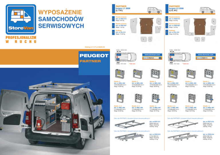 WYPOSAŻENIE SAMOCHODÓW SERWISOWYCH furgon L1 2008 (L1 H1) furgon L2 2008 (L1L H1) PARTNER A C D PROFESJONALIZM W R U C H U Panele ścienne Art. nr PAN 014 Waga: 3,05 Kg Panele ścienne Art. nr PAR 007 PARTNER A A D Waga: 1,02 Kg PEUGEOT PARTNER A D Waga: 17,65 Kg Panele ścienne Art. nr PAR 007 A A D Waga: 1,02 Kg A Podłoga Art. nr PIL 012 A Waga: 20,20 Kg C maks. 1016 mm A C C maks. 1016 mm 3 www.storevan.com 5 maks. 717 mm Waga: 4,30 Kg C Podłoga Art. nr PIL 011 C Katalog nr C CT pl SA006 00 Panele ścienne Art. nr PAN 015 A PAR101 3 5 maks. 717 mm *520 mm www.storevan.com PAR111 *520 mm Strefa: 3 Art. nr MDL 002 Strefa: 3 Art. nr MDL 003 Strefa: 3 Art. nr MDL 004 Strefa: 3 Art. nr MDL 002 Strefa: 3 Art. nr MDL 003 Strefa: 3 Art. nr MDL 004 Strefa: 3 5 Art. nr MDL 005 Strefa: 3 5 Art. nr MDL 006 Strefa: 5 Art. nr MDL 007 Strefa: 3 5 Art. nr MDL 005 Strefa: 3 5 Art. nr MDL 006 Strefa: 5 Art. nr MDL 007 1016x365x900 mm h Waga: 43,80 Kg 717x365x900 mm h Waga: 32,90 Kg 1016x365x900 mm h Waga: 28,80 Kg 1016x365x900 mm h Waga: 52,20 Kg 717x365x900 mm h Waga: 22,70 Kg 717x365x900 mm h Waga: 42,70 Kg Tylko dla PARTNER z drzwiami tylnymi dwuskrzydłowymi Art. nr POT 011 2000x1400 mm Waga: 22,00 Kg Udźwig: 78 Kg Tylko dla PARTNER z drzwiami tylnymi dwuskrzydłowymi Art. nr POS 013 2110x1380 mm Waga: 43,55 Kg Udźwig: 57 Kg 1016x365x900 mm h Waga: 43,80 Kg 717x365x900 mm h Waga: 32,90 Kg 1016x365x900 mm h Waga: 52,20 Kg 717x365x900 mm h Waga: 22,70 Kg 1016x365x900 mm h Waga: 28,80 Kg 717x365x900 mm h Waga: 42,70 Kg Tylko dla PARTNER z drzwiami tylnymi dwuskrzydłowymi Art. nr POT 012 2500x1400 mm Waga: 23,92 Kg Udźwig: 76 Kg Tylko dla PARTNER z drzwiami tylnymi dwuskrzydłowymi Art. nr POS 014 2650x1380 mm Waga: 48,69 Kg Udźwig: 52 Kg furgon L1 2008 (L1 H1) furgon L1 2008 (L1 H1) PARTNER PARTNER PODWYŻSZANA PODŁOGA Z SZUFLADAMI POD NIĄ I Z WYSUWANYM REGAŁEM 1000 mm WYSUWANE REGAŁY I PLATOFRMY Wysuwana platforma ładunkowa Art. nr PEO 003 Wymiary: 1080x1524x80 mm (szer. x dł. x wys.) Waga: 70,80 Kg Zestaw składa się z: 1 płyta ze sklejki pokrytej warstwą ochronną z otworami montażowymi 1 mechanizm wysuwanej platformy: rama oparta na prowadnicach, wysuwająca się do 60% z udźwigiem 300 Kg 8 uchwytów do do pasów do mocowania ładunku 2 pasy do mocowania ładunki Zestaw podwyższanej podłogi z szufladami w części dostępnej przez drzwi boczne tworzy schowek za pomocą opuszczanej klapki będącej przedłużeniem podłogi (1,2,3) Wysuwana platforma ułatwia załadunek i rozładunek wielkogabarytowych przedmiotów, pozwalając jednocześnie na bezpieczny ich transport dzięki solidnemu systemowi mocowania 1 2 3 Istnieje możliwość dodania w tym miejscu dodatkowych półek pozwalających na uporządkowane przewożenie drobnych przedmiotów (4,5) 4 5 Dzięki temu, że klapka nad częścią dostępną przez drzwi boczne jest asymetrycznie dzielona, wysuwany regał nie przeszkadza w korzystaniu. Ze schowka w przedniej części furgonu (6,7) Wysuwany regał Art. nr PEV 001 Regał zamocowany na stelażu wysuwanym na zewnątrz samochodu Wymiary: 1234x355x1110 mm (szer. x dł. x wys.) Waga: 57,60 Kg Panel complete with: 1 wysuwany stelaż z udźwigiem 100 kg przy wysunięciu 50% lub 75 kg przy wysunięciu 70% 1 szafka: cztery półki z regulowanymi przegródkami i matą ochronną 6 7 Przez drzwi tylne dostępne są dwie szerokie szuflady wyposażone w zestawy przegródek. Ładowność każdej szuflady: WYSUWANY REGAŁ NA STELAŻU Może być zamontowany jedynie w obecności dodatkowej podłogi ze sklejki takiej jak np. art. nr PIL 011. Wysuwany regał pozwala na łatwiejszy dostęp do materiałów zgromadzonych na półkach 107 6m m* m 600 m* 150 Kg *wymiary wewnętrzne 107 6m m* m* m 600 furgon L1 2008 (L1 H1) PARTNER PODWYŻSZANA PODŁOGA Z SZUFLADAMI POD NIĄ I Z WYSUWANYM REGAŁEM furgon L1 2008 (L1 H1) PARTNER PODWYŻSZANA PODŁOGA Z SZUFLADAMI POD NIĄ I Z WYSUWANYM REGAŁEM Zestaw podwyższanej podłogi z szufladami Art. nr MPR 003 Wymiary: 1669x1470x328 mm (szer. x dł. x wys.) Waga: 109,30 Kg W skład zestawu wchodzą: 1 dolna podłoga ze sklejki grubości 12 mm 1 górna podłoga ze sklejki grubości 12 mm 1 stelaż z dwiema szufladami (ładowność każdej - 150 Kg) z kompletem przegródek, wymiary wewnętrzne szuflad 1076x600x54/104 mm Podpórka do klapki nad schowkiem PRZYKŁADOWE ROZWIĄZANIE nr 1 skład: 1 Art. nr MPR 003 (1) 1 Art. nr MPR 999 (2) 1 Art. nr MPR 004 (3) Art. nr MPR 999 PRZYKŁADOWE ROZWIĄZANIE nr 2 skład: 1 Art. nr MPR 003 (1) 1 Art. nr MPR 999 (2) 1 Art. nr MPR 004 (3) 1 Art. nr PEO 202 (4) Wymiary: 1193x30x300 mm (szer. x dł. x wys.) Waga: 4,08 Kg Wykonana z profilu – rury kwadratowej 30x30 mm. Zestaw podwyższanej podłogi z szufladami Art. nr MPR 003 Wymiary: 1669x1470x328 mm (szer. x dł. x wys.) Waga: 109,30 Kg W skład zestawu wchodzą: 1 dolna podłoga ze sklejki grubości 12 mm 1 górna podłoga ze sklejki grubości 12 mm 1 stelaż z dwiema szufladami (ładowność każdej - 150 Kg) z kompletem przegródek, wymiary wewnętrzne szuflad 1076x600x54/104 mm Dwuczęściowa opuszczana klapka Art. nr MPR 004 Wymiary: 787x1356x12 mm (szer. x dł. x wys.) Waga: 11,50 Kg W skład zestawu wchodzą: 2 pokrywa z wzmocnionej sklejki 12mm + 6 zawiasów Udźwig całego zestawu podwyższanej podłogi: 500 Kg (p.u.d.) Pas do mocowania ładunku Art. nr MPR 997 Wysuwany regał Art. nr PEO 202 Wymiary: 4500x25 mm (WxH) Waga: 0,68 Kg Montowany do krawędzi podwyższanej podłogi przy rezygnacji z klapki opuszczanej nad przednią częścią. Regał zamocowany na platformie wysuwającej się przez drzwi tylne Wymiary: 1225x365x740 mm (szer. x dł. x wys.) Waga: 39,00 Kg Zestaw składa się z: 1 wysuwana platforma, udźwig 160 Kg przy wysunięciu 60% 1 szafka z trzema półkami z regulowanymi przegródkami i matą ochronną WYSUWANY REGAŁ (PEO202) może być zamontowany jedynie w komplecie z zestawem podwyższanej podłogi (1) + podpora (2) + klapka (3). Widok kom