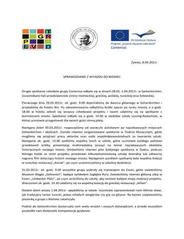 Żywiec, 8.04.2011r SPRAWOZDANIE Z WYJAZDU DO NIEMIEC Drugie spotkanie członków grupy Comenius odbyło się w dniach 28.03.-1.04.2011r. w Gelsenkirchen. Uczestnikami byli przedstawiciele strony niemieckiej, greckiej, polskiej, tureckiej oraz łotewskiej. Pierwszego dnia 29.03.2011r. ok. godz. 9.00 dojechaliśmy do dworca głównego w Gelsenkirchen i przybyliśmy do hotelu Ibis. Po zakwaterowaniu odbyliśmy krótki spacer po rynku miasta, a o godz. 18.00 w hotelu zebrali się wszyscy członkowie projektu i razem udaliśmy się na spotkanie z burmistrzem miasta. Spotkanie odbyło się o godz. 19.00 w siedzibie szkoły Lessing-Realschule, w której uczniowie przygotowali dla swoich gości zimną płytę. Następny dzieo 30.03.2011r. rozpoczęliśmy od wycieczki autokarem po najciekawszych miejscach Gelsenkirchen i okolicach. Zostało również zorganizowane spotkanie w Teatrze Muzycznym, gdzie mogliśmy się przyjrzed pracy aktorów oraz osób współodpowiedzialnych za tworzenie sztuki. Następnie ok. godz. 13.00 zjedliśmy wspólny lunch w szkole, gdzie uczniowie każdego paostwa przedstawili krótką prezentację multimedialną (essay) na temat najciekawszych obiektów historycznych swojego miasta. Omówiliśmy również plan kolejnego spotkania w Żywcu, podczas którego każda ze stron projektu przedstawi kilkunastominutową sztukę teatralną lub odtworzy nagrany film dotyczący historii swojego miasta. Następnym punktem spotkania była wspólna kolacja w tureckiej restauracji „Konak”, po czym uczestniczyliśmy w szkolnej dyskotece. 31.03.2011r. ok. godz. 9.00 wszystkie grupy wybrały się tramwajem do Essen, gdzie zwiedziliśmy Muzeum Węgla „Zollverein”, będące symbolem Zagłębia Rury. Zwiedziliśmy również główną ulicę w Essen „Limbecker Platz”, po czym wróciliśmy do szkoły, aby omówid kolejne etapy realizacji projektu. Wieczorem ok. godz. 19.30 udaliśmy się na wspólną kolację do greckiej restauracji „Athen”. Ostatni dzieo wizyty 1.04.2011r. spędziliśmy w szkole. Uczniowie zaprezentowali nam kłótnie show, jak tradycyjny taniec turecki, pokaz młodych żonglerów czy grę na gitarze. Na koniec zaśpiewaliśmy piosenkę a grupa z Niemiec zataoczyła. Podróż do Gelsenkirchen dostarczyła nam wielu wrażeo i nowych doświadczeo, a przede wszystkim pozwoliła nam doskonalid kompetencje językowe.