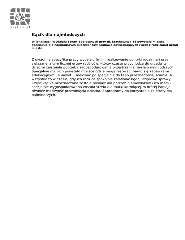 Kącik dla najmłodszych W lokalizacji Wydziału Spraw Społecznych przy ul. Stachowicza 18 powstało miejsce specjalnie dla najmłodszych mieszkańców Krakowa odwiedzających (wraz z rodzicami) urząd miasta. Z uwagi na specyfikę pracy wydziału (m.in. realizowanie polityki rodzinnej) oraz związanej z tym licznej grupy rodziców, którzy często przychodzą do urzędu z dziećmi zaistniała potrzeba zagospodarowania przestrzeni z myślą o najmłodszych. Specjalnie dla nich powstało miejsce gdzie mogą rysować, bawić się zabawkami edukacyjnymi, a nawet… malować po specjalnie do tego przeznaczonej ścianie. A wszystko to w czasie, gdy ich rodzice spokojnie załatwiać będą urzędowe sprawy. Część kącika przeznaczona została również dla potrzeb niemowlaków i ich mam specjalnie wygospodarowana została strefa dla matki karmiącej, w której istnieje również możliwość przewinięcia dziecka. Zapraszamy do korzystania ze strefy dla najmłodszych. Powered by TCPDF (www.tcpdf.org)