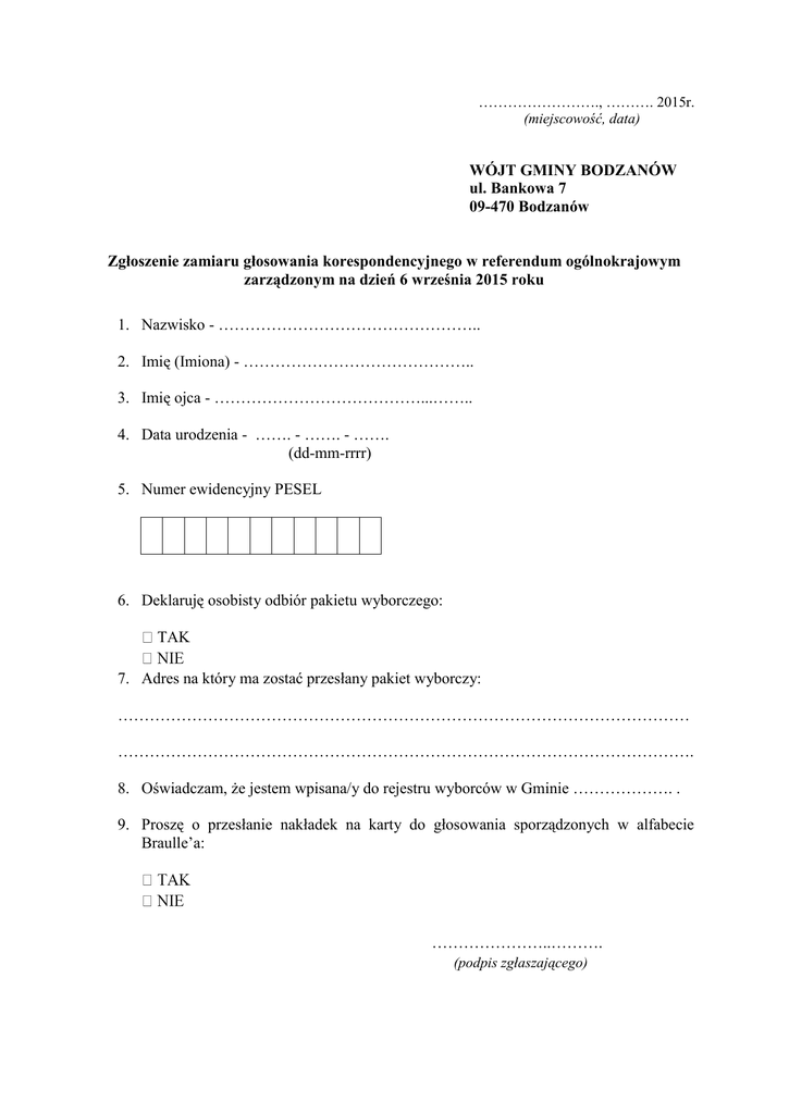 ……………………., ………. 2015r. (miejscowość, data) WÓJT GMINY BODZANÓW ul. Bankowa 7 09-470 Bodzanów Zgłoszenie zamiaru głosowania korespondencyjnego w referendum ogólnokrajowym zarządzonym na dzień 6 września 2015 roku 1. Nazwisko - ………………………………………….. 2. Imię (Imiona) - …………………………………….. 3. Imię ojca - …………………………………...…….. 4. Data urodzenia - ……. - ……. - ……. (dd-mm-rrrr) 5. Numer ewidencyjny PESEL 6. Deklaruję osobisty odbiór pakietu wyborczego: TAK 7. Adres na który ma zostać przesłany pakiet wyborczy: ……………………………………………………………………………………………… ………………………………………………………………………………………………. 8. Oświadczam, że jestem wpisana/y do rejestru wyborców w Gminie ………………. . 9. Proszę o przesłanie nakładek na karty do głosowania sporządzonych w alfabecie Braulle’a: …………………..………. (podpis zgłaszającego)
