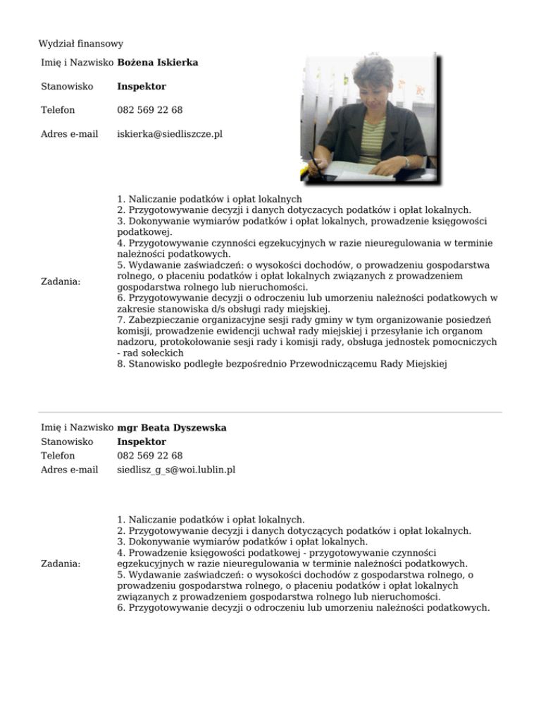 Wydział finansowy Imię i Nazwisko Bożena Iskierka Stanowisko Inspektor Telefon 082 569 22 68 Adres e-mail [email protected] Zadania: 1. Naliczanie podatków i opłat lokalnych 2. Przygotowywanie decyzji i danych dotyczacych podatków i opłat lokalnych. 3. Dokonywanie wymiarów podatków i opłat lokalnych, prowadzenie księgowości podatkowej. 4. Przygotowywanie czynności egzekucyjnych w razie nieuregulowania w terminie należności podatkowych. 5. Wydawanie zaświadczeń: o wysokości dochodów, o prowadzeniu gospodarstwa rolnego, o płaceniu podatków i opłat lokalnych związanych z prowadzeniem gospodarstwa rolnego lub nieruchomości. 6. Przygotowywanie decyzji o odroczeniu lub umorzeniu należności podatkowych w zakresie stanowiska d/s obsługi rady miejskiej. 7. Zabezpieczanie organizacyjne sesji rady gminy w tym organizowanie posiedzeń komisji, prowadzenie ewidencji uchwał rady miejskiej i przesyłanie ich organom nadzoru, protokołowanie sesji rady i komisji rady, obsługa jednostek pomocniczych - rad sołeckich 8. Stanowisko podległe bezpośrednio Przewodniczącemu Rady Miejskiej Imię i Nazwisko mgr Beata Dyszewska Stanowisko Inspektor Telefon 082 569 22 68 Adres e-mail [email protected] Zadania: 1. Naliczanie podatków i opłat lokalnych. 2. Przygotowywanie decyzji i danych dotyczących podatków i opłat lokalnych. 3. Dokonywanie wymiarów podatków i opłat lokalnych. 4. Prowadzenie księgowości podatkowej - przygotowywanie czynności egzekucyjnych w razie nieuregulowania w terminie należności podatkowych. 5. Wydawanie zaświadczeń: o wysokości dochodów z gospodarstwa rolnego, o prowadzeniu gospodarstwa rolnego, o płaceniu podatków i opłat lokalnych związanych z prowadzeniem gospodarstwa rolnego lub nieruchomości. 6. Przygotowywanie decyzji o odroczeniu lub umorzeniu należności podatkowych. Imię i Nazwisko Marta Gumieniuk Stanowisko Inspektor Telefon 082 569 22 68 Adres e-mail [email protected] Zadania 1. Naliczanie i prowadzenie opłat za zużycie wody z wodociągu gminnego i odprowadzanie ścieków do kanalizacji. 2. Prowadzenie księgowości należności za zużycie wody z wodociągu gminnego i odprowadzanie ścieków do kanalizacji. 3. Przygotowywanie czynności egzekucyjnych za należności wymienione w pkt. 1 i 2. 4. Prowadzenie księgowości opłaty od środków transportowych, wystawiania upomnień tytułów wykonawczych w tym zakresie. 5. Naliczanie podatków i opłat lokalnych. 6. Przygotowywanie wymiarów podatków i opłat lokalnych (kanalizacja i oczyszczalnia ścieków, wysypiska śmieci, zaopatrzenie w energię, transport zbiorowy). 7. Przygotowywanie decyzji o odroczeniu lub umorzeniu należności podatkowych. 8. Wykonywanie innych prac zleconych przez przełożonych. 9. Kompletowanie, ewidencjonowanie i właściwe przechowywanie oraz przekazywanie do archiwum akt i dokumentów własnych zgodnie z instrukcją kancelaryjną i archiwalną. 10. Prowadzenie teczek rzeczowych i pomocniczych zgodnie z jednolitym rzeczowym wykazem akt. 11. Branie udziału w zebraniach wiejskich. Imię i Nazwisko Monika Dudek Stanowisko Inspektor Telefon 082 569 22 68 Adres e-mail [email protected] Zadania 1. Naliczanie i prowadzenie opłat za zużycie wody z wodociągu gminnego i odprowadzanie ścieków do kanalizacji. 2. Prowadzenie księgowości należności za zużycie wody z wodociągu gminnego i odprowadzanie ścieków do kanalizacji. 3. Przygotowywanie czynności egzekucyjnych za należności wymienione w pkt. 1 i 2. 4. Prowadzenie księgowości opłaty od środków transportowych, wystawiania upomnień tytułów wykonawczych w tym zakresie. 5. Naliczanie podatków i opłat lokalnych. 6. Przygotowywanie wymiarów podatków i opłat lokalnych (kanalizacja i oczyszczalnia ścieków, wysypiska śmieci, zaopatrzenie w energię, transport zbiorowy). 7. Przygotowywanie decyzji o odroczeniu lub umorzeniu należności podatkowych. 8. Wykonywanie innych prac zleconych przez przełożonych. 9. Kompletowanie, ewidencjonowanie i właściwe przechowywanie oraz przekazywanie do archiwum akt i dokumentów własnych zgodnie z instrukcją kancelaryjną i archiwalną. 10. Prowadzenie teczek rzeczowych i pomocniczych zgodnie z jednolitym rzeczowym wykazem akt. 11. Branie udziału w zebraniach wiejskich. Imię i Nazwisko Alina Jóźwiak Stanowisko Inspektor Telefon 082 569 22 03 Adres e-mail [email protected] Zadania: 1. Sporządzanie list płac dla pracowników Urzędu Miejskiego oraz Zasiłków Chorobowych, 2. Prowadzenie kart wynagrodzeń, 3. Wystawianie legitymacji ubezpieczeniowych dla pracowników Urzedu Miejskiego i prowadzenie związanej z tym dokumentacji, 4. Dokonywanie rozliczeń składek z Zakładem Ubezpieczeń Społecznych, 5. Dokonywanie rozliczeń podatków od osób fizycznych z Urzędem Skarbowym, 6. Prowadzenie kart dochodów i wydatków. 7. Sporzadzanie sprawozdań z dochodów i wydatków budżetowych, 8. Przechowywanie, wydawanie i rozliczanie oraz prowadzenie rejestru druków ścisłego zarachowania, 9. Prowadzenie kont analitycznych, 10. Dokonywanie przelewów zobowiazań, 11. W przypadku nieobecności skarbnika wykonywanie zadań wynikających z zakresu czynności skarbnika gminy. Imię i Nazwisko Monika Szajc Stanowisko Podinspektor Telefon 082 569 22 03 Adres e-mail [email protected] Zadania: 1. Prowadzenie obsługi kasowej Urzędu Miejskiego, Gminnego Ośrodka Pomocy Społecznej i Gminnego Osrodka Kultury. 2. Prowadzenie księgowości opłaty od środków transportowych, wystawianie upomnień i tytułów wykonawczych w tym zakresie. 3. Prowadzenie ewidencji- księga główna- wydatków budżetowych i poza budżetowych zapewniającej rejestrowanie wszystkich operacji finansowogospodarczych. Imię i Nazwisko Brygida Zasada Stanowisko Podinspektor Telefon 082 569 22 68 Adres e-mail [email protected] Zadania: 1. Naliczanie podatków i opłat lokalnych. 2. Przygotowywanie decyzji i danych dotyczących podatków i opłat lokalnych. 3. Dokonywanie wymiar