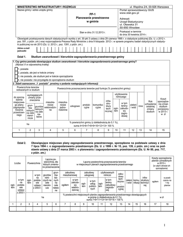 MINISTERSTWO INFRASTRUKTURY I ROZWOJU ul. Wspólna 2/4, 00-926 Warszawa Nazwa gminy i adres urzędu gminy Portal sprawozdawczy GUS www.stat.gov.pl PP-1 Planowanie przestrzenne w gminie Adresat: Urząd Statystyczny ul. Oławska 31 50-950 Wrocław Przekazać w terminie do dnia 30 kwietnia 2014 r. Stan w dniu 31.12.2013 r. Obowiązek przekazywania danych statystycznych wynika z art. 30 pkt 3 ustawy z dnia 29 czerwca 1995 r. o statystyce publicznej (Dz. U. z 2012 r. poz. 591, z późn. zm.) oraz rozporządzenia Prezesa Rady Ministrów z dnia 9 listopada 2012 r. w sprawie programu badań statystycznych statystyki publicznej na rok 2013 (Dz. U. 2012 r., poz. 1391, z późn. zm.). Adres e-mail jednostki Dział 1. Studium uwarunkowań i kierunków zagospodarowania przestrzennego gminy 1. Czy gmina posiada obowiązujące studium uwarunkowań i kierunków zagospodarowania przestrzennego gminy? (Wpisać X w odpowiednią kratkę) 1. posiada 2. posiada, ale jest w trakcie zmiany 3. nie posiada, ale studium jest w trakcie sporządzania 4. nie posiada i nie przystąpiła do sporządzania studium 2. Jeżeli zaznaczono „1. posiada”, prosimy o podanie następujących informacji Powierzchnia terenów Powierzchnie przeznaczenia terenów pod funkcje (% powierzchni gminy) wskazanych w studium do sporządzenia miejscowego planu zagospodarowania przestrzennego użytkowania rolniczego wymagających zmiany przeznaczenia mieszka- mieszkaniowe niowe grun- gruntów usługowe tów leśnych wielorodzin- jednone rodzinne rolnych na cele na cele nienierol- leśne nicze % powierzchni gminy (z dokładnością do 0,1 %), suma 4+5+6+7+8+9+10+12+13= 100 % ha 1 2 Dział 2. Liczba Koszt infraRok sporządzew tym struuchwalenia nia zmian produk- komunika- ktury tereny zieleni inne ostatniej studium cyjne cyjne i wód ogózabudotechzmiany poniesiony wy nicznej łem studium w 2013 r. zagrow zł dowej 3 4 5 6 7 8 9 10 11 12 13 14 Obowiązujące miejscowe plany zagospodarowania przestrzennego, sporządzone na podstawie ustawy z dnia 7 lipca 1994 r. o zagospodarowaniu przestrzennym (Dz. U. z 1999 r. Nr 15, poz. 139, z późn. zm.) oraz na podstawie ustawy z dnia 27 marca 2003 r. o planowaniu i zagospodarowaniu przestrzennym (Dz. U. Nr 80, poz. 717, z późn. zm.) Łączna powierzchnia, dla Powierzchnia których zmieniono przeznaczenie Koszty sporządzenia planów uchwalonych w 2013 r. (w całym okresie ich Łączna powierzchnia przeznaczenia terenów w miejscowych planach zagospodarowania przestrzennego sporządzania) grunzabudowy zabudowy użytkowanych zabuw tym gruntów tów mieszkaniowej usługowej rolniczo dowy na rolnileśinfratech- zieleni komu- struktury w tym ogó- podsta- czych na nych w tym w tym w tym nicznona zabudo- ogółem wie cele na i wód nikacji techniczusług ogó- tereny ogó- podstawy zabudowy ustawy nierolni- cele ogółem nej łem publiczłem produkłem wie wielorozagrodoz 2003 r. cze nieleśnych cyjnej ustawy dzinnej wej ne z 2003 r. % powierzchni miejscowych planów zagospodarowania przestrzennego obowiązujących ha w gminie (z dokładnością do 0,1 %) suma 7+9+11+13+14+15+16 = 100 % 1 2 15 3 4 5 6 7 8 9 10 11 12 13 14 15 16 ogółem w przeliczeniu na 1 ha planów w zł 17 18 1 Dział 3. Skutki finansowe uchwalenia miejscowych planów zagospodarowania przestrzennego sporządzonych na podstawie ustawy z dnia 27 marca 2003 r. o planowaniu i zagospodarowaniu przestrzennym (w zł bez znaku po przecinku) Rodzaj skutków finansowych Wpływy do budżetu gminy (dochody) RAZEM 0 1 Prognozowane w prognozach skutków finansowych sporządzonych dla planów miejscowych na podstawie art. 17 pkt 5 ustawy o planowaniu i zagospodarowaniu przestrzennym, uchwalonych: A. Przed rokiem sprawozdawczym, tj. uchwalonych do dnia 31 grudnia 2012 r. B. W roku sprawozdawczym, tj. uchwalonych w 2013 r. (w okresie od 1 stycznia – 31 grudnia 2013 r.) Uzyskane dochody i poniesione wydatki A. Przed rokiem sprawozdawczym, tj. do dnia 31 grudnia 2012 r. B. W roku sprawozdawczym, tj. w 2013 r. (w okresie od 1 stycznia – 31 grudnia 2013 r.), związane z realizacją planów miejscowych uchwalonych na podstawie ustawy o planowaniu i zagospodarowaniu przestrzennym: z tego z tytułu z tego opłaty planistycznej wzrostu podatku od nieruchomości podatku od czynności cywilnoprawnych inne ujęte w prognozie skutków finansowych Wydatki (koszty) RAZEM wykup gruntów pod drogi gminne budowa dróg gminnych budowa infrastruktury technicznej 2 3 4 5 6 7 8 9 inne ujęte w prognozi e skutków finansowych 10 A B A B 2 Dział 4. Miejscowe plany zagospodarowania przestrzennego w trakcie sporządzania na podstawie ustawy z dnia 7 lipca 1994 r. o zagospodarowaniu przestrzennym oraz na podstawie ustawy z dnia 27 marca 2003 r. o planowaniu i zagospodarowaniu przestrzennym Liczba Powierzchnia w tym planów, których sporządzanie trwa dłużej niż 3 lata ogółem ogółem w tym dla terenów objętych obowiązującym miejscowym planem zagospodarowania przestrzennego liczba 1 ha 2 3 4 Dział 5. Ocena aktualności studium uwarunkowań i kierunków zagospodarowania przestrzennego gminy oraz miejscowych planów zagospodarowania przestrzennego 1. Czy gmina posiada wieloletni program sporządzania planów miejscowych, o którym mowa w art. 32 ust.1 ustawy o planowaniu i zagospodarowaniu przestrzennym? (Wpisać X w odpowiednią kratkę) 1. posiada 2. nie posiada 2. Czy rada gminy podjęła uchwałę w sprawie aktualności studium i planów miejscowych, o której mowa w art. 32 ust.2 ustawy o planowaniu i zagospodarowaniu przestrzennym? (Wpisać X lub rok w odpowiednią kratkę) 1. ostatnio podjęła w roku (podać rok) 2. dotychczas nie podjęła Dział 6. Liczba decyzji o warunkach zabudowy i zagospodarowania terenu wydanych na podstawie ustawy z dnia 27 marca 2003 r. o planowaniu i zagospodarowaniu przestrzennym Decyzje o warunkach zabudowy Decyzje o ustaleniu lokalizacji inwestycji celu publicznego Łączna powierzchnia terenów (działek własnościowych lub 