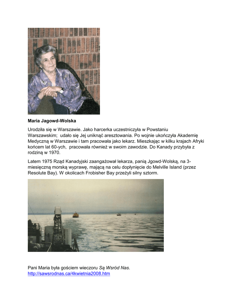 Maria Jagowd-Wolska Urodziła się w Warszawie. Jako harcerka uczestniczyła w Powstaniu Warszawskim; udało się Jej uniknąć aresztowania. Po wojnie ukończyła Akademię Medyczną w Warszawie i tam pracowała jako lekarz. Mieszkając w kilku krajach Afryki końcem lat 60-ych, pracowała również w swoim zawodzie. Do Kanady przybyła z rodziną w 1970. Latem 1975 Rząd Kanadyjski zaangażował lekarza, panią Jgowd-Wolską, na 3miesięczną morską wyprawę, mającą na celu dopłynięcie do Melville Island (przez Resolute Bay). W okolicach Frobisher Bay przeżyli silny sztorm. Pani Maria była gościem wieczoru Są Wsród Nas. http://sawsrodnas.ca/4kwietnia2008.htm