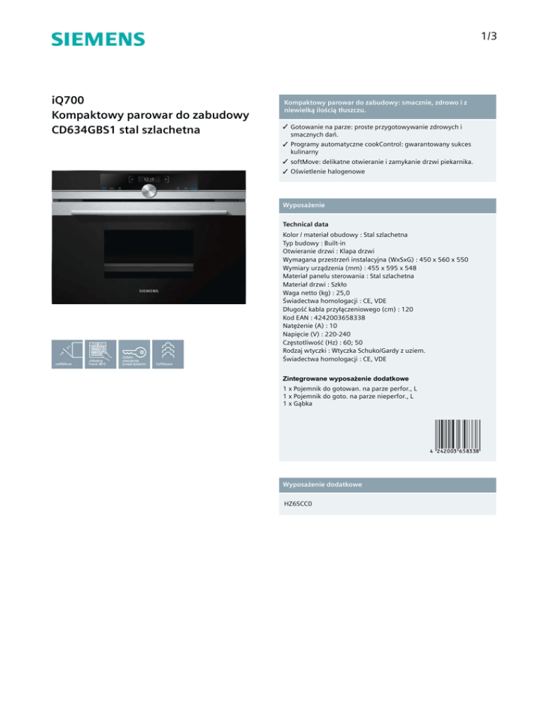 1/3 iQ700 Kompaktowy parowar do zabudowy CD634GBS1 stal szlachetna Kompaktowy parowar do zabudowy: smacznie, zdrowo i z niewielką ilością tłuszczu. ✓ Gotowanie na parze: proste przygotowywanie zdrowych i smacznych dań. ✓ Programy automatyczne cookControl: gwarantowany sukces kulinarny ✓ softMove: delikatne otwieranie i zamykanie drzwi piekarnika. ✓ Oświetlenie halogenowe Wyposażenie Technical data Kolor / materiał obudowy : Stal szlachetna Typ budowy : Built-in Otwieranie drzwi : Klapa drzwi Wymagana przestrzeń instalacyjna (WxSxG) : 450 x 560 x 550 Wymiary urządzenia (mm) : 455 x 595 x 548 Materiał panelu sterowania : Stal szlachetna Materiał drzwi : Szkło Waga netto (kg) : 25,0 Świadectwa homologacji : CE, VDE Długość kabla przyłączeniowego (cm) : 120 Kod EAN : 4242003658338 Natężenie (A) : 10 Napięcie (V) : 220-240 Częstotliwość (Hz) : 60; 50 Rodzaj wtyczki : Wtyczka Schuko/Gardy z uziem. Świadectwa homologacji : CE, VDE Zintegrowane wyposażenie dodatkowe 1 x Pojemnik do gotowan. na parze perfor., L 1 x Pojemnik do goto. na parze nieperfor., L 1 x Gąbka '!2E20AD-gfid i! Wyposażenie dodatkowe HZ6SCC0 2/3 iQ700 Kompaktowy parowar do zabudowy CD634GBS1 stal szlachetna Wyposażenie Typ piekarnika / rodzaje grzania: ● Kompaktowy parowar do zabudowy z 4 rodzajami grzania: para 100%, regeneracja, fermentacja, rozmrażanie ● Regulacja temperatury: 30 °C - 100 °C ● Pojemność: 38 l Komfort i bezpieczeństwo: ● ● Kolorowy wyświetlacz tekstowy TFT 2,8" z przyciskami sensorowymi Automatyczna propozycja temperatury Wyświetlacz aktualnej temperatury Kontrola rozgrzewania Ilość programów automatycznych ● zbiornik wody o pojemności 1.3 l ● Wskaźnik zapełnienia pojemnika na wodę ● Wewnętrzna strona drzwi w pełni szklana ● Temperatura na drzwiach piekarnika max. 40° C ● , softClose - miękkie domykanie drzwi, soft opening ● Programy automatyczne cookControl ● Zabezpieczenie przed uruchomieniem przez dzieci Wyłącznik bezpieczeństwa przycisk start wyłącznik kontaktowy drzwi ● Wielofunkcyjny zegar elektroniczny ● Oświetlenie wnętrza ● Dmuchawa chłodząca ● Przycisk informacyjny ● 1 x Pojemnik do gotowan. na parze perfor., L, 1 x Pojemnik do goto. na parze nieperfor., L, 1 x Gąbka Dane techniczne: ● Długość przewodu sieciowego: 120 cm ● Wartosc calk. przylacz.elektr.: 1.9 kW ● Wymiary (WxSxG): 455 mm x 595 mm x 548 mm 3/3 iQ700 Kompaktowy parowar do zabudowy CD634GBS1 stal szlachetna Rysunki wymiarowe