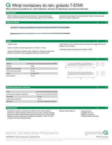 Wkręt montażowy do ram, gniazdo T-STAR Wkręt montażowy greenteQ do ram, z łbem stożkowym i walcowym do optymalnego mocowania ram okiennych. Właściwości: Wkręt montażowy do mocowania ram okiennych z tworzywa sztucznego, drewna, aluminium do betonu, kamienia pełnego, cegły i innych materiałów budowlanych wykazujących dużą wytrzymałość. Wkręt z hartowanej stali, powierzchnia jasno ocynkowana. Zdjęcie produktu: Zalety: • szybki montaż • gwint wkrętu do ram umożliwia trwałe mocowanie bez wygięcia profilu (ani podczas ani po montażu) • pewne i szybkie mocowanie gryfu gwintu w futrynie i w murze • optymalne przełożenie siły poprzez gniazdo T-STAR • dzięki różnej długości wkrętów z łbem stożkowym i walcowym możliwe jest dokładne mocowanie także w przypadku oddalonych od siebie ścian Dane techniczne: T-Star Średnica łba (stożkowego): 11 mm Średnica łba (walcowego): 8,5 mm Gwint: do blachy (ST) Średnica gwintu: 7,5 mm d stal hartowana, ocynkowana, pasywowana na niebiesko Gniazdo: L d Materiał: L Minimalna głębokość wkręcenia: beton: 30 mm (za pomocą wiertarki udarowej) pustak wapienno-piaskowy, cegła pełna: 40 mm (za pomocą wiertarki udarowej) beton lekki: 50 mm cegła kratówka/ dziurawka: 60 mm gazobeton: 60 mm (z conajmniej 2 ścianami) Zastosowanie: Podstawowy montaż w nawierconym otworze do 6mm średnicy oprócz gazobetonu. Wkręt montażowy należy mocować do ramy okiennej pod kątem prostym do podłoża. Długość wkrętu dobrać odpowiednio do rodzaju podłoża. Głębokość wywierconego otworu = głębokość wkręcenia + 10mm. W razie potrzeby zastosować zaślepkę wkrętu. Długość wkrętu zależy od: - szerokości ramy - odległości do muru - głębokości wkręcenia - rodzaju materiału (wg tabeli). KARTA TECHNICZNA PRODUKTU MOCOWANIE - Wkręt montażowy do ram, z gniazdem T-Star 07/2014 | www.vbh.de Instrukcje użytkowania, dane dotyczące produktu i jego osiągnięć oraz inne dane techniczne stanowią w odniesieniu do naszych produktów greenteQ jedynie ogólne wskazówki. Służą one do tylko opisu właściwości i budowy produktów i nie stanowią gwarancji w rozumieniu § 443 niemieckiego kodeksu cywilnego (BGB). Ze względu na szeroki zakres możliwych zastosowań naszych produktów obowiązkiem użytkownika jest sprawdzenie, czy dany produkt nadaje się do jego celów. Nasze doradztwo techniczne udzielane ustnie, pisemnie lub w postaci przeprowadzonej próby służy tylko do Państwa informacji i jest absolutnie niewiążące. Wkręt montażowy do ram, gniazdo T-STAR Wkręt montażowy greenteQ do ram, z łbem stożkowym i walcowym do optymalnego mocowania ram okiennych. Wymiary: Średnica [mm] Długość [mm] Opakowanie Nr art. VBH (łeb stożkowy) Nr art. VBH (łeb walcowy) 7,5 42 100 388.696 / 0042 388.705 / 0042 7,5 62 100 388.696 / 0062 388.705 / 0062 7,5 72 100 388.696 / 0072 388.705 / 0072 7,5 82 100 388.696 / 0082 388.705 / 0082 7,5 92 100 388.696 / 0092 388.705 / 0092 7,5 102 100 388.696 / 0102 388.705 / 0102 7,5 112 100 388.696 / 0112 388.705 / 0112 7,5 122 100 388.696 / 0122 388.705 / 0122 7,5 132 100 388.696 / 0132 388.705 / 0132 7,5 152 100 388.696 / 0152 388.705 / 0152 7,5 182 100 388.696 / 0182 388.705 / 0182 7,5 212 100 388.696 / 0212 388.705 / 0212 7,5 252 100 388.696 / 0252 388.705 / 0252 7,5 300 100 388.696 / 0300 388.705 / 0300 Zaślepki (akcesoria do wkrętów z łbem stożkowym): Kolor dk [mm] h [mm] Opakowanie Nr art. VBH biały (RAL 9010) 16,5 2 1000 388.711 / 1000 brązowy (RAL 8016) 16,5 2 1000 388.711 / 0900 MOCOWANIE - Wkręt montażowy do ram, z gniazdem T-Star | 07/2014 | www.vbh.de Instrukcje użytkowania, dane dotyczące produktu i jego osiągnięć oraz inne dane techniczne stanowią w odniesieniu do naszych produktów greenteQ jedynie ogólne wskazówki. Służą one do tylko opisu właściwości i budowy produktów i nie stanowią gwarancji w rozumieniu § 443 niemieckiego kodeksu cywilnego (BGB). Ze względu na szeroki zakres możliwych zastosowań naszych produktów obowiązkiem użytkownika jest sprawdzenie, czy dany produkt nadaje się do jego celów. Nasze doradztwo techniczne udzielane ustnie, pisemnie lub w postaci przeprowadzonej próby służy tylko do Państwa informacji i jest absolutnie niewiążące.