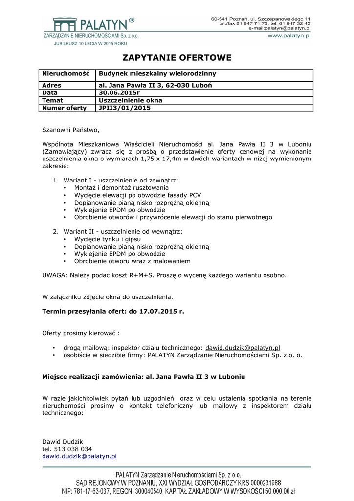 ZAPYTANIE OFERTOWE Nieruchomość Budynek mieszkalny wielorodzinny Adres Data Temat Numer oferty al. Jana Pawła II 3, 62-030 Luboń 30.06.2015r Uszczelnienie okna JPII3/01/2015 Szanowni Państwo, Wspólnota Mieszkaniowa Właścicieli Nieruchomości al. Jana Pawła II 3 w Luboniu (Zamawiający) zwraca się z prośbą o przedstawienie oferty cenowej na wykonanie uszczelnienia okna o wymiarach 1,75 x 17,4m w dwóch wariantach w niżej wymienionym zakresie: 1. Wariant I - uszczelnienie od zewnątrz: • Montaż i demontaż rusztowania • Wycięcie elewacji po obwodzie fasady PCV • Dopianowanie pianą nisko rozprężną okienną • Wyklejenie EPDM po obwodzie • Obrobienie otworów i przywrócenie elewacji do stanu pierwotnego 2. Wariant II - uszczelnienie od wewnątrz: • Wycięcie tynku i gipsu • Dopianowanie pianą nisko rozprężną okienną • Wyklejenie EPDM po obwodzie • Obrobienie otworu wraz z malowaniem UWAGA: Należy podać koszt R+M+S. Proszę o wycenę każdego wariantu osobno. W załączniku zdjęcie okna do uszczelnienia. Termin przesyłania ofert: do 17.07.2015 r. Oferty prosimy kierować : • • drogą mailową: inspektor działu technicznego: [email protected] osobiście w siedzibie firmy: PALATYN Zarządzanie Nieruchomościami Sp. z o. o. Miejsce realizacji zamówienia: al. Jana Pawła II 3 w Luboniu W razie jakichkolwiek pytań lub uzgodnień oraz w celu ustalenia spotkania na terenie nieruchomości prosimy o kontakt telefoniczny lub mailowy z inspektorem działu technicznego: Dawid Dudzik tel. 513 038 034 [email protected] Załącznik nr 1