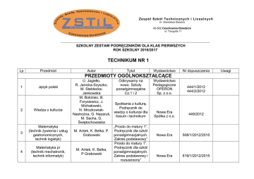 Zespół Szkół Techni cznych i Licealn ych im. Stanisława Staszica 43-502 Czechowice-Dziedzice ul. Traugutta 11 SZKOLNY ZESTAW PODRĘCZNIKÓW DLA KLAS PIERWSZYCH ROK SZKOLNY 2016/2017 TECHNIKUM NR 1 Lp Przedmiot Autor Tytuł Wydawnictwo Nr dopuszczenia PRZEDMIOTY OGÓLNOKSZTAŁCĄCE 1 Język polski 2 Wiedza o kulturze 3 Matematyka (technik żywienia i usług gastronomicznych, technik logistyk) 4 Matematyka pr (technik mechatronik, technik informatyk) U. Jagiełło, Odkrywamy na R. Janicka-Szyszko, nowo. Szkoły M. Stebleckaponadgimnazjalne Jankowska Cz.1 i 2 M. Bokiniec, B. Forysiewicz, J. Spotkania z kulturą. Michałowski, Podręcznik do N. Mrozkowiakwiedzy o kulturze dla Nastrożna, G. Nazaruk, liceum i technikum M. Sacha, G. Świętochowaska „Prosto do matury 1”. M. Antek, K. Belka, P. Podręcznik dla szkół Grabowski ponadgimnazjalnych. Zakres podstawowy” Prosto do matury 1”. Podręcznik dla szkół M. Antek, K. Belka, ponadgimnazjalnych. P.Grabowski Zakres podstawowy i rozszerzony” Wydawnictwo Pedagogiczne OPERON Sp. z o.o. 444/1/2012 444/2/2012 Nowa Era Spółka z o.o. 449/2012 Nowa Era 508/1/2012/2015 Nowa Era 619/1/2012/2015 Uwagi E. Bonar, W. Krzeszowiec-Jeleń, S. Czachorowski R.Hassa M. Brun 5 Biologia 6 7 Chemia Fizyka 8 Geografia B. Lenartowicz, M. Wójcik 9 Edukacja dla bezpieczeństwa J. Słoma Biologia na czasie Nowa Era 450/2012 To jest chemia Odkryć fizykę Czas na geografię – podręcznik i zeszyt ćwiczeń Żyję i działam bezpiecznie Nowa Era Nowa Era 438/2012 447/2012 Wyd. Szkolne PWN 355/2011 Nowa Era 426/2012 10 Język niemiecki Anna KryczyńskaPham Joanna Szczęk FOKUS 1 +zeszyt ćwiczeń 11 Podstawy przedsiębiorczości Jacek Musiałkiewicz Zarys przedsiębiorczości 695/1/2014 Ekonomik 763/2015 Uczniowie, którzy rozpoczynają naukę języka niemieckiego od podstaw (brak języka niemieckiego w gimnazjum) będą poinformowani o podręczniku na pierwszych zajęciach. PRZEDMIOTY ZAWODOWE Technik informatyk 1 Urządzenia techniki komputerowej T. Marciniuk, K. Pytel, S.Osetek 2 Montaż i eksploatacja urządzeń techniki komputerowej T. Marciniuk, K. Pytel, S.Osetek 3 Systemy operacyjne i sieci komputerowe T. Marciniuk, K. Pytel, S.Osetek 1.„Przygotowanie stanowiska komputerowego do pracy cz.1” 2. „Użytkowanie urządzeń peryferyjnych komputera osobistego” 1. „Naprawa komputera osobistego” 1.„Przygotowanie stanowiska komputerowego do pracy cz.2” 31/2013 WSiP 37/2013 Podręcznik zastępczy WSiP WSiP 32/2013 85/2013 Technik logistyk 1 Gospodarka magazynowa/Zarządzanie zapasami S. Krzyżowiak, A. Niemczyk, J.Majewski, P.Andrzejczak „Organizacja i monitorowanie procesów magazynowych” Biblioteka Logistyka 2 Podstawy logistyki Praca zbiorowa „Podstawy logistyki” Difin 3 Laboratorium magazynowe Brak podręcznika 1 2 Technologia gastronomiczna z towaroznawstwem Język angielski w gastronomii Technik żywienia i usług gastronomicznych Technologia M. Konarzewska gastronomiczna z Wyd.REA towaroznawstwem V.Evans, J.Dooley Cooking EGIS Podręcznik zastępczy 69/2013 Podręcznik zastępczy Przedmiot Autor Tytuł Wydawnictwo Nr dopuszczenia 1 Język angielski poziom podstawowy i rozszerzony Tima Falla Paul A Davis Joanna Sobierska Oxford Solutions. Student´s Book Podręcznik wieloletni Oxford 733/2/2015 t.mechatronik V.Evans,J.Dooley Electronics EGIS - t.informatyk t.mechanik t.logistyk t.żywienia i usług gastr. t.usług fryzjerskich B.Hill J.D.Dearholt M.Grussendorf English for IT 2 Mechanics English for logistics PEARSON EGIS Oxford - V.Evans. J.Dooley Cooking EGIS - V.Evans. J.Dooley Beaty Salon EGIS - 2 Język angielski zawodowy Lp