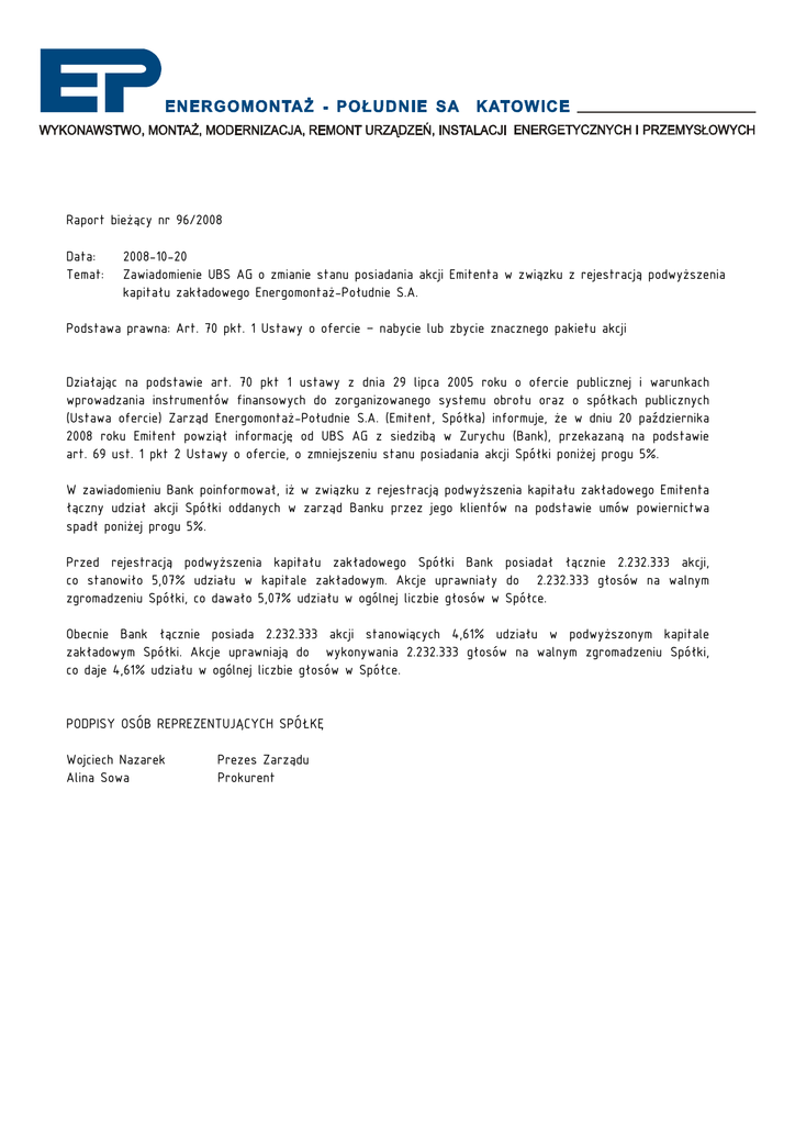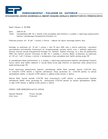 Raport bieżący nr 96/2008 Data: Temat: 2008-10-20 Zawiadomienie UBS AG o zmianie stanu posiadania akcji Emitenta w związku z rejestracją podwyższenia kapitału zakładowego Energomontaż-Południe S.A. Podstawa prawna: Art. 70 pkt. 1 Ustawy o ofercie – nabycie lub zbycie znacznego pakietu akcji Działając na podstawie art. 70 pkt 1 ustawy z dnia 29 lipca 2005 roku o ofercie publicznej i warunkach wprowadzania instrumentów finansowych do zorganizowanego systemu obrotu oraz o spółkach publicznych (Ustawa ofercie) Zarząd Energomontaż-Południe S.A. (Emitent, Spółka) informuje, że w dniu 20 października 2008 roku Emitent powziął informację od UBS AG z siedzibą w Zurychu (Bank), przekazaną na podstawie art. 69 ust. 1 pkt 2 Ustawy o ofercie, o zmniejszeniu stanu posiadania akcji Spółki poniżej progu 5%. W zawiadomieniu Bank poinformował, iż w związku z rejestracją podwyższenia kapitału zakładowego Emitenta łączny udział akcji Spółki oddanych w zarząd Banku przez jego klientów na podstawie umów powiernictwa spadł poniżej progu 5%. Przed rejestracją podwyższenia kapitału zakładowego Spółki Bank posiadał łącznie 2.232.333 akcji, co stanowiło 5,07% udziału w kapitale zakładowym. Akcje uprawniały do 2.232.333 głosów na walnym zgromadzeniu Spółki, co dawało 5,07% udziału w ogólnej liczbie głosów w Spółce. Obecnie Bank łącznie posiada 2.232.333 akcji stanowiących 4,61% udziału w podwyższonym kapitale zakładowym Spółki. Akcje uprawniają do wykonywania 2.232.333 głosów na walnym zgromadzeniu Spółki, co daje 4,61% udziału w ogólnej liczbie głosów w Spółce. PODPISY OSÓB REPREZENTUJĄCYCH SPÓŁKĘ Wojciech Nazarek Alina Sowa Prezes Zarządu Prokurent