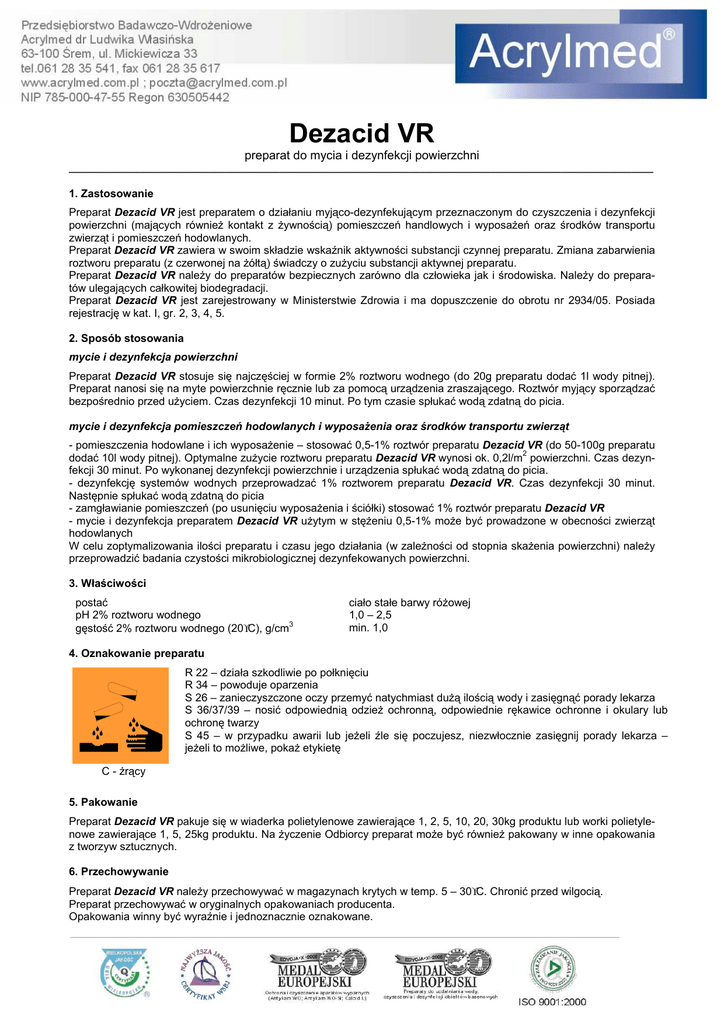 Dezacid VR preparat do mycia i dezynfekcji powierzchni ____________________________________________________________________________________________________________ 1. Zastosowanie Preparat Dezacid VR jest preparatem o działaniu myjąco-dezynfekującym przeznaczonym do czyszczenia i dezynfekcji powierzchni (mających również kontakt z żywnością) pomieszczeń handlowych i wyposażeń oraz środków transportu zwierząt i pomieszczeń hodowlanych. Preparat Dezacid VR zawiera w swoim składzie wskaźnik aktywności substancji czynnej preparatu. Zmiana zabarwienia roztworu preparatu (z czerwonej na żółtą) świadczy o zużyciu substancji aktywnej preparatu. Preparat Dezacid VR należy do preparatów bezpiecznych zarówno dla człowieka jak i środowiska. Należy do preparatów ulegających całkowitej biodegradacji. Preparat Dezacid VR jest zarejestrowany w Ministerstwie Zdrowia i ma dopuszczenie do obrotu nr 2934/05. Posiada rejestrację w kat. I, gr. 2, 3, 4, 5. 2. Sposób stosowania mycie i dezynfekcja powierzchni Preparat Dezacid VR stosuje się najczęściej w formie 2% roztworu wodnego (do 20g preparatu dodać 1l wody pitnej). Preparat nanosi się na myte powierzchnie ręcznie lub za pomocą urządzenia zraszającego. Roztwór myjący sporządzać bezpośrednio przed użyciem. Czas dezynfekcji 10 minut. Po tym czasie spłukać wodą zdatną do picia. mycie i dezynfekcja pomieszczeń hodowlanych i wyposażenia oraz środków transportu zwierząt - pomieszczenia hodowlane i ich wyposażenie – stosować 0,5-1% roztwór preparatu Dezacid VR (do 50-100g preparatu 2 dodać 10l wody pitnej). Optymalne zużycie roztworu preparatu Dezacid VR wynosi ok. 0,2l/m powierzchni. Czas dezynfekcji 30 minut. Po wykonanej dezynfekcji powierzchnie i urządzenia spłukać wodą zdatną do picia. - dezynfekcję systemów wodnych przeprowadzać 1% roztworem preparatu Dezacid VR. Czas dezynfekcji 30 minut. Następnie spłukać wodą zdatną do picia - zamgławianie pomieszczeń (po usunięciu wyposażenia i ściółki) stosować 1% roztwór preparatu Dezacid VR - mycie i dezynfekcja preparatem Dezacid VR użytym w stężeniu 0,5-1% może być prowadzone w obecności zwierząt hodowlanych W celu zoptymalizowania ilości preparatu i czasu jego działania (w zależności od stopnia skażenia powierzchni) należy przeprowadzić badania czystości mikrobiologicznej dezynfekowanych powierzchni. 3. Właściwości postać pH 2% roztworu wodnego gęstość 2% roztworu wodnego (20°C), g/cm3 ciało stałe barwy różowej 1,0 – 2,5 min. 1,0 4. Oznakowanie preparatu R 22 – działa szkodliwie po połknięciu R 34 – powoduje oparzenia S 26 – zanieczyszczone oczy przemyć natychmiast dużą ilością wody i zasięgnąć porady lekarza S 36/37/39 – nosić odpowiednią odzież ochronną, odpowiednie rękawice ochronne i okulary lub ochronę twarzy S 45 – w przypadku awarii lub jeżeli źle się poczujesz, niezwłocznie zasięgnij porady lekarza – jeżeli to możliwe, pokaż etykietę C - żrący 5. Pakowanie Preparat Dezacid VR pakuje się w wiaderka polietylenowe zawierające 1, 2, 5, 10, 20, 30kg produktu lub worki polietylenowe zawierające 1, 5, 25kg produktu. Na życzenie Odbiorcy preparat może być również pakowany w inne opakowania z tworzyw sztucznych. 6. Przechowywanie Preparat Dezacid VR należy przechowywać w magazynach krytych w temp. 5 – 30°C. Chronić przed wilgocią. Preparat przechowywać w oryginalnych opakowaniach producenta. Opakowania winny być wyraźnie i jednoznacznie oznakowane.