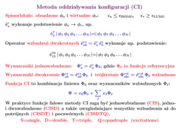 Metoda oddzialywania konfiguracji (CI) Spinorbitale: obsadzone φa i wirtualne φr : a ≤ HOMO, r ≥ LUMO êra wykonuje podstawienie φa → φr , np. ê72 | φ1 φ2 φ3 . . . φN |=| φ1 φ7 φ3 . . . φN | r s Operator wzbudzeń dwukrotnych êrs ab = êa êb wykonuje np. podstawienie: ê79 13 | φ1 φ2 φ3 . . . φN |=| φ7 φ2 φ9 . . . φN | Wyznaczniki jednowzbudzone: Φra = êra Φ0, gdzie Φ0 to funkcja referencyjna rs rst rst Wyznaczniki dwukrotnie Φrs = ê Φ i trójkrotnie Φ = ê 0 ab ab abc abc Φ0 wzbudzone Funkcja CI to kombinacja liniowa Φ0 oraz wyznaczników wzbudzonych ΦI : X Ψ = c0Φ0 + cI ΦI I W praktyce funkcje falowe metody CI mga, być jednowzbudzone (CIS), jednoi dwuwzbudzone (CISD) a także uwzgledniaj ace wszystkie wzbudzenia aż do , , potrójnych (CISDT) i poczwórnych (CISDTQ). S=single, D=double, T=triple, Q=quadruple (excitations) Najważniejsze warianty metody CI Metoda CIS: Ψ = c0Φ0 + X car Φra ar Jeśli Φ0 jest wyznacznikiem HF to otrzymujemy zerowa, energie korelacji ze wzgledu na bardzo ważne Twierdzenie Brillouina , Z Z ΦraĤΦ0dτ = 0 lub hΦra|ĤΦ0i = 0, notacja : Ψ∗1 Ψ2 dτ ≡ hΨ1|Ψ2i Metoda CIS daje jednak czesto sensowne przybliżenia do energii wzbudzeń , elektronowych X XX Metoda CISD: a r rs Ψ = c0Φ0 + cr Φa + cab rs Φab ar a<b r<s Jest dziś bardzo rzadko stosowana ze wzgledu na brak ekstensywności energii. , Podobnie jest w przypadku nieco tylko dokladniejszej metody CISDT oraz w przypadku znacznie dokladniejszej metody CISDTQ Metoda FCI Ψ = c0Φ0 + X cI ΦI I N uwzglednia wszystkie wyznaczniki (∼M ) jakie można skonstruować dla N , elektronów przy użyciu bazy M orbitali. Jest najdokladniejsza i najdroższa. Równania metody CI Funkcje, Ψ = c0Φ0 + X car êra Φ0 + ar XX rs cab ê rs ab Φ0 + · · · a<b r<s można też zapisać nasteepuj aco: , , X XX a r rs Ψ = (c0 + cr êa + cab ê rs ab + · · ·) Φ0 = (c0 + Ĉ)Φ0 ar a<b r<s gdzie Ĉ to jest operator CI: X XX a r rs Ĉ = cr êa + cab rs êab + · · · = Ĉ1 + Ĉ2 + · · · ar a<b r<s Wspólczynniki c0, car, cab rs , ... etc. znajdujemy metoda, wariacyjna, minimalizujac , funkcjonal energii: hΨ|ĤΨi E[c0, Ĉ] = hΨ|Ψi gdzie Ψ = (c0 + Ĉ)Φ0. Wspólczynniki c0, car, cab rs , ... etc. oraz energie ukladu znajduje sie, wtedy diagonalizujac , macierz: HIJ = hΦI |ĤΦJ i gdzie przez ΦI oznaczamy wyznaczniki Φ0, êra Φ0, êrs ab Φ0 ,... etc. Równania metody CI, c.d. Wartości wlasne macierzy HIJ , oznaczmy je przez EI , stanowia, górne ograniczenie dokladnych wartości wlasnych równania Schrödngera, czyli prawdziwych wartości energii czasteczki EI , Ei ≤ EI Jest to tzw. twierdzenie MacDonalda - bardzo ważne w praktyce. W praktyce operator Ĉ obcinamy np. do wzbudzeń K-krotnych: Ĉ = Ĉ1 + Ĉ2 + · · · + ĈK . Dokladność wariantów metody CI Metoda CI Operator Ĉ CID CISD CISDT CISDTQ FCI Ĉ2 Ĉ1 + Ĉ2 Ĉ1 + Ĉ2 + Ĉ3 Ĉ1 + Ĉ2 + Ĉ3 + Ĉ4 Ĉ1 + Ĉ2 + Ĉ3 + · · · + Ĉ10 Skalowanie Blad , FH n6 n6 n8 n10 n! 10.3 9.4 7.0 0.3 0.0 Blad , H2 O 13.7 12.9 10.6 0.4 0.0 Baza DZP. Blad , w millihartree, 1 mhartree = 0.627 kcal/mol. Rachunek zaburzeń Møllera-Plesseta (teoria MP) Wady teorii CI: • powolna zbieżność ze wzrostem krotności K uwzglednianych wzbudzeń , • brak konsystencji rozmiarowej dla gdy K < N • brak ekstensywności√energii korelacji dla krysztalów i polimerów (energia korelacji rośnie jak n, gdzie n jest liczba, atomów w ukladzie) Wad tych nie ma teoria MP. W teorii tej dzielimy Hamiltonian nastepuj aco: , , Ĥ = Ĥ(λ) = Ĥ0 + λŴ gdzie Ĥ0 = N X fˆ(~ ri) i=1 jest suma operatorów Focka dla wszystkich elektronów a Ŵ = Ĥ − Ĥ0. Istotne jest to że: Ĥ0Φ0 = E0Φ0 gdzie Φ0 jest funkcja, HF a E0 jest suma energii orbitalnych E0 = P oraz to że Ŵ jest operatorem dwuczastkowym Ŵ = ij g(~ ri, ~ rj ). , P a a Teoria MP, c.d. Po podstawieniu Ĥ → Ĥ(λ) do pelnych równań CI (równań FCI) operator Ĉ i energia E staja, sie, funkcjami λ i moga, być rozwiniete w szereg (Taylora): , Ĉ(λ) = Ĉ (0) + λĈ (1) + λ2Ĉ (2) + · · · E(λ) = E (0) + λE (1) + λ2E (2) + · · · Wstawiajac do równań FCI można bardzo latwo pokazać że: , te rozwiniecia , Ĉ (0) = 0 E (0) + E (1) = hΦ0|ĤΦ0i = EHF E (2) = hΦ0|Ŵ Ĉ (1)Φ0i Ĉ (1) = XX hab||rsi a<b r<s a + b − r − s êrs ab gdzie hpq||rsi = hpq|rsi−hpq|sri to antysymetryzowana calka dwuelektronowa Z Z 1 ∗ ∗ hpq|rsi = φp(~ r1) φq (~ r2) φr (~ r1) φs (~ r2) dτ1dτ2 |~ r1 − ~ r2| Teoria MP (czyli MPPT lub MBPT), dokończenie (1) (2) Wstawiajac operator Ĉ do wzoru na E otrzymujemy energie, teorii MP2: , 2 XX |hab||rsi| E (2) = + b − r − s a<b r<s a Jest to najważniejszy i najprostszy wzór na energie, korelacji elektronowej. Czas obliczeń MP2 skaluje sie jak n5 z rozmiarem ukladu n. Poprawka E (2) i wszystkie wyższe poprawki teorii MP sa, ekstensywne. E (2) wyprowadzili fizycy (Møller i Plesset) w 1930 r, E (3) - Bartlett i Silver w 1974, E (4) - Wilson i Silver w 1979, E (5) - Kucharski i Bartlett w 1986 r. Ogólny przepis (twierdzenie o diagramach zwiazanych) - Goldstone w 1957 r. , Teoria Operator Ĉ MP2 MP3 MP4 -E(4)(Ĉ3) MP4 MP5 MP6 Ĉ2 Ĉ2 Ĉ1, Ĉ1, Ĉ1, Ĉ1, Ĉ2 Ĉ2, Ĉ3 Ĉ2, Ĉ3 Ĉ2, Ĉ3, Ĉ4 Skalowanie Blad , FH n5 n6 n6 n7 n8 n9 7.8 5.4 2.8 -0.3 0.8 0.2 Blad , H2 O 13.0 7.2 4.4 0.9 0.7 0.1 Teoria sprzeżonych klasterów, coupled-cluster (CC) theory , Sa, przyklady rozbieżności teori MP. Potrzeba wiec teorii nieperturbacyjnej, , lepszej od CI. Taka, teoria, jest teoria CC. Teoria CI jest nieekstensywna ponieważ operator 1 + Ĉ jest nieekstensywny. Okazuje sie, , że logarytm operatora 1 + Ĉ jest ekstensywny! Glówna idea teorii CC polega na tym aby obliczać nie Ĉ ale operator T̂ = ln(1 + Ĉ). T̂ = ln(1 + Ĉ) = Ĉ − 1 2 Ĉ 2 + 1 3 Ĉ 3 + · · · T̂ jest dobrze zdefiniowany bo szereg ten jest zawsze zbieżny (bo Ĉ N +1 = 0). 1 + Ĉ = exp(T̂ ) = 1 + T̂ + 1 2! 2 T̂ + 1 3! T̂ 3 + · · · Oczywiście T̂ = 