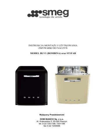 INSTRUKCJA MONTAśU I UśYTKOWANIA ZMYWARKI DO NACZYŃ MODEL BLV1 (BOMBINA) oraz ST1FAB Wyłączny Przedstawiciel DOM BIANCO Sp. z o.o. Al. Krakowska 5, 05-090 Raszyn tel. 0-22 7201198, 7201199 fax 0-22 7200688 Szanowny Kliencie. Dziękujemy za wybór tego urządzenia. W celu zrozumienia, jak w sposób poprawny i bezpieczny uŜywać zmywarki doradzamy uwaŜne przeczytanie wszystkich zawartych w tym podręczniku instrukcji. Podręcznik jest podzielony na rozdziały, które krok po kroku opisują funkcje zmywarki z jasnymi instrukcjami postępowania, którym towarzyszą obrazki. W podręczniku zawarte są zalecenia odnośnie poprawnego sposobu obsługi koszy, ramion natrysku, pojemników, filtrów, programów zmywania oraz układu sterowania. Aby zapewnić, Ŝe zmywarka pozostanie w doskonałym stanie naleŜy postępować zgodnie z procedurami czyszczenia. Podręcznik ten stanowi szybki i prosty w uŜyciu informator odpowiadający na wszystkie pytania dotyczące codziennego uŜywania nowej zmywarki. 2 1. ZASADY BEZPIECZEŃSTWA NINIEJSZA INSTRUKCJA STANOWI NIEODŁĄCZNĄ CZĘŚĆ URZĄDZENIA: MUSI ONA BYĆ PRZECHOWYWANA W STANIE NIENARUSZONYM RAZEM ZE ZMYWARKĄ. ZANIM ZACZNIESZ KORZYSTAĆ Z URZĄDZENIA UWAśNIE PRZECZYTAJ WSZYSTKIE ZAWARTE W TYM PODRĘCZNIKU INSTRUKCJE. INSTALACJĘ MUSI PRZEPROWADZIĆ WYKWALIFIKOWANY TECHNIK, ZGODNIE Z OBOWIĄZUJĄCYMI PRZEPISAMI. NINIEJSZE URZĄDZENIE JEST PRZEZNACZONE DO UśYTKU DOMOWEGO I JEST ZGODNE Z OBECNIE OBOWIĄZUJĄCYMI DYREKTYWAMI ZAWIERAJĄCYMI WYMAGANIA ODNOŚNIE ELIMINACJI ZAKŁÓCEŃ RADIOELEKTRYCZNYCH. URZĄDZENIE JEST PRZEZNACZONE DO NASTĘPUJĄCYCH CELÓW: MYCIA I SUSZENIA NACZYŃ. KAśDY INNY SPOSÓB UśYCIA UWAśANY JEST ZA NIEWŁAŚCIWY. PRODUCENT ZRZEKA SIĘ ODPOWIEDZIALNOŚCI ZA URZĄDZENIE W SYTUACJI GDY BĘDZIE ONO UśYWANE DO CELÓW INNYCH NIś OPISANE POWYśEJ. TABLICZKA ZNAMIONOWA ZAWIERAJĄCA DANE TECHNICZNE, NUMER SERYJNY I OZNACZENIA JEST UMIESZCZONA W SPOSÓB WIDOCZNY NA WEWNĘTRZNEJ KRAWĘDZI DRZWI. TABLICZKA ZNAMIONOWA NIE MOśE BYĆ USUNIĘTA. NIE ZOSTAWIAJ W DOMU BEZ NADZORU MATERIAŁÓW Z WYRZUCANEGO OPAKOWANIA. ODDZIEL O SIEBIE RÓśNE MATERIAŁY Z KTÓRYCH ZROBIONE JEST OPAKOWANIE I PRZEKAś JE DO NAJBLIśSZEGO PUNKTU SKUPU SUROWCÓW WTÓRNYCH. ZGODNIE Z OBOWIĄZUJĄCYMI PRZEPISAMI BEZPIECZEŃSTWA URZĄDZEŃ ELEKTRYCZNYCH, URZĄDZENIE MUSI BYĆ UZIEMIONE. PRODUCENT ZRZEKA SIĘ CAŁEJ ODPOWIEDZIALNOŚCI ZA SZKODY NA OSOBIE LUB MIENIU WYNIKAJĄCE Z NIE UZIEMIENIA URZĄDZENIA LUB WADLIWEJ INSTALACJI UZIEMIAJĄCEJ. W PRZYPADKU GDY URZĄDZENIE JEST PODŁĄCZANE BEZPOŚREDNIO DO ŹRÓDŁA ZASILANIA (A NIE ZA POMOCĄ WTYCZKI), NIEZBĘDNE JEST ZAINSTALOWANIE PRZEŁĄCZNIKA IZOLUJĄCEGO, KTÓREGO STYKI W STANIE ROZWARCIA SĄ ODDALONE OD SIEBIE O CO NAJMNIEJ 3 MM. WTYCZKA NA PRZEWODZIE ZASILAJĄCYM I ODPOWIADAJĄCY JEJ OTWÓR GNIAZDA MUSZĄ BYĆ TEGO SAMEGO TYPU I MUSZĄ ODPOWIADAĆ WYMAGANIOM OBOWIĄZUJĄCYCH PRZEPISÓW. SPRAWDŹ CZY NAPIĘCIE I CZĘSTOTLIWOŚĆ ŹRÓDŁA ZASILANIA ODPOWIADAJĄ PODANYM NA TABLICZCE ZNAMIONOWEJ. UNIKAJ STOSOWANIA ROZGAŁĘZIACZY LUB BOCZNIKOWANIA POŁĄCZEŃ. NIGDY NIE WYŁĄCZAJ URZĄDZENIA Z SIECI CIĄGNĄC ZA KABEL ZASILANIA. ZAWSZE CIĄGNIJ ZA WTYCZKĘ. INSTALACJI URZĄDZENIA NALEśY DOKONAĆ W TAKI SPOSÓB, ABY WTYCZKA NA PRZEWODZIE ZASILAJĄCYM ZNAJDOWAŁA SIĘ W ŁATWO DOSTĘPNYM MIEJSCU. W PRZYPADKU USZKODZENIA KABLA ZASILANIA POWINIEN BYĆ ON WYMIENIONY PRZEZ WYKWALIFIKOWANEGO TECHNIKA. PO WYMIANIE KABLA ZASILANIA UPEWNIJ SIĘ śE KLAMRA MOCUJĄCA KABEL ZASILAJĄCY JEST DOBRZE DOKRĘCONA. 3 JEŚLI URZĄDZENIE JEST INSTALOWANE NA PODŁODZE POKRYTEJ DYWANEM LUB INNĄ WYKŁADZINĄ UPEWNIJ SIĘ śE OTWORY W JEGO DNIE NIE SĄ ZASŁONIĘTE. ABY ZAPOBIEC STRATOM PRĄDU ZAWSZE PO UśYCIU WYŁĄCZ ZMYWARKĘ PRZED WYRZUCENIEM NA ŚMIETNIK URZĄDZENIE NALEśY UCZYNIĆ NIEZDATNYM DO UśYTKU. W TYM CELU PO ODŁĄCZENIU Z SIECI ODETNIJ GŁÓWNY KABEL ZASILANIA I ZABEZPIECZ WSZYSTKIE ELEMENTY, KTÓRE MOGĄ BYĆ NIEBEZPIECZNE DLA DZIECI (ZAMKI, DRZWI, ITP.). URZĄDZENIE NALEśY WYWIEŹĆ DO PUNKTU SKUPU SUROWCÓW WTÓRNYCH. W PRZYPADKU JAKIEGOKOLWIEK USZKODZENIA, ODŁĄCZ ZMYWARKĘ OD ŹRÓDŁA ZASILANIA, ZAKRĘĆ ZAWÓR WLOTOWY WODY, A NASTĘPNIE ZADZWOŃ PO WYKWALIFIKOWANEGO TECHNIKA. NIE UśYWAJ URZĄDZEŃ KTÓRE ULEGŁY USZKODZENIU W TRAKCIE TRANSPORTU! JEŚLI MASZ WĄTPLIWOŚCI PORADŹ SIĘ SWOJEGO DOSTAWCY. URZĄDZENIE MUSI ZOSTAĆ ZAMONTOWANE PRZEZ WYKWALIFIKOWANEGO TECHNIKA LUB ZGODNIE Z INSTRUKCJĄ DOSTARCZONĄ PRZEZ PRODUCENTA. URZĄDZENIE JEST PRZEZNACZONE DO UśYTKU PRZEZ DOROSŁYCH. NIE POZWALAJ DZIECIOM ZBLIśAĆ SIĘ I BAWIĆ SIĘ ZMYWARKĄ. TRZYMAJ DZIECI Z DALEKA OD DETERGENTÓW I OTWARTYCH DRZWI ZMYWARKI. NIE NALEśY ZOSTAWIAĆ W ZASIĘGU DZIECI ELEMENTÓW OPAKOWANIA (PLASTYKOWYCH TOREB, STYROPIANU, METALOWYCH PRĘTÓW ITP.). TRZYMAJ DZIECI Z DALEKA OD OTWARTYCH DRZWI ZMYWARKI. URZĄDZENIE MOśE ZAWIERAĆ POZOSTAŁOŚCI DETERGENTÓW, KTÓRE MOGĄ SPOWODOWAĆ NIEODWRACALNE USZKODZENIE OCZU, UST, GARDŁA A NAWET W PEWNYCH SYTUACJACH ŚMIERĆ PRZEZ UDUSZENIE. NIE UśYWAJ ROZPUSZCZALNIKÓW TAKICH JAK ALKOHOL LUB TERPENTYNA, KTÓRE MOGĄ SPOWODOWAĆ WYBUCH. NIE WKŁADAJ NACZYŃ ZABRUDZONYCH POPIOŁEM, WOSKIEM LUB FARBĄ. OPIERANIE SIĘ O DRZWI LUB SIADANIE NA NICH MOśE SPOWODOWAĆ PRZEWRÓCENIE SIĘ URZĄDZENIA, NARAśAJĄC TYM SAMYM LUDZI NA NIEBEZPIECZEŃSTWO. NIE PIJ POZOSTAŁOŚCI WODY, KTÓRE MOGĄ ZNAJDOWAĆ SIĘ W NACZYNIACH LUB ZMYWARCE PRZED ZAKOŃCZENIEM PROGRAMU MYJĄCEGO I PRZED CYKLEM SUSZENIA. MODELE WYPOSAśONE W URZĄDZENIE AQUASTOP. URZĄDZENIE AQUASTOP ZABEZPIECZA PRZED ZALANIEM POMIESZCZENIA W PRZYPADKU PRZECIEKU WODY. W SYTUACJI GDY URZĄDZENIE AQUASTOP WYŁĄCZY SAMOCZYNNIE ZMYWARKĘ ZADZWOŃ PO WYKWALIFIKOWANEGO TECHNIKA ABY ZIDENTYFIKOWAŁ I USUNĄŁ USZKODZENIE. W MODELACH WYPOSAśONYCH W URZĄDZENIE AQUASTOP WEWNĄTRZ PRZEWODU WLOTOWEGO WODY ZNAJDUJE SIĘ ZAWÓR ELEKTROMAGNETYCZNY. NIE PRZECINAJ PRZEWODU I NIE POZWÓL ABY ZAWÓR ELEKTROMAGNETYCZNY WPADŁ DO WODY. 
