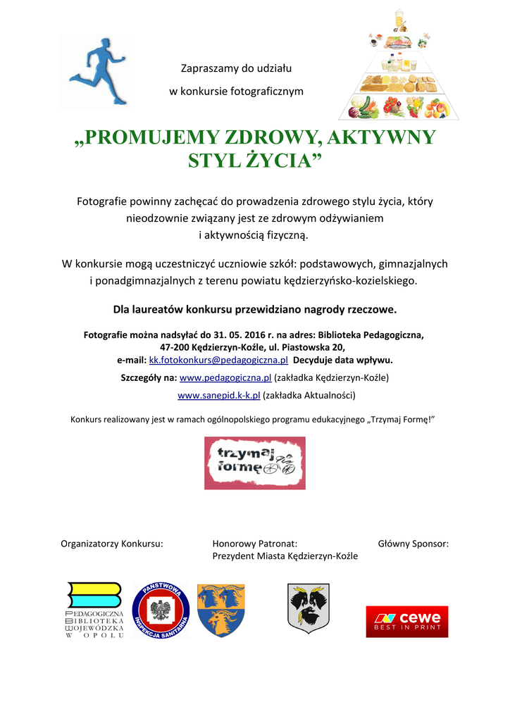 Zapraszamy do udziału w konkursie fotograficznym „PROMUJEMY ZDROWY, AKTYWNY STYL ŻYCIA” Fotografie powinny zachęcać do prowadzenia zdrowego stylu życia, który nieodzownie związany jest ze zdrowym odżywianiem i aktywnością fizyczną. W konkursie mogą uczestniczyć uczniowie szkół: podstawowych, gimnazjalnych i ponadgimnazjalnych z terenu powiatu kędzierzyńsko-kozielskiego. Dla laureatów konkursu przewidziano nagrody rzeczowe. Fotografie można nadsyłać do 31. 05. 2016 r. na adres: Biblioteka Pedagogiczna, 47-200 Kędzierzyn-Koźle, ul. Piastowska 20, e-mail: [email protected] Decyduje data wpływu. Szczegóły na: www.pedagogiczna.pl (zakładka Kędzierzyn-Koźle) www.sanepid.k-k.pl (zakładka Aktualności) Konkurs realizowany jest w ramach ogólnopolskiego programu edukacyjnego „Trzymaj Formę!” Organizatorzy Konkursu: Honorowy Patronat: Prezydent Miasta Kędzierzyn-Koźle Główny Sponsor: