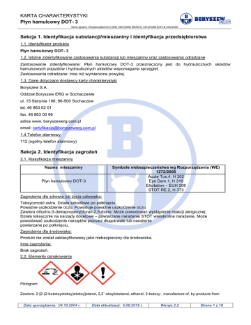 KARTA CHARAKTERYSTYKI Płyn hamulcowy DOT- 3 Karta zgodna z Rozporządzeniem (WE) 1907/2006 (REACH), 1272/2008 (CLP) & 453/2010 Sekcja 1. Identyfikacja substancji/mieszaniny i identyfikacja przedsiębiorstwa 1.1. Identyfikator produktu Płyn hamulcowy DOT- 3 1.2. Istotne zidentyfikowane zastosowania substancji lub mieszaniny oraz zastosowania odradzane Zastosowanie zidentyfikowane: Płyn hamulcowy DOT-3 przeznaczony jest do hydraulicznych układów hamulcowych pojazdów i hydraulicznych układów wspomagania sprzęgieł. Zastosowania odradzane: inne niż wymienione powyżej. 1.3. Dane dotyczące dostawcy karty charakterystyki Boryszew S.A. Oddział Boryszew ERG w Sochaczewie ul. 15 Sierpnia 106; 96-500 Sochaczew tel. 46 863 02 01 fax. 46 863 00 96 adres www: boryszewerg.com.pl email: [email protected] 1.4.Telefon alarmowy 112 (ogólny telefon alarmowy) Sekcja 2. Identyfikacja zagrożeń 2.1. Klasyfikacja mieszaniny Symbole niebezpieczeństwa wg Rozporządzenia (WE) 1272/2008 Acute Tox.4, H 302 Eye Dam.1, H 318 Elicitation – EUH 208 STOT RE 2, H 373 Nazwa mieszaniny Płyn hamulcowy DOT-3 Zagrożenia dla zdrowia lub życia człowieka: Toksyczność ostra. Działa szkodliwie po połknięciu. Poważne uszkodzenie oczu. Powoduje poważne uszkodzenie oczu. Zawiera dihydro-3-(tetrapropenyl)furan-2,5-dione. Może powodować wystąpienie reakcji alergicznej. Działa toksycznie na narządy docelowe – powtarzane narażenie STOT wielokrotne narażenie. Może powodować uszkodzenie narządów poprzez długotrwałe lub narażenie powtarzane po połknięciu. Zagrożenia dla środowiska: Produkt nie został zaklasyfikowany jako niebezpieczny dla środowiska. Inne zagrożenia: Brak zagrożeń. 2.2. Elementy oznakowania Piktogram Zawiera: 2-[2-(2-butoksyetoksy)etoksy]etanol, 2,2`-oksybisetanol, ethanol, 2-butoxy-, manufacture of, by-products from Data sporządzenia: 04.10.2004 r. Data aktualizacji: 5.08.2015 r. Wersja 2.2 Strona 1 z 18 KARTA CHARAKTERYSTYKI Płyn hamulcowy DOT- 3 Karta zgodna z Rozporządzeniem (WE) 1907/2006 (REACH), 1272/2008 (CLP) & 453/2010 Hasło ostrzegawcze: Niebezpieczeństwo Zwroty H: H302 Działa szkodliwie po połknięciu. H318 Powoduje poważne uszkodzenie oczu. H373 Może powodować uszkodzenie narządów poprzez długotrwałe lub narażenie powtarzane po połknięciu. EUH208 Zawiera dihydro-3-(tetrapropenyl)furan-2,5-dione. Może powodować wystąpienie reakcji alergicznej. Zwroty P: P260 Nie wdychać par/rozpylonej cieczy. P264 Dokładnie umyć zanieczyszczoną skórę po użyciu. P280 Stosować rękawice ochronne/odzież ochronną/ochronę oczu/ochronę twarzy. P305+P351+P338 W PRZYPADKU DOSTANIA SIĘ DO OCZU: Ostrożnie płukać wodą przez kilka minut. Wyjąć soczewki kontaktowe, jeżeli są i można je łatwo usunąć. Nadal płukać. P310 Natychmiast skontaktować się z OŚRODKIEM ZATRUĆ/lekarzem. P501 Zawartość/pojemnik usuwać do punktu selektywnej zbiórki odpadów 2.3. Inne zagrożenia Brak informacji na temat spełnienia kryteriów PBT lub vPvB zgodnie z załącznikiem XIII rozporządzenia REACH. Odpowiednie badania nie były przeprowadzone. Sekcja 3. Skład/ Informacje o składnikach 3.1. Substancje Nie dotyczy 3.2. Mieszaniny Nazwa substancji Zakres stężeń [%] Numer CAS Numer WE Symbole niebezpieczeństwa * 2-[2-(2butoksyetoksy)eto ksy]etanol 2,2`-oksybisetanol 25-<50 143-22-6 205-592-6 Rozporządzenie (WE) 1272/2008 Eye Dam. 1 – H 318 25-<50 111-46-6 203-872-2 ethanol, 2-butoxy-, manufacture of, by-products from 5-<10 161907-77-3 310-287-7 < 0,025 67-56-1 200-659-6 Acute Tox. 4 – H 302 STOT RE 2 – H 373 Eye Dam.1; H 318 (złożona mieszanina składników, substancja UVCB o zmiennym składzie) Metanol Flam. Liq. 2 - H225 Acute Tox. 3 - H301 Acute Tox. 3 - H311 Acute Tox. 3 - H331 STOT SE 1 - H370 Nr rejestracji: 2-[2-(2-butoksyetoksy)etoksy]etanol – 01-2119475107-38-XXXX Nr rejestracji 2,2’-oksybisetanol: 01-2119457857-21-XXXX * Patrz sekcja 16 Sekcja 4. Środki pierwszej pomocy 4.1. Opis środków pierwszej pomocy Wdychanie: przy wystąpieniu trudności z oddychaniem podawać tlen. Wynieść poszkodowanego na świeże powietrze. Skóra: przemyć wodą z mydłem. Data sporządzenia: 04.10.2004 r. Data aktualizacji: 5.08.2015 r. Wersja 2.2 Strona 2 z 18 KARTA CHARAKTERYSTYKI Płyn hamulcowy DOT- 3 Karta zgodna z Rozporządzeniem (WE) 1907/2006 (REACH), 1272/2008 (CLP) & 453/2010 natychmiast przemyć oczy dużą ilością bieżącej wody przy szeroko otwartych powiekach przez co najmniej 15 minut. Usunąć szkła kontaktowe. Unikać silnego strumienia – ryzyko uszkodzenia rogówki. Połknięcie: wezwać natychmiast pomoc lekarską. Pokazać etykietę lub opakowanie. Oczy: 4.2. Najważniejsze ostre i opóźnione objawy oraz skutki narażenia Wdychanie: Długotrwałe wdychanie wysokich stężeń może uszkodzić układ oddechowy. Kaszel. Nadmierne narażenie na działanie rozpuszczalników organicznych może powodować hamowanie czynności ośrodkowego układu nerwowego, powodując zawroty głowy i zatrucia, a przy bardzo wysokich stężeniach utratę przytomności i śmierć. Połknięcie: Może powodować uczulenia lub reakcje alergiczne i osób wrażliwych. Objawy żołądkowojelitowe, w tym rozstrój żołądka. Opary z zawartości żołądka mogą być wdychane, powodując takie same objawy, jak przy inhalacji. Kontakt ze skórą : Może powodować uczulenie lub reakcję alergiczną u osób wrażliwych. Długotrwały kontakt może powodować wysuszenie skóry. Kontakt z oczami Działa drażniąco na oczy. Objawy następujące po nadmiernej ekspozycji mogą być następujące: Ból. Obficie obmywać oczy. Zaczerwienienie. 4.3. Wskazania dotyczące wszelkiej natychmiastowej pomocy lekarskiej i szczególnego postępowania z poszkodowanym. W przypadku wystąpienia jakichkolwiek dolegliwości wezwać niezwłocznie lekarza lub przetransportować poszkodowanego do szpitala. Sekcja 5. Postępowanie w przypadku pożaru 5.1. Środki gaśnicze Odpo