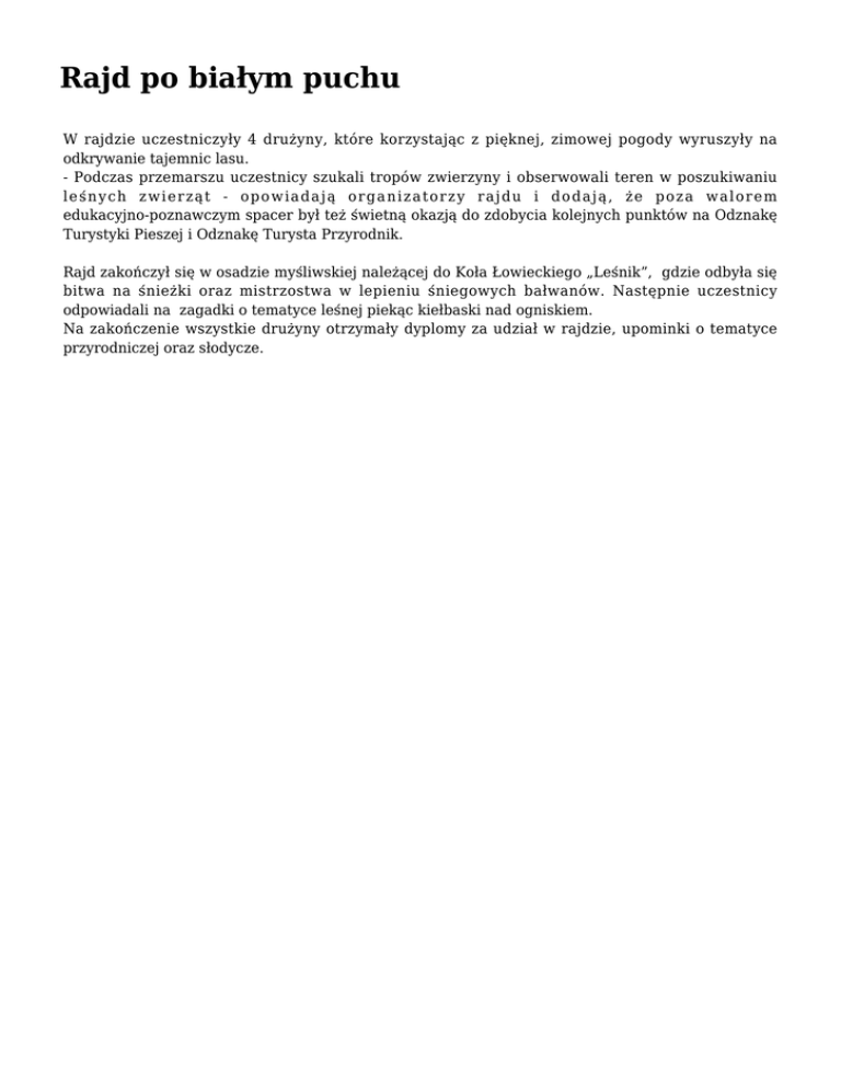 Rajd po białym puchu W rajdzie uczestniczyły 4 drużyny, które korzystając z pięknej, zimowej pogody wyruszyły na odkrywanie tajemnic lasu. - Podczas przemarszu uczestnicy szukali tropów zwierzyny i obserwowali teren w poszukiwaniu leśnych zwierząt - opowiadają organizatorzy rajdu i dodają, że poza walorem edukacyjno-poznawczym spacer był też świetną okazją do zdobycia kolejnych punktów na Odznakę Turystyki Pieszej i Odznakę Turysta Przyrodnik. Rajd zakończył się w osadzie myśliwskiej należącej do Koła Łowieckiego „Leśnik”, gdzie odbyła się bitwa na śnieżki oraz mistrzostwa w lepieniu śniegowych bałwanów. Następnie uczestnicy odpowiadali na zagadki o tematyce leśnej piekąc kiełbaski nad ogniskiem. Na zakończenie wszystkie drużyny otrzymały dyplomy za udział w rajdzie, upominki o tematyce przyrodniczej oraz słodycze.