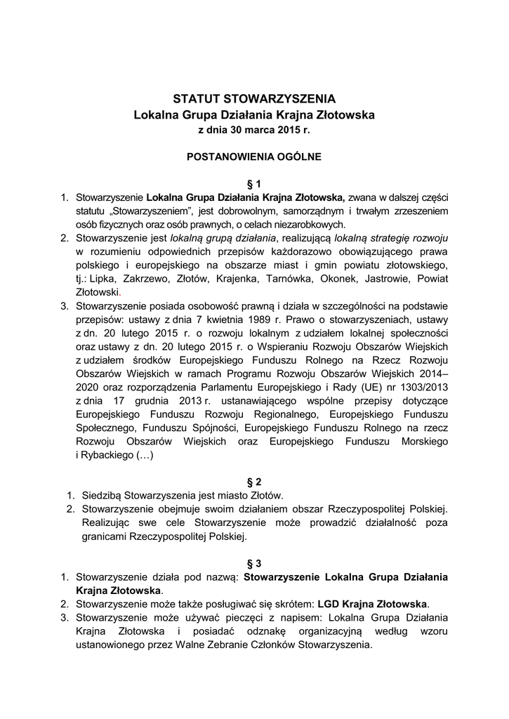 STATUT STOWARZYSZENIA Lokalna Grupa Działania Krajna Złotowska z dnia 30 marca 2015 r. POSTANOWIENIA OGÓLNE §1 1. Stowarzyszenie Lokalna Grupa Działania Krajna Złotowska, zwana w dalszej części statutu „Stowarzyszeniem”, jest dobrowolnym, samorządnym i trwałym zrzeszeniem osób fizycznych oraz osób prawnych, o celach niezarobkowych. 2. Stowarzyszenie jest lokalną grupą działania, realizującą lokalną strategię rozwoju w rozumieniu odpowiednich przepisów każdorazowo obowiązującego prawa polskiego i europejskiego na obszarze miast i gmin powiatu złotowskiego, tj.: Lipka, Zakrzewo, Złotów, Krajenka, Tarnówka, Okonek, Jastrowie, Powiat Złotowski. 3. Stowarzyszenie posiada osobowość prawną i działa w szczególności na podstawie przepisów: ustawy z dnia 7 kwietnia 1989 r. Prawo o stowarzyszeniach, ustawy z dn. 20 lutego 2015 r. o rozwoju lokalnym z udziałem lokalnej społeczności oraz ustawy z dn. 20 lutego 2015 r. o Wspieraniu Rozwoju Obszarów Wiejskich z udziałem środków Europejskiego Funduszu Rolnego na Rzecz Rozwoju Obszarów Wiejskich w ramach Programu Rozwoju Obszarów Wiejskich 2014– 2020 oraz rozporządzenia Parlamentu Europejskiego i Rady (UE) nr 1303/2013 z dnia 17 grudnia 2013 r. ustanawiającego wspólne przepisy dotyczące Europejskiego Funduszu Rozwoju Regionalnego, Europejskiego Funduszu Społecznego, Funduszu Spójności, Europejskiego Funduszu Rolnego na rzecz Rozwoju Obszarów Wiejskich oraz Europejskiego Funduszu Morskiego i Rybackiego (…) §2 1. Siedzibą Stowarzyszenia jest miasto Złotów. 2. Stowarzyszenie obejmuje swoim działaniem obszar Rzeczypospolitej Polskiej. Realizując swe cele Stowarzyszenie może prowadzić działalność poza granicami Rzeczypospolitej Polskiej. §3 1. Stowarzyszenie działa pod nazwą: Stowarzyszenie Lokalna Grupa Działania Krajna Złotowska. 2. Stowarzyszenie może także posługiwać się skrótem: LGD Krajna Złotowska. 3. Stowarzyszenie może używać pieczęci z napisem: Lokalna Grupa Działania Krajna Złotowska i posiadać odznakę organizacyjną według wzoru ustanowionego przez Walne Zebranie Członków Stowarzyszenia. §4 Czas trwania Stowarzyszenia jest nieograniczony. Organem nadzoru Wielkopolskiego. nad §5 Stowarzyszeniem jest Marszałek Województwa CELE, ZADANIA I ZAKRES DZIAŁANIA STOWARZYSZENIA §6 Celem działalności Stowarzyszenia jest: 1) budowanie trójsektorowego partnerstwa i umacnianie potencjału społecznego na obszarach wiejskich; 2) opracowanie Lokalnej Strategii Rozwoju dla obszaru działania Lokalnej Grupy Działania oraz jej realizacja; 3) aktywizowanie społeczeństwa do czynnego udziału w procesie rozwoju obszarów wiejskich oraz poprawy jakości życia, zapobieganie marginalizacji społeczeństwa wiejskiego, rozwój zasobów ludzkich i inne; 4) działalność na rzecz zrównoważonego rozwoju społeczno – gospodarczego obszarów wiejskich, ochrony i promocji środowiska naturalnego oraz miejscowego krajobrazu; 5) uatrakcyjnianie i zwiększanie konkurencyjności obszarów wiejskich oraz aktywne ich promowanie; 6) wspieranie działań, których celem jest ochrona zasobów historycznych, przyrodniczych i kulturalnych; 7) wspieranie przedsięwzięć w zakresie turystyki i agroturystyki oraz promocji produktów turystycznych; 8) popularyzacja i rozwój produkcji wyrobów regionalnych i lokalnych; 9) umocnienie spójności terytorialnej i lokalnej tożsamości; 10) wzmacnianie gospodarki na obszarach wiejskich poprzez współdziałanie podmiotów publicznych i prywatnych w celu zwiększenia efektywności działań, jej innowacyjności i wielofunkcyjności; 11) działalność edukacyjna i informacyjna w zakresie możliwości korzystania i wdrażania programów rozwoju; 12) promocja zatrudnienia i aktywizacja zawodową osób pozostających bez pracy i zagrożonych bezrobociem; 13) wspieranie działalności na rzecz osób niepełnosprawnych. §7 Stowarzyszenie realizuje swoje cele poprzez: 1) wdrażanie Programu Rozwoju Obszarów Wiejskich na lata 2014–2020 (PROW 2014-2020) oraz Lokalnej Strategii Rozwoju (dalej: „LSR”) opracowanej dla LGD Krajna Złotowska; 2) wdrażanie innych programów operacyjnych dla Polski, które będą realizować cele statutowe Stowarzyszenia; 3) organizowanie i finansowanie przedsięwzięć o charakterze informacyjnym lub szkoleniowym i doradczym, w tym m.in. seminariów, wizyt studyjnych, szkoleń, konferencji i konkursów; 4) organizację imprez kulturalnych, sportowych i turystycznych oraz festiwali, targów, pokazów i wystaw, służących zwłaszcza promocji regionu i jego tożsamości kulturowej, działalności promocyjnej, informacyjnej i poligraficznej, w tym: opracowywanie i druk broszur, folderów, plakatów, opracowywanie i rozpowszechnianie materiałów audiowizualnych, tworzenie stron internetowych, przygotowywanie i rozpowszechnianie innych materiałów o charakterze reklamowym lub promocyjnym; 5) współpracę i wymianę doświadczeń z instytucjami publicznymi i organizacjami pozarządowymi działającymi w zakresie objętym celami Stowarzyszenia na poziomie krajowym i międzynarodowym; 6) wspieranie instytucjonalne, organizacyjne i finansowe inicjatyw na rzecz społeczności wiejskiej i małych miast, opracowanie i realizację LSR; 7) pomoc szkoleniową i doradczą w zakresie przygotowywania i realizacji projektów w ramach LSR oraz innych programów operacyjnych, które realizują cele statutowe Stowarzyszenia; 8) opracowanie wniosków do podmiotów wspierających finansowo realizację celów statutowych Stowarzyszenia i ich wdrażanie, prowadzenie innych działań przewidzianych dla LGD w ramach obowiązujących przepisów. CZŁONKOWIE STOWARZYSZENIA, ICH PRAWA I OBOWIĄZKI §8 Członkowie Stowarzyszenia dzielą się na: 1) zwyczajnych, 2) wspierających. §9 1. Członkiem zwyczajnym Stowarzyszenia może być pełnoletnia osoba fizyczna oraz osoba prawna, która w przypadku: a) osoby fizycznej: 1) jest obywatelem 
