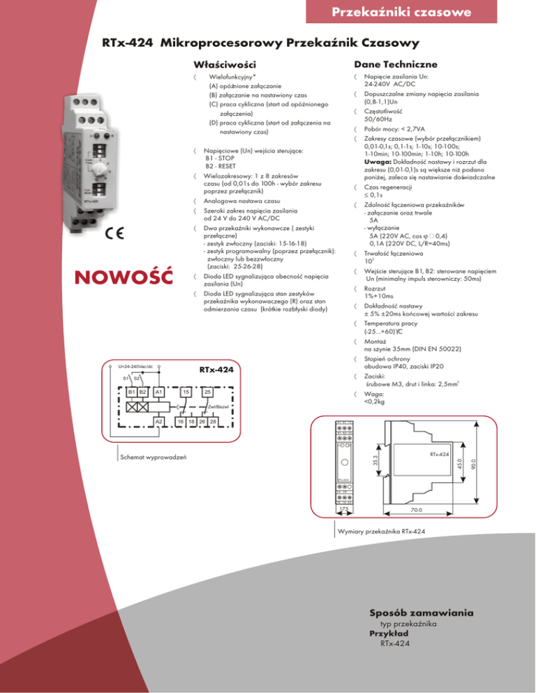 PrzekaŸniki czasowe RTx-424 Mikroprocesorowy PrzekaŸnik Czasowy Dane Techniczne · · Napiêcie zasilania Un: 24-240V AC/DC · Dopuszczalne zmiany napiêcia zasilania (0,8-1,1)Un · Czêstotliwoœæ 50/60Hz · Pobór mocy: < 2,7VA · Zakresy czasowe (wybór prze³¹cznikiem) 0,01-0,1s; 0,1-1s; 1-10s; 10-100s; 1-10min; 10-100min; 1-10h; 10-100h Uwaga: Dok³adnoœæ nastawy i rozrzut dla zakresu (0,01-0,1)s s¹ wiêksze ni¿ podano poni¿ej, zaleca siê nastawianie doœwiadczalne · Czas regeneracji £ 0,1s · Zdolnoœæ ³¹czeniowa przekaŸników - za³¹czanie oraz trwale 5A - wy³¹czanie 5A (220V AC, cos j ³ 0,4) 0,1A (220V DC, L/R=40ms) · Trwa³oœæ ³¹czeniowa 105 · Wejœcie steruj¹ce B1, B2: sterowane napiêciem Un (minimalny impuls sterowniczy: 50ms) · Rozrzut 1%+10ms · Dok³adnoœæ nastawy ± 5% ±20ms koñcowej wartoœci zakresu · Temperatura pracy (-25...+60)°C · Monta¿ na szynie 35mm (DIN EN 50022) · Stopieñ ochrony obudowa IP40, zaciski IP20 · Zaciski: œrubowe M3, drut i linka: 2,5mm2 · Waga: <0,2kg Wielofunkcyjny* (A) opóŸnione za³¹czanie (B) za³¹czanie na nastawiony czas (C) praca cykliczna (start od opóŸnionego za³¹czenia) (D) praca cykliczna (start od za³¹czenia na nastawiony czas) · Napiêciowe (Un) wejœcia steruj¹ce: B1 - STOP B2 - RESET · Wielozakresowy: 1 z 8 zakresów czasu (od 0,01s do 100h - wybór zakresu poprzez prze³¹cznik) · Analogowa nastawa czasu · Szeroki zakres napiêcia zasilania od 24 V do 240 V AC/DC · Dwa przekaŸniki wykonawcze ( zestyki prze³¹czne) - zestyk zw³oczny (zaciski: 15-16-18) - zestyk programowalny (poprzez prze³¹cznik): zw³oczny lub bezzw³oczny (zaciski: 25-26-28) · Dioda LED sygnalizuj¹ca obecnoœæ napiêcia zasilania (Un) · Dioda LED sygnalizuj¹ca stan zestyków przekaŸnika wykonawaczego (R) oraz stan odmierzania czasu (krótkie rozb³yski diody) NOWOŒÆ U=24-240Vac/dc S1 W³aœciwoœci RTx-424 S2 B1 B2 A1 15 25 Zwl/Bezwl A2 16 18 26 28 A1 B1 15 B1 B2 25 R RTx-424 45.0 35.3 Schemat wyprowadzeñ 90.0 U RTx-424 26 28 18 16 A2 17.5 70.0 Wymiary przekaŸnika RTx-424 Sposób zamawiania * typ przekaŸnika Przyk³ad * RTx-424 PrzekaŸniki czasowe LEGENDA U - napiêcie zasilania, dioda Un R - stan przekaŸnika wykonawczego, dioda R T, T1, T2 - nastawy czasu Stan pocz¹tkowy - stan przekaŸnika przed w³¹czeniem napiêcia zasilania Funkcja A (OpóŸnione za³¹czanie) Funkcja C (Praca cykliczna) U U R T R T T T T T T Odmierzenie nastawionego czasu nastêpuje po za³¹czeniu napiêcia zasilania U. Po jego odmierzeniu nastêpuje zadzia³anie przekaŸnika wykonawczego. Stan taki trwa do momentu wy³¹czenia napiêcia zasilania. Funkcja B (Za³¹czanie na nastawiony czas) Odmierzenie czasu T nastêpuje po za³¹czeniu napiêcia zasilania U. Po odmierzeniu tego czasu nastêpuje zadzia³anie przekaŸnika wykonawczego oraz ponowne rozpoczêcie odmierzania czasu T. Po odmierzeniu tego czasu nastêpuje powrót przekaŸnika do stanu pocz¹tkowego i rozpoczyna siê nastêpny cykl. Dzia³anie przekaŸnika trwa do momentu wy³¹czenia napiêcia zasilania. Funkcja D (Praca cykliczna) U U R R T T T T T T T Zadzia³anie przekaŸnika wykonawczego nastêpuje bezpoœrednio po podaniu napiêcia zasilania. Równoczeœnie rozpoczyna siê odmierzanie nastawionego czasu T. Po jego odmierzeniu przekaŸnik wykonawczy wraca do stanu pocz¹tkowego. Odmierzenie nastawionego czasu nastêpuje po za³¹czeniu napiêcia zasilania U z równoczesnym zadzia³aniem przekaŸnika wykonawczego. Po odmierzeniu tego czasu przekaŸnik wykonawczy wraca do stanu pocz¹tkowego i rozpoczyna siê ponowne odmierzanie czasu T. Po odmierzeniu tego czasu rozpoczyna siê nastêpny cykl dzia³ania przekaŸnika. Dzia³anie przekaŸnika trwa do momentu wy³¹czenia napiêcia zasilania. Diagramy pracy (funkcje) przekaŸników czasowych 4>5 2>3 PrzekaŸniki czasowe Stan wyjœciowy - stan przekaŸnika bezpoœrednio po podaniu napiêcia zasilania U. · RESET: Zwarcie zacisków 5 - 6 powoduje zerowanie czasu opóŸnienia. · STOP: Zwarcie zacisków 5 - 7 powoduje wstrzymanie odmierzania czasu. Rozwarcie powoduje dokoñczenie odmierzania nastawionego czasu. Zwarcie zacisków 5 - 7 po odmierzeniu nastawionego czasu nie powoduje zmiany stanu przekaŸnika. Funkcja A (STOP) Funkcja C (RESET) Funkcja E4 (RESET) U U U zestyk 5-7 zestyk 5-6 zestyk 5-6 R R R T T1 T2 T T T T1 T T2 T1 T1 T2 T1 T1+T2=T Funkcja B (STOP) Funkcja D (RESET) Funkcja E1 (STOP) U U U zestyk 5-7 zestyk 5-6 zestyk 5-7 R R T T1 R T T2 T T T T T1 T2' T1+T2=T Funkcja C (STOP) Funkcja E1 (RESET) Funkcja E2 (STOP) U U U zestyk 5-7 zestyk 5-6 zestyk 5-7 R R R T T T1 T2'' T2'+T2''=T2 T2 T1 T2 T1 T1 T2 T2' T2'' T2'+T2''=T2 T1+T2=T Funkcja D (STOP) Funkcja E2 (RESET) Funkcja E3 (STOP) U U U zestyk 5-7 zestyk 5-6 zestyk 5-7 R R R T2'' T2' T T T1 T2 T T1 T2 T1 T2 T1 T2 T1+T2=T U R Funkcja E3 (RESET) T T1 Funkcja E4 (STOP) U U zestyk 5-6 zestyk 5-7 R R T T1 T2 T2'+T2''=T2 Funkcja A (RESET) zestyk 5-6 T1 T1 T2 T1 T1 T2 T1 T1 T2' T2'' T1 T2 T1 T2'+T2''=T2 Funkcja B (RESET) U zestyk 5-6 Sterowanie przy pomocy zewnêtrznego zestyku lub transoptora (optoizolatora) mo¿e byæ wykonywane w przekaŸnikach, posiadaj¹cych dodatkowe wejœcia steruj¹ce STOP (5 - 7, S - P lub S - M) i RESET (5 - 6, R - P lub R - M). R T T Diagramy pracy z wykorzystaniem zewnêtrznych styków steruj¹cych dla przekaŸników serii: RTx-1xx, RTx-2xx 6>7 T&D Worldwide Contact Centre [email protected] www.areva-td.com AREVA T&D Sp. z o.o. ul.Strzegomska 23/27 58-160 Œwiebodzice Tel.:+48 (74) 8548 410 Fax:+48 (74) 8548 548