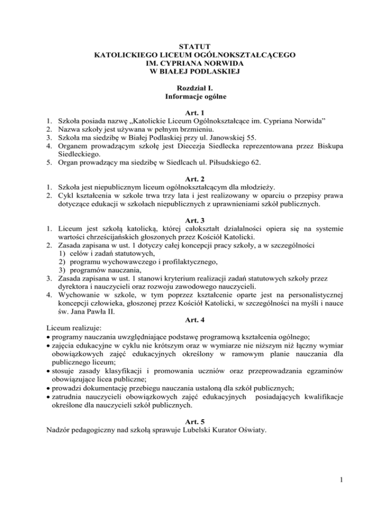 STATUT KATOLICKIEGO LICEUM OGÓLNOKSZTAŁCĄCEGO IM. CYPRIANA NORWIDA W BIAŁEJ PODLASKIEJ Rozdział I. Informacje ogólne Art. 1 Szkoła posiada nazwę „Katolickie Liceum Ogólnokształcące im. Cypriana Norwida” Nazwa szkoły jest używana w pełnym brzmieniu. Szkoła ma siedzibę w Białej Podlaskiej przy ul. Janowskiej 55. Organem prowadzącym szkołę jest Diecezja Siedlecka reprezentowana przez Biskupa Siedleckiego. 5. Organ prowadzący ma siedzibę w Siedlcach ul. Piłsudskiego 62. 1. 2. 3. 4. Art. 2 1. Szkoła jest niepublicznym liceum ogólnokształcącym dla młodzieży. 2. Cykl kształcenia w szkole trwa trzy lata i jest realizowany w oparciu o przepisy prawa dotyczące edukacji w szkołach niepublicznych z uprawnieniami szkół publicznych. Art. 3 1. Liceum jest szkołą katolicką, której całokształt działalności opiera się na systemie wartości chrześcijańskich głoszonych przez Kościół Katolicki. 2. Zasada zapisana w ust. 1 dotyczy całej koncepcji pracy szkoły, a w szczególności 1) celów i zadań statutowych, 2) programu wychowawczego i profilaktycznego, 3) programów nauczania, 3. Zasada zapisana w ust. 1 stanowi kryterium realizacji zadań statutowych szkoły przez dyrektora i nauczycieli oraz rozwoju zawodowego nauczycieli. 4. Wychowanie w szkole, w tym poprzez kształcenie oparte jest na personalistycznej koncepcji człowieka, głoszonej przez Kościół Katolicki, w szczególności na myśli i nauce św. Jana Pawła II. Art. 4 Liceum realizuje: programy nauczania uwzględniające podstawę programową kształcenia ogólnego; zajęcia edukacyjne w cyklu nie krótszym oraz w wymiarze nie niższym niż łączny wymiar obowiązkowych zajęć edukacyjnych określony w ramowym planie nauczania dla publicznego liceum; stosuje zasady klasyfikacji i promowania uczniów oraz przeprowadzania egzaminów obowiązujące licea publiczne; prowadzi dokumentację przebiegu nauczania ustaloną dla szkół publicznych; zatrudnia nauczycieli obowiązkowych zajęć edukacyjnych posiadających kwalifikacje określone dla nauczycieli szkół publicznych. Art. 5 Nadzór pedagogiczny nad szkołą sprawuje Lubelski Kurator Oświaty. 1 Rozdział II. Cele i zadania szkoły Art. 6 Podstawowym celem szkoły jest wspieranie integralnego rozwoju ucznia – w procesie wychowania, nauczania i opieki, określonym dla liceum, realizowanym według koncepcji zapisanej w Statucie. Art. 7 1. Zasady i wartości chrześcijańskie stanowią fundament procesu wychowawczego opisanego szczegółowo w programie wychowawczym i spójnym z nim programie profilaktyki, są uwzględniane w programach kształcenia i mają być ukazywane przykładem życia przede wszystkim przez nauczycieli i osoby pełniące funkcje kierownicze w szkole. 2. Proces wychowawczy i formacyjny w szkole opiera się na relacji osób: nauczyciela i ucznia, nauczycieli między sobą, dyrektora i nauczycieli, nauczycieli i rodziców. 3. Za zgodność Programu Wychowawczego i Programu Profilaktyki z nauczaniem Kościoła Katolickiego odpowiada Organ Prowadzący. Wyżej wymienione programy uchwala Rada Pedagogiczna i przedkłada Biskupowi Siedleckiemu do zatwierdzenia. 4. Program Wychowawczy i Program Profilaktyki są załącznikiem do Statutu. 1. 2. 3. 4. Art. 8 Kształcenie w szkole jest częścią szeroko rozumianego wychowania. Jego istotą jest wspomaganie rozwoju ucznia w kierunku stawania się w pełni osobą i oznacza przede wszystkim rozwijanie: 1) podmiotowości, 2) odpowiedzialności, 3) umiejętności dokonywania wyborów i przyjmowania ich konsekwencji, 4) poczucia własnej godności, 5) możliwości twórczych, 6) potrzeby i poczucia sensu, równocześnie przekraczanie siebie w kierunku bycia > z drugimi <i > dla drugich<. W procesie rozwoju ucznia nauczyciel przyjmuje rolę osoby życzliwie i z szacunkiem dla wychowanka: 1) instruującej go, 2) kierującej, współdziałającej i towarzyszącej w dążeniu do prawdy, 3) modelującej własnym przykładem, 4) odwołującej się przede wszystkim do dialogu, wiarygodnych źródeł i przykładów. Szkoła wspiera wszechstronny rozwój osobowy ucznia, w szczególności w sferach: 1) dojrzewania intelektualnego, 2) dojrzewania emocjonalnego, 3) dojrzewania moralnego, 4) dojrzewania woli, 5) dojrzewania społecznego. Szkoła wspiera rozwój religijny uczniów, który stanowi źródło motywacji do podejmowania wysiłku własnego rozwoju. Wrażliwość i otwartość na wartości wyznawane, odkrywane i realizowane - warunkuje wzrastanie w dojrzałości osobowej zarówno wychowanków, jak i wychowawców. 2 Art. 9 1. W szkole podejmowane są stałe działania i wysiłki budowania jej charakteru wychowawczego opartego na fundamencie Ewangelii. 2. Szkoła w pierwszej kolejności chce wspierać w wychowaniu i kształceniu dzieci – rodziny wyznającej religię katolicką, rodziny wielodzietne i ubogie. Uczniem szkoły może być także dziecko z rodziny poszukującej prawdziwych wartości lub uczeń poszukujący, także niewierzący, jeżeli jego rodzice lub sam uczeń, mają zaufanie do szkoły i chcą współpracować ze szkołą według zasad określonych w Statucie szkoły. 3. Wszyscy uczniowie uczestniczą w procesie wychowania i kształcenia na tych samych zasadach, dotyczy to również nauki religii. 4. Dzień rozpoczyna się i kończy modlitwą. Obecność na szkolnej Mszy św., nauka religii, uczestnictwo w rekolekcjach szkolnych i dniach skupienia stanowią fundament edukacji w szkole i są obowiązkowe. Art.10 1. Środowisko wychowawcze szkoły – jako wspólnoty- tworzą wszyscy jej członkowie: nauczyciele, uczniowie i rodzice i pracownicy niepedagogiczni. 2. Szkoła wspiera rodziców jako pierwszych wychowawców swoich dzieci i stara się o współpracę prowadzącą do osiągania spójności wychowawczej. 1. 2. 3. 4. Cele i zadania wynikające z prawa Art. 11 Realizując cele i zadania określone w ustawie o systemie oświaty, szkoła: 1) kształtuje środowisko w
