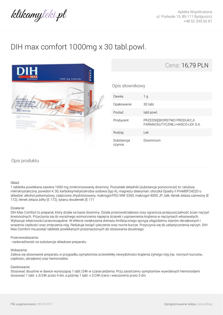 Apteka Współczesna ul. Podwale 15, 85-111 Bydgoszcz +48 52 345 65 81 DIH max comfort 1000mg x 30 tabl.powl. Cena: 16,79 PLN Opis słownikowy Dawka 1g Opakowanie 30 tabl. Postać tabl.powl. Producent PRZEDSIĘBIORSTWO PRODUKCJI FARMACEUTYCZNEJ HASCO-LEK S.A. Rodzaj Lek Substancja czynna Diosminum Opis produktu Skład: 1 tabletka powlekana zawiera 1000 mg zmikronizowanej diosminy. Pozostałe składniki (substancje pomocnicze) to: celuloza mikrokrystaliczna, powidon K 30, karboksymetyloskrobia sodowa (typ A), magnezu stearynian, otoczka Opadry II Pink85F24220 o składzie: alkohol poliwinylowy, częściowo zhydrolizowany, makrogol/PEG MW 3350, makrogol 4000 JP, talk, tlenek żelaza czerwony (E 172), tlenek żelaza żółty (E 172), tytanu dwutlenek (E 171 Działanie: DIH Max Comfort to preparat, który działa na bazie diosminy. Działa przeciwobrzękowo oraz ogranicza przepuszczalność ścian naczyń krwionośnych. Przyczynia się do wyraźnego wzmocnienia napięcia ścianek i usprawnienia krążenia w naczyniach włosowatych. Wykazuje właściwości przeciwzapalne. W efekcie zwiększania drenażu limfatycznego sprzyja złagodzeniu stanów obrzękowych i wrażenia ciężkości oraz zmęczenia nóg. Redukuje świąd i pieczenie oraz nocne kurcze. Przyczynia się do uelastycznienia naczyń. DIH Max Comfort ma postać tabletek powlekanych przeznaczonych do stosowania doustnego. Przeciwwskazania: - nadwrażliwość na substancje składowe preparatu Wskazania: Zaleca się stosowanie preparatu w przypadku symptomów przewlekłej niewydolności krążenia żylnego nóg (np. nocnych kurczów, ciężkości, obrzęków) oraz hemoroidów. Dawkowanie: Stosować doustnie w dawce wynoszącej 1 tabl./24h w czasie jedzenia. Przy zaostrzeniu symptomów wywołanych hemoroidami stosować 1 tabl. x 3/24h przez 4 dni, a później 1 tabl. x 2/24h (rano i wieczorem) przez 3 dni. Plik wygenerowano: 08-03-2017 Oprogramowanie sklepu: AptusShop Apteka Współczesna ul. Podwale 15, 85-111 Bydgoszcz +48 52 345 65 81 Plik wygenerowano: 08-03-2017 Powered by TCPDF (www.tcpdf.org) Oprogramowanie sklepu: AptusShop