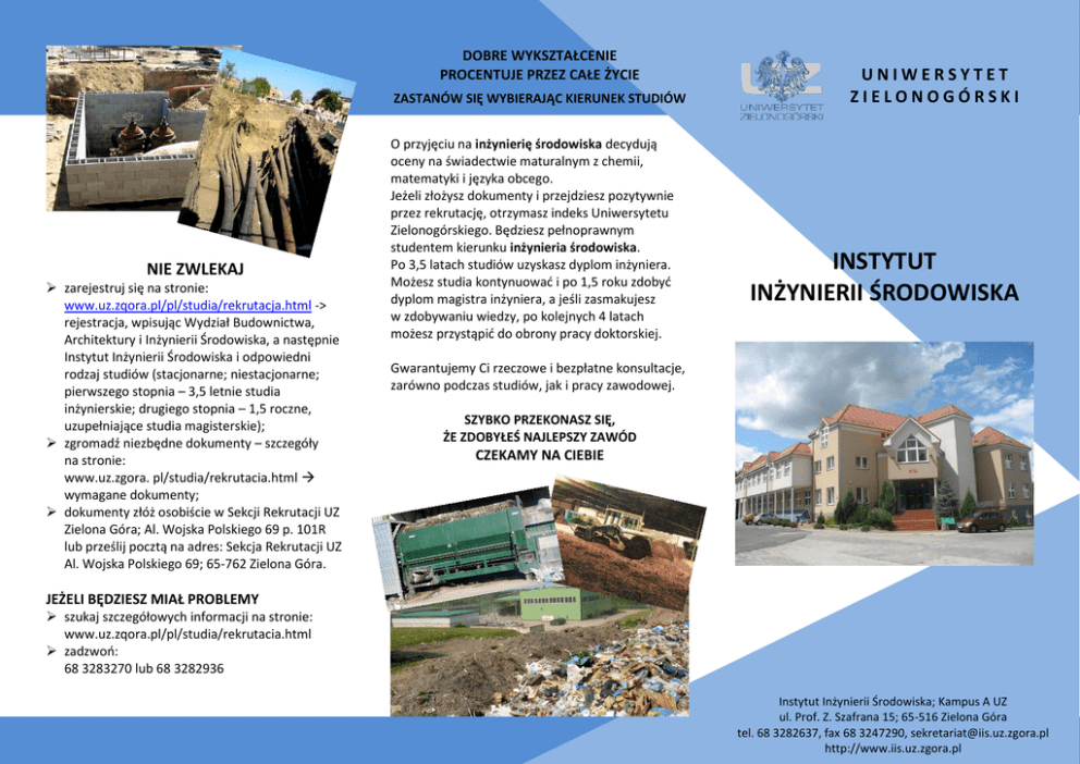 DOBRE WYKSZTAŁCENIE PROCENTUJE PRZEZ CAŁE ŻYCIE ZASTANÓW SIĘ WYBIERAJĄC KIERUNEK STUDIÓW NIE ZWLEKAJ zarejestruj się na stronie: www.uz.zqora.pl/pl/studia/rekrutacja.html -> rejestracja, wpisując Wydział Budownictwa, Architektury i Inżynierii Środowiska, a następnie Instytut Inżynierii Środowiska i odpowiedni rodzaj studiów (stacjonarne; niestacjonarne; pierwszego stopnia – 3,5 letnie studia inżynierskie; drugiego stopnia – 1,5 roczne, uzupełniające studia magisterskie); zgromadź niezbędne dokumenty – szczegóły na stronie: www.uz.zgora. pl/studia/rekrutacia.html wymagane dokumenty; dokumenty złóż osobiście w Sekcji Rekrutacji UZ Zielona Góra; Al. Wojska Polskiego 69 p. 101R lub prześlij pocztą na adres: Sekcja Rekrutacji UZ Al. Wojska Polskiego 69; 65-762 Zielona Góra. O przyjęciu na inżynierię środowiska decydują oceny na świadectwie maturalnym z chemii, matematyki i języka obcego. Jeżeli złożysz dokumenty i przejdziesz pozytywnie przez rekrutację, otrzymasz indeks Uniwersytetu Zielonogórskiego. Będziesz pełnoprawnym studentem kierunku inżynieria środowiska. Po 3,5 latach studiów uzyskasz dyplom inżyniera. Możesz studia kontynuować i po 1,5 roku zdobyć dyplom magistra inżyniera, a jeśli zasmakujesz w zdobywaniu wiedzy, po kolejnych 4 latach możesz przystąpić do obrony pracy doktorskiej. UNIWERSYTET ZIELONOGÓRSKI INSTYTUT INŻYNIERII ŚRODOWISKA Gwarantujemy Ci rzeczowe i bezpłatne konsultacje, zarówno podczas studiów, jak i pracy zawodowej. SZYBKO PRZEKONASZ SIĘ, ŻE ZDOBYŁEŚ NAJLEPSZY ZAWÓD CZEKAMY NA CIEBIE JEŻELI BĘDZIESZ MIAŁ PROBLEMY szukaj szczegółowych informacji na stronie: www.uz.zqora.pl/pl/studia/rekrutacia.html zadzwoń: 68 3283270 lub 68 3282936 Instytut Inżynierii Środowiska; Kampus A UZ ul. Prof. Z. Szafrana 15; 65-516 Zielona Góra tel. 68 3282637, fax 68 3247290, [email protected] http://www.iis.uz.zgora.pl PRZECZYTAJ, POMYŚL, ZDECYDUJ INŻYNIERIA ŚRODOWISKA TO NAJLEPSZY WYBÓR STUDIUJĄC INŻYNIERIĘ ŚRODOWISKA POZNASZ metody ujmowania i uzdatniania wody, technologie oczyszczania ścieków, systemy gospodarki odpadami, informatyczne podstawy projektowania obiektów inżynierii środowiska i instalacji sanitarnych, elementy ekologii i toksykologii środowiska, skutki antropogenicznego przekształcania środowiska, hydrogeologię, mechanikę gruntów i gruntoznawstwo, prawne i ekonomiczne aspekty zarządzania środowiskiem. NAUCZYSZ SIĘ zasad projektowania i wykonywania prac inżynierskich w zakresie instalacji sanitarnych, procesów i urządzeń uzdatniania wody, oczyszczania ścieków, unieszkodliwiania odpadów oraz odwadniania obiektów i rekultywacji terenów zdegradowanych, sporządzania programów ochrony środowiska, operatów wodno-prawnych oraz raportów oddziaływania inwestycji na środowisko, ekonomiki i metod optymalizacyjnych, zasad oszczędnego gospodarowania materiałami i energią oraz pozyskiwania energii ze źródeł odnawialnych. ZREALIZUJESZ SWOJE ZAINTERESOWANIA W SPECJALNOŚCIACH URZĄDZENIA SANITARNE zostaniesz przygotowany do planowania i projektowania oraz kierowania budową i eksploatacją sieci wodno-kanalizacyjnych, gazowych i ciepłowniczych, instalacji do wykorzystania energii odnawialnej i instalacji pomp ciepła; ZAOPATRZENIE W WODĘ, UNIESZKODLIWIANIE ŚCIEKÓW I ODPADÓW zostaniesz przygotowany do planowania i projektowania oraz kierowania budową i eksploatacją sieci wodno-kanalizacyjnych, stacji uzdatniania wody, oczyszczalni ścieków, instalacji zagospodarowania i unieszkodliwiania odpadów oraz systemów kontroli stanu środowiska. INŻYNIERIA EKOLOGICZNA poznasz zasady oceny stanu środowiska przyrodniczego, rekultywacji terenów zdegradowanych, projektowania systemów ochrony wód i gruntów, monitoringu środowiska; zostaniesz przygotowany do roli doradcy technicznego, organizacyjnego, ekonomicznego i prawnego w zakresie polityki ekologicznej na różnych szczeblach administracji państwowej i samorządowej. Niezależnie od specjalności zdobędziesz kwalifikacje niezbędne do pracy naukowo-badawczej w różnych jednostkach badawczych i szkołach wyższych, a także nauczania przedmiotów z dziedziny ekologii i ochrony przyrody w szkolnictwie średnim i podstawowym. ZDOBĘDZIESZ WYKSZTAŁCENIE NIEZBĘDNE do ubiegania się o uprawnienia w zakresie projektowania i wykonawstwa instalacji sanitarnych, do członkostwa w Polskiej Izbie Inżynierów Budownictwa, do nauczania w zakresie inżynierii środowiska, ekologii i ochrony środowiska. BEZ PROBLEMU ZNAJDZIESZ PRACĘ w biurach projektowych, w wykonawstwie obiektów inżynierskich, w administracji państwowej i publicznej, w instytucjach kontroli i oceny stanu środowiska, w jednostkach naukowo-badawczych, w podmiotach kompletacji dostaw i handlu urządzeń i instalacji służących ochronie środowiska, w wielu innych instytucjach krajowych i zagranicznych zajmujących się inżynierią i ochroną środowiska.