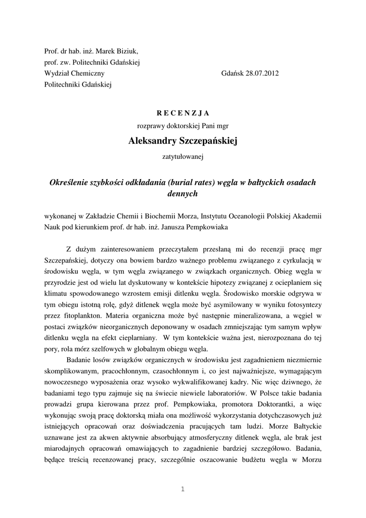 Prof. dr hab. inŜ. Marek Biziuk, prof. zw. Politechniki Gdańskiej Wydział Chemiczny Politechniki Gdańskiej Gdańsk 28.07.2012 RECENZJA rozprawy doktorskiej Pani mgr Aleksandry Szczepańskiej zatytułowanej Określenie szybkości odkładania (burial rates) węgla w bałtyckich osadach dennych wykonanej w Zakładzie Chemii i Biochemii Morza, Instytutu Oceanologii Polskiej Akademii Nauk pod kierunkiem prof. dr hab. inŜ. Janusza Pempkowiaka Z duŜym zainteresowaniem przeczytałem przesłaną mi do recenzji pracę mgr Szczepańskiej, dotyczy ona bowiem bardzo waŜnego problemu związanego z cyrkulacją w środowisku węgla, w tym węgla związanego w związkach organicznych. Obieg węgla w przyrodzie jest od wielu lat dyskutowany w kontekście hipotezy związanej z ocieplaniem się klimatu spowodowanego wzrostem emisji ditlenku węgla. Środowisko morskie odgrywa w tym obiegu istotną rolę, gdyŜ ditlenek węgla moŜe być asymilowany w wyniku fotosyntezy przez fitoplankton. Materia organiczna moŜe być następnie mineralizowana, a węgiel w postaci związków nieorganicznych deponowany w osadach zmniejszając tym samym wpływ ditlenku węgla na efekt cieplarniany. W tym kontekście waŜna jest, nierozpoznana do tej pory, rola mórz szelfowych w globalnym obiegu węgla. Badanie losów związków organicznych w środowisku jest zagadnieniem niezmiernie skomplikowanym, pracochłonnym, czasochłonnym i, co jest najwaŜniejsze, wymagającym nowoczesnego wyposaŜenia oraz wysoko wykwalifikowanej kadry. Nic więc dziwnego, Ŝe badaniami tego typu zajmuje się na świecie niewiele laboratoriów. W Polsce takie badania prowadzi grupa kierowana przez prof. Pempkowiaka, promotora Doktorantki, a więc wykonując swoją pracę doktorską miała ona moŜliwość wykorzystania dotychczasowych juŜ istniejących opracowań oraz doświadczenia pracujących tam ludzi. Morze Bałtyckie uznawane jest za akwen aktywnie absorbujący atmosferyczny ditlenek węgla, ale brak jest miarodajnych opracowań omawiających to zagadnienie bardziej szczegółowo. Badania, będące treścią recenzowanej pracy, szczególnie oszacowanie budŜetu węgla w Morzu 1 Bałtyckim, w tym przepływu strumienia węgla przez granicę faz woda – osad oraz strumienia powrotnego węgla z osadów do toni wodnej, naleŜy uznać za niezmiernie istotne. NaleŜy wyrazić duŜe uznanie dla autorki, Ŝe podjęła się realizacji tak waŜnego, a jednocześnie trudnego w realizacji tematu. Praca zasługuje na uwagę z wielu względów. Imponujący jest zakres pracy oraz ilość wykonanych analiz, umoŜliwiających nie tylko oszacowanie strumienia węgla deponowanego („grzebanego”) w osadach, ale takŜe uwalnianego z nich w procesach mineralizacji zachodzących w trakcie wczesnej diagenezy osadów. Był to więc program szeroki i ambitny. Doktorantka miała szansę (i ją wykorzystała) do nabycia nowych doświadczeń, a szczególnie nowoczesnego podejścia do badania losów związków organicznych w środowisku morskim, w szerokim pojęciu tego słowa. Generalnie koncepcję pracy oceniam bardzo wysoko i dobrze się stało, Ŝe taka praca powstała. W skład recenzowanej rozprawy wchodzą: Wstęp i cel pracy, Zakres badań, część literaturowa (Rozdział 2 i 3), Metodyka badań, Wyniki, Dyskusja, Podsumowanie i wnioski, a takŜe: streszczenie w języku angielskim i Literatura. Jest to klasyczny układ rozpraw doktorskich. Chciałbym zwrócić uwagę na bardzo obszerne, bo liczące 13 stron streszczenie w języku angielskim. UmoŜliwia to zapoznanie się z głównymi tezami pracy, a szczególnie wynikami i wnioskami, takŜe zainteresowanym tematem, którzy nie znają języka polskiego. Łącznie praca obejmuje 134 strony, zawiera 20 rysunków i 18 tabel. Brak jest spisu tabel i rysunków oraz zestawienia stosowanych skrótów i akronimów co utrudnia częściowo lekturę. W części literaturowej Doktorantka opisała proces tworzenia i przemian wierzchniej warstwy osadów dennych oraz ich charakterystykę. Podała równieŜ źródła materiału osadowego, typy i skład chemiczny zawiesiny, sedymentację oraz diagenezę osadów dennych. Szczegółowo te zagadnienia zostały omówione w kontekście Morza Bałtyckiego. Interesująca jest charakterystyka Morza Bałtyckiego oraz opis źródeł i składu chemicznego osadów ze zwróceniem uwagi na materię organiczną w osadach. Na uwagę zasługuje takŜe opis dwóch metod obliczania szybkości sedymentacji osadów dennych, a więc metody ołowiowej oraz profilów aktywności izotopu 137Cs. Chciałbym jednak zwrócić uwagę, Ŝe Rys. 9 nie dotyczy jedynie izotopu 137Cs wprowadzonego w wyniku katastrofy w Czarnobylu, jak sugeruje Doktorantka w tekście, a sumy tego izotopu, wprowadzanego w róŜnym okresie. W rozdziałach tych Doktorantka wykazała się interdyscyplinarnymi wiadomościami z zakresu chemii i geologii. Obszerna i wyczerpująca część teoretyczna jest dobrym wprowadzeniem do pracy i bardzo dobrze uzasadnia jej cel. MoŜe być równieŜ dobrym materiałem do monografii lub artykułu popularno-naukowego. NajwaŜniejszą częścią kaŜdej pracy doktorskiej są jednak wyniki, ich dyskusja oraz wnioski. Poza ilością prezentowanych wyników uderza duŜa dojrzałość i dociekliwość w interpretacji oraz wyciąganiu wniosków z przeprowadzonych badań. Obszerny program badawczy został dobrze zaplanowany i przeprowadzony. Do badań wykorzystano 21 30- 2 centymetrowych rdzeni osadów dennych z rejonów Głębi Gdańskiej, Głębi Gotlandzkiej, Głębi Bornholmskiej, Zatoki Botnickiej i Zatoki Fińskiej, a takŜe 64 muliste i piaszczyste osady powierzchniowe z rejonu Południowego Bałtyku. Zastosowana procedura pobierania, konserwacji i przechowywania próbek jest prawidłowa i w zgodzie z najnowszymi trendami w tej dziedzinie, aczkolwiek konserwowanie próbek za pomocą soli rtęci(II) nie jest w zgodzie z „zieloną chemią”. Na podkreślenie zasługuje zastosowanie materia