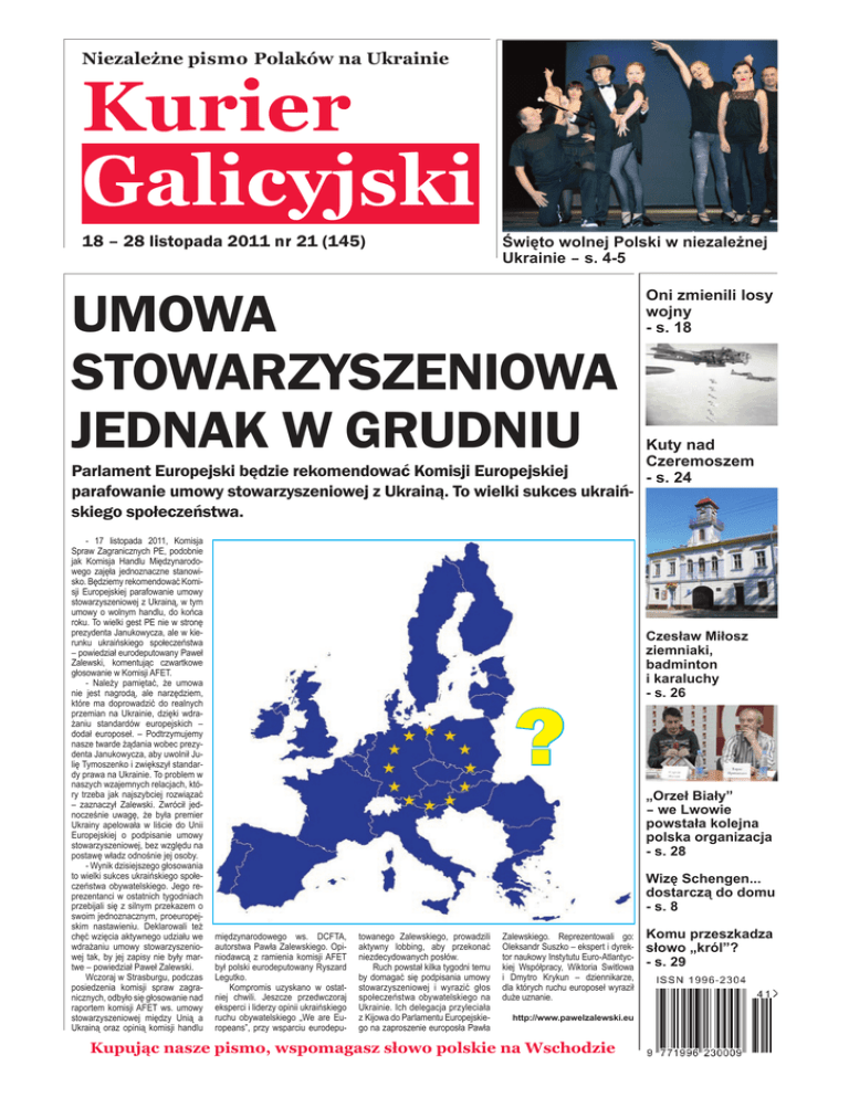 Niezależne pismo Polaków na Ukrainie kurier galicyjski 18 – 28 listopada 2011 nr 21 (145) Święto wolnej Polski w niezależnej Ukrainie – s. 4-5 Umowa stowarzyszeniowa jednak w grudniu Parlament Europejski będzie rekomendować Komisji Europejskiej parafowanie umowy stowarzyszeniowej z Ukrainą. To wielki sukces ukraińskiego społeczeństwa. - 17 listopada 2011, Komisja Spraw Zagranicznych PE, podobnie jak Komisja Handlu Międzynarodowego zajęła jednoznaczne stanowisko. Będziemy rekomendować Komisji Europejskiej parafowanie umowy stowarzyszeniowej z Ukrainą, w tym umowy o wolnym handlu, do końca roku. To wielki gest PE nie w stronę prezydenta Janukowycza, ale w kierunku ukraińskiego społeczeństwa – powiedział eurodeputowany Paweł Zalewski, komentując czwartkowe głosowanie w Komisji AFET. - Należy pamiętać, że umowa nie jest nagrodą, ale narzędziem, które ma doprowadzić do realnych przemian na Ukrainie, dzięki wdrażaniu standardów europejskich – dodał europoseł. – Podtrzymujemy nasze twarde żądania wobec prezydenta Janukowycza, aby uwolnił Julię Tymoszenko i zwiększył standardy prawa na Ukrainie. To problem w naszych wzajemnych relacjach, który trzeba jak najszybciej rozwiązać – zaznaczył Zalewski. Zwrócił jednocześnie uwagę, że była premier Ukrainy apelowała w liście do Unii Europejskiej o podpisanie umowy stowarzyszeniowej, bez względu na postawę władz odnośnie jej osoby. - Wynik dzisiejszego głosowania to wielki sukces ukraińskiego społeczeństwa obywatelskiego. Jego reprezentanci w ostatnich tygodniach przebijali się z silnym przekazem o swoim jednoznacznym, proeuropejskim nastawieniu. Deklarowali też chęć wzięcia aktywnego udziału we wdrażaniu umowy stowarzyszeniowej tak, by jej zapisy nie były martwe – powiedział Paweł Zalewski. Wczoraj w Strasburgu, podczas posiedzenia komisji spraw zagranicznych, odbyło się głosowanie nad raportem komisji AFET ws. umowy stowarzyszeniowej między Unią a Ukrainą oraz opinią komisji handlu ? Oni zmienili losy wojny - s. 18 Kuty nad Czeremoszem - s. 24 Czesław Miłosz ziemniaki, badminton i karaluchy - s. 26 „Orzeł Biały” – we Lwowie powstała kolejna polska organizacja - s. 28 Wizę Schengen... dostarczą do domu - s. 8 międzynarodowego ws. DCFTA, autorstwa Pawła Zalewskiego. Opiniodawcą z ramienia komisji AFET był polski eurodeputowany Ryszard Legutko. Kompromis uzyskano w ostatniej chwili. Jeszcze przedwczoraj eksperci i liderzy opinii ukraińskiego ruchu obywatelskiego „We are Europeans”, przy wsparciu eurodepu- towanego Zalewskiego, prowadzili aktywny lobbing, aby przekonać niezdecydowanych posłów. Ruch powstał kilka tygodni temu by domagać się podpisania umowy stowarzyszeniowej i wyrazić głos społeczeństwa obywatelskiego na Ukrainie. Ich delegacja przyleciała z Kijowa do Parlamentu Europejskiego na zaproszenie europosła Pawła Zalewskiego. Reprezentowali go: Oleksandr Suszko – ekspert i dyrektor naukowy Instytutu Euro-Atlantyckiej Współpracy, Wiktoria Switlowa i Dmytro Krykun – dziennikarze, dla których ruchu europoseł wyraził duże uznanie. http://www.pawelzalewski.eu Kupując nasze pismo, wspomagasz słowo polskie na Wschodzie Komu przeszkadza słowo „król”? - s. 29 2 Przegląd wydarzeń kurier galicyjski * 18–28 listopada 2011 nr 21 (145) MGŁA. I co dalej? KRZYSZTOF SZYMAŃSKI www.prezydent.pl zdjęcie Na przeszkodzie w dotarciu do Wrocławia, na obchody 200. rocznicy Uniwersytetu Wrocławskiego, prezydentowi Ukrainy Wiktorowi Janukowyczowi stanęła mgła na wrocławskim lotnisku. Z tego powodu nie zdążył na początek uroczystości, na których reprezentował go początkowo ambasador Ukrainy w Polsce Markijan Malskyj. Na uroczystości do Wrocławia przybył prezydent Niemiec Christian Wulff. Spotkanie prezydentów Komorowskiego i Wulffa rozpoczęło się od złożenia kwiatów pod pomnikiem profesorów lwowskich zamordowanych w 1941 r. przez Niemców. Podczas uroczystości Bronisław Komorowski opowiadał o dorobku wrocławskiego uniwersytetu, który kontynuuje tradycje dwóch przedwojennych uczelni: lwowskiej i niemieckiej z Wrocławia. – Ważne, że Uniwersytet Wrocławski chce być miejscem spotkań między Wschodem a Zachodem i nadal kontynuować wielokulturową tradycję jednoczącej się Europy, rozumiejąc, że dziedzictwo Europy jest niemożliwe bez Ukrainy – mówił. W swoim przemówieniu Christian Wulff nawiązał do mgły, która opóźniła przylot prezydenta Janukowycza: – Mam nadzieję, że rozwieje się również mgła nad Ukrainą. Że jej Spotkanie prezydentów we Wrocławiu. Od lewej: Christian Wulff, Bronisław Komorowski i Wiktor Janukowycz władze dostrzegą, jakie pozytywne skutki dla ludzi niesie demokracja. Ukraina już przyznaje się do tych wartości, ważnych dla całej Europy, m.in. przez uczestnictwo w Partnerstwie Wschodnim. Natomiast Polacy, którzy walczyli o wolność i demokrację, są tej demokracji najlepszymi nauczycielami. Dalej prezydent Niemiec zaznaczył – Uniwersytet Wrocławski jest przykładem współpracy w Europie, a wymiana doświadczeń naukowych jest filarem stosunków polsko-niemieckich, – stwierdził Wulff. Według niego, wrocławskie uczelnie wyższe bardzo dobrze współpracują z zagranicznymi placówkami, czego najlepszym przykładem jest wymiana młodzieży. Prezydent Christian Wulff podkreślił również współpracę z lwowskimi uczelniami i wiążące je Konferencja prometejska w Studium Europy Wschodniej Studium Europy Wschodniej UW wspólnie z czasopismem „Nowy Prometeusz”, nawiązując do wcześniejszych sesji w ramach konferencji św. Grzegorza Peradze oraz specjalnej konferencji poświęconej prometeizmowi, która odbyła się w lutym br. (organizowanej przez Instytut Historii PAN oraz IPN), rozpoczęło cykl corocznych sesji poświęconych szeroko rozumianym kwestiom prometejskim. Pierwsza sesja z tego cyklu odbyła się 26 paźdz