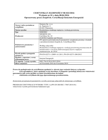 CERTYFIKAT ZGODNOŚCI NR 022/2016 Wydanie nr 01 z dnia 08.04.2016 Opracowany przez Zespół ds. Certyfikacji Instytutu Energetyki Nazwa i adres posiadacza certyfikatu: Nazwa wyrobu: Typ: Producent: Podstawowe parametry i zastosowanie: Wyrób spełnia wymagania zawarte w: Zgodnie z raportem z oceny wykonanym przez: Nr raportu z oceny wyrobu: Okres ważności: Siemens Sp. z o.o. ul. Żupnicza 11 03-821 Warszawa Rozdzielnica średniego napięcia z izolacją powietrzną SIMOSEC SIEMENS AG; Carl-Benz Str. 22 D-60386 Frankfurt nad Menem (W sprawie poświadczonych parametrów urządzenia prosimy o kontakt z przedstawicielami Zespołu ds. Certyfikacji IEn) Według załącznika Rozdzielnica średniego napięcia z izolacją powietrzną przeznaczona do instalowania w sieciach elektroenergetycznych o napięciu znamionowym do 20 kV PN-EN 62271-1:2009+A1:2011, PN-EN 62271-200:2012 Instytut Energetyki DZC/79c/E/2014/2015/2016 od 8 kwietnia 2016 do 8 kwietnia 2019 Prawo do posługiwania się certyfikatem zgodności w okresie jego ważności dotyczy wyłącznie: • tych egzemplarzy, które spełniają wyżej określone wymagania i posiadają identyczne właściwości (parametry) jak wzory/próbki wyrobów przedstawione do badań, • właściciela certyfikatu lub jego upoważnionego przedstawiciela. Zestawienie przypisanych parametrów wyrobu zawierają załączniki do niniejszego certyfikatu. PROGRAM CERTYFIKACJI WYROBU TYPU 1a (PN-EN ISO/IEC 17067:2014-01) właściwości wyrobu potwierdzone badaniami typu