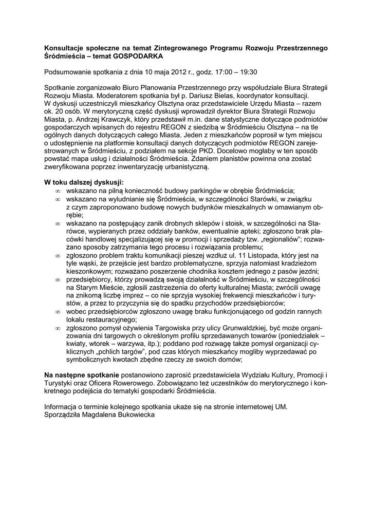 Konsultacje społeczne na temat Zintegrowanego Programu Rozwoju Przestrzennego Śródmieścia – temat GOSPODARKA Podsumowanie spotkania z dnia 10 maja 2012 r., godz. 17:00 – 19:30 Spotkanie zorganizowało Biuro Planowania Przestrzennego przy współudziale Biura Strategii Rozwoju Miasta. Moderatorem spotkania był p. Dariusz Bielas, koordynator konsultacji. W dyskusji uczestniczyli mieszkańcy Olsztyna oraz przedstawiciele Urzędu Miasta – razem ok. 20 osób. W merytoryczną część dyskusji wprowadził dyrektor Biura Strategii Rozwoju Miasta, p. Andrzej Krawczyk, który przedstawił m.in. dane statystyczne dotyczące podmiotów gospodarczych wpisanych do rejestru REGON z siedzibą w Śródmieściu Olsztyna – na tle ogólnych danych dotyczących całego Miasta. Jeden z mieszkańców poprosił w tym miejscu o udostępnienie na platformie konsultacji danych dotyczących podmiotów REGON zarejestrowanych w Śródmieściu, z podziałem na sekcje PKD. Docelowo mogłaby w ten sposób powstać mapa usług i działalności Śródmieścia. Zdaniem planistów powinna ona zostać zweryfikowana poprzez inwentaryzację urbanistyczną. W toku dalszej dyskusji: • wskazano na pilną konieczność budowy parkingów w obrębie Śródmieścia; • wskazano na wyludnianie się Śródmieścia, w szczególności Starówki, w związku z czym zaproponowano budowę nowych budynków mieszkalnych w omawianym obrębie; • wskazano na postępujący zanik drobnych sklepów i stoisk, w szczególności na Starówce, wypieranych przez oddziały banków, ewentualnie apteki; zgłoszono brak placówki handlowej specjalizującej się w promocji i sprzedaży tzw. „regionaliów”; rozważano sposoby zatrzymania tego procesu i rozwiązania problemu; • zgłoszono problem traktu komunikacji pieszej wzdłuż ul. 11 Listopada, który jest na tyle wąski, że przejście jest bardzo problematyczne, sprzyja natomiast kradzieżom kieszonkowym; rozważano poszerzenie chodnika kosztem jednego z pasów jezdni; • przedsiębiorcy, którzy prowadzą swoją działalność w Śródmieściu, w szczególności na Starym Mieście, zgłosili zastrzeżenia do oferty kulturalnej Miasta; zwrócili uwagę na znikomą liczbę imprez – co nie sprzyja wysokiej frekwencji mieszkańców i turystów, a przez to przyczynia się do spadku przychodów przedsiębiorców; • wobec przedsiębiorców zgłoszono uwagę braku funkcjonującego od godzin rannych lokalu restauracyjnego; • zgłoszono pomysł ożywienia Targowiska przy ulicy Grunwaldzkiej, być może organizowania dni targowych o określonym profilu sprzedawanych towarów (poniedziałek – kwiaty, wtorek – warzywa, itp.); poddano pod rozwagę także pomysł organizacji cyklicznych „pchlich targów”, pod czas których mieszkańcy mogliby wyprzedawać po symbolicznych kwotach zbędne rzeczy ze swoich domów; Na następne spotkanie postanowiono zaprosić przedstawiciela Wydziału Kultury, Promocji i Turystyki oraz Oficera Rowerowego. Zobowiązano też uczestników do merytorycznego i konkretnego podejścia do tematyki gospodarki Śródmieścia. Informacja o terminie kolejnego spotkania ukaże się na stronie internetowej UM. Sporządziła Magdalena Bukowiecka