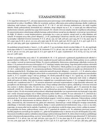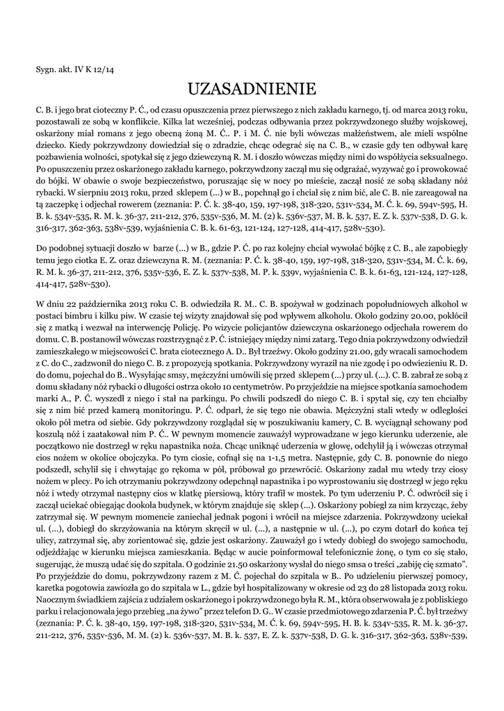 Sygn. akt. IV K 12/14 UZASADNIENIE C. B. i jego brat cioteczny P. Ć., od czasu opuszczenia przez pierwszego z nich zakładu karnego, tj. od marca 2013 roku, pozostawali ze sobą w konflikcie. Kilka lat wcześniej, podczas odbywania przez pokrzywdzonego służby wojskowej, oskarżony miał romans z jego obecną żoną M. Ć.. P. i M. Ć. nie byli wówczas małżeństwem, ale mieli wspólne dziecko. Kiedy pokrzywdzony dowiedział się o zdradzie, chcąc odegrać się na C. B., w czasie gdy ten odbywał karę pozbawienia wolności, spotykał się z jego dziewczyną R. M. i doszło wówczas między nimi do współżycia seksualnego. Po opuszczeniu przez oskarżonego zakładu karnego, pokrzywdzony zaczął mu się odgrażać, wyzywać go i prowokować do bójki. W obawie o swoje bezpieczeństwo, poruszając się w nocy po mieście, zaczął nosić ze sobą składany nóż rybacki. W sierpniu 2013 roku, przed sklepem (...) w B., popchnął go i chciał się z nim bić, ale C. B. nie zareagował na tą zaczepkę i odjechał rowerem (zeznania: P. Ć. k. 38-40, 159, 197-198, 318-320, 531v-534, M. Ć. k. 69, 594v-595, H. B. k. 534v-535, R. M. k. 36-37, 211-212, 376, 535v-536, M. M. (2) k. 536v-537, M. B. k. 537, E. Z. k. 537v-538, D. G. k. 316-317, 362-363, 538v-539, wyjaśnienia C. B. k. 61-63, 121-124, 127-128, 414-417, 528v-530). Do podobnej sytuacji doszło w barze (...) w B., gdzie P. Ć. po raz kolejny chciał wywołać bójkę z C. B., ale zapobiegły temu jego ciotka E. Z. oraz dziewczyna R. M. (zeznania: P. Ć. k. 38-40, 159, 197-198, 318-320, 531v-534, M. Ć. k. 69, R. M. k. 36-37, 211-212, 376, 535v-536, E. Z. k. 537v-538, M. P. k. 539v, wyjaśnienia C. B. k. 61-63, 121-124, 127-128, 414-417, 528v-530). W dniu 22 października 2013 roku C. B. odwiedziła R. M.. C. B. spożywał w godzinach popołudniowych alkohol w postaci bimbru i kilku piw. W czasie tej wizyty znajdował się pod wpływem alkoholu. Około godziny 20.00, pokłócił się z matką i wezwał na interwencję Policję. Po wizycie policjantów dziewczyna oskarżonego odjechała rowerem do domu. C. B. postanowił wówczas rozstrzygnąć z P. Ć. istniejący między nimi zatarg. Tego dnia pokrzywdzony odwiedził zamieszkałego w miejscowości C. brata ciotecznego A. D.. Był trzeźwy. Około godziny 21.00, gdy wracali samochodem z C. do C., zadzwonił do niego C. B. z propozycją spotkania. Pokrzywdzony wyraził na nie zgodę i po odwiezieniu R. D. do domu, pojechał do B.. Wysyłając smsy, mężczyźni umówili się przed sklepem (...) przy ul. (...). C. B. zabrał ze sobą z domu składany nóż rybacki o długości ostrza około 10 centymetrów. Po przyjeździe na miejsce spotkania samochodem marki A., P. Ć. wyszedł z niego i stał na parkingu. Po chwili podszedł do niego C. B. i spytał się, czy ten chciałby się z nim bić przed kamerą monitoringu. P. Ć. odparł, że się tego nie obawia. Mężczyźni stali wtedy w odległości około pół metra od siebie. Gdy pokrzywdzony rozglądał się w poszukiwaniu kamery, C. B. wyciągnął schowany pod koszulą nóż i zaatakował nim P. Ć.. W pewnym momencie zauważył wyprowadzane w jego kierunku uderzenie, ale początkowo nie dostrzegł w ręku napastnika noża. Chcąc uniknąć uderzenia w głowę, odchylił ją i wówczas otrzymał cios nożem w okolice obojczyka. Po tym ciosie, cofnął się na 1-1,5 metra. Następnie, gdy C. B. ponownie do niego podszedł, schylił się i chwytając go rękoma w pół, próbował go przewrócić. Oskarżony zadał mu wtedy trzy ciosy nożem w plecy. Po ich otrzymaniu pokrzywdzony odepchnął napastnika i po wyprostowaniu się dostrzegł w jego ręku nóż i wtedy otrzymał następny cios w klatkę piersiową, który trafił w mostek. Po tym uderzeniu P. Ć. odwrócił się i zaczął uciekać obiegając dookoła budynek, w którym znajduje się sklep (...). Oskarżony pobiegł za nim krzycząc, żeby zatrzymał się. W pewnym momencie zaniechał jednak pogoni i wrócił na miejsce zdarzenia. Pokrzywdzony uciekał ul. (...), dobiegł do skrzyżowania na którym skręcił w ul. (...), a następnie w ul. (...), po czym dotarł do końca tej ulicy, zatrzymał się, aby zorientować się, gdzie jest oskarżony. Zauważył go i wtedy dobiegł do swojego samochodu, odjeżdżając w kierunku miejsca zamieszkania. Będąc w aucie poinformował telefonicznie żonę, o tym co się stało, sugerując, że muszą udać się do szpitala. O godzinie 21.50 oskarżony wysłał do niego smsa o treści „zabiję cię szmato”. Po przyjeździe do domu, pokrzywdzony razem z M. Ć. pojechał do szpitala w B.. Po udzieleniu pierwszej pomocy, karetka pogotowia zawiozła go do szpitala w L., gdzie był hospitalizowany w okresie od 23 do 28 listopada 2013 roku. Naocznym świadkiem zajścia z udziałem oskarżonego i pokrzywdzonego była R. M., która obserwowała je z pobliskiego parku i relacjonowała jego przebieg „na żywo” przez telefon D. G.. W czasie przedmiotowego zdarzenia P. Ć. był trzeźwy (zeznania: P. Ć. k. 38-40, 159, 197-198, 318-320, 531v-534, M. Ć. k. 69, 594v-595, H. B. k. 534v-535, R. M. k. 36-37, 211-212, 376, 535v-536, M. M. (2) k. 536v-537, M. B. k. 537, E. Z. k. 537v-538, D. G. k. 316-317, 362-363, 538v-539, A. D. k. 539, D. S. k. 42-43, 231-232, A. R. k. 194-195, 196, częściowo wyjaśnienia C. B. k. 61-63, 121-124, 127-128, 414-417, 528v-530, protokół badania stanu trzeźwości P. Ć. k. 16, protokół oględzin telefonu komórkowego należącego do C. B. k. 64-65 (233-234), zapis z monitoringu przed sklepem (...) w B. z dnia 22 października 2013 roku k. 73, protokół oględzin płyty DVD z zapisem monitoringu ze sklepu (...) w B. k. 82-84 (239-240), protokół oględzin telefonu komórkowego do P. Ć. wraz z materiałem poglądowym k. 156-158 (159-160), 323-324 (325-326), 327, wykaz połączeń z telefonu komórkowego należącego do C. B. k. 332-338, protokół oględzin wykazu połączeń z telefonu komórkowego 