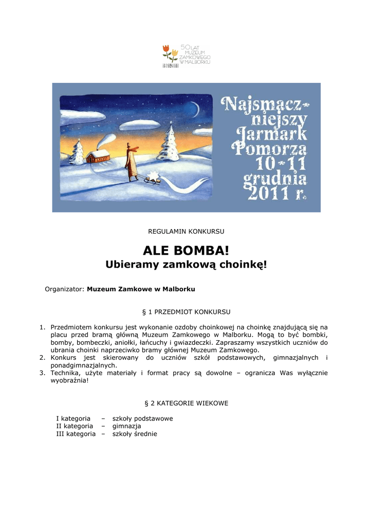 REGULAMIN KONKURSU ALE BOMBA! Ubieramy zamkową choinkę! Organizator: Muzeum Zamkowe w Malborku § 1 PRZEDMIOT KONKURSU 1. Przedmiotem konkursu jest wykonanie ozdoby choinkowej na choinkę znajdującą się na placu przed bramą główną Muzeum Zamkowego w Malborku. Mogą to być bombki, bomby, bombeczki, aniołki, łańcuchy i gwiazdeczki. Zapraszamy wszystkich uczniów do ubrania choinki naprzeciwko bramy głównej Muzeum Zamkowego. 2. Konkurs jest skierowany do uczniów szkół podstawowych, gimnazjalnych i ponadgimnazjalnych. 3. Technika, użyte materiały i format pracy są dowolne – ogranicza Was wyłącznie wyobraźnia! § 2 KATEGORIE WIEKOWE I kategoria – II kategoria – III kategoria – szkoły podstawowe gimnazja szkoły średnie § 3 NAGRODY W każdej kategorii wiekowej zostaną przyznane 3 nagrody. Zwycięzca wygrywa nagrodę dla całej swojej klasy lub grupy. I nagroda – Wędrówka tajnym szlakiem… – specjalna wizyta na zamku, w czasie której zobaczycie zakamarki, których nie udostępniamy na co dzień. II nagroda – Światło i Dźwięk – poznacie zamek w innym świetle. III nagroda – Wizyta w Parku Machin Oblężniczych § 4 WARUNKI KONKURSU 1. Termin składania prac – do 5 grudnia 2011 2. Prace winny zostać złożone na adres: Muzeum Zamkowe w Malborku, Dział Promocji ul. Starościńska 1, 82-200 Malbork z dopiskiem: Konkurs ALE BOMBA! 3. Wszystkie prace powinny mieć zawieszkę choinkową, do której należy przyczepić karteczkę opatrzoną godłem twórcy. Do pracy musi być dołączona zaklejona koperta opatrzona tym samym godłem w środku następujące informacje: – imię i nazwisko autora – wiek autora – adres domowy, adres elektroniczny (jeśli uczestnik konkursu posiada) – kategorię konkursową – adres szkoły – imię i nazwisko nauczyciela prowadzącego 4. Na karteczce obok godła należy umieścić symbol kategorii wiekowej (I, II lub III) 5. Każdy autor może dostarczyć tylko jedną pracę. § 5 JURY I WYNIKI KONKURSU: 1. Jury konkursu powołuje Muzeum Zamkowe w Malborku. 2. W skład Jury wchodzą: Rafał Mańkus – Wicedyrektor ds. Marketingu i Administracji Jolanta Kacperska – Pracowania Plastyczna MZM Ada Kamińska – Dział Promocji 3. Posiedzenie jury odbędzie się 7 grudnia 2011 roku. 4. Nagrody zostaną przyznane we wszystkich kategoriach wiekowych. 5. Wyniki konkursu zostaną ogłoszone ze sceny w czasie Najsmaczniejszego Jarmarku Adwentowego w dn. 10 grudnia 2011 roku, o godzinie 15:00 6. Informacje o wynikach konkursu zostaną podane do dnia 12 grudnia 2011 r. na stronie internetowej Muzeum Zamkowego w Malborku - www.zamek.malbork.pl Informacji udziela: Muzeum Zamkowe w Malborku Dział Promocji tel. 55 647 09 96 email [email protected] Uczestnik akceptując postanowienia niniejszego Regulaminu oświadcza, iż wyraża zgodę na przetwarzanie jego danych osobowych w zakresie koniecznym do przeprowadzenia niniejszego Konkursu, ogłoszenia wyników (w tym w sieci Internet) oraz przyznania nagród. Organizatorzy konkursu zastrzegają sobie prawo publikowania i reprodukowania prac konkursowych, bez wypłacania honorariów autorskich; przesłane prace przechodzą na własność organizatorów.