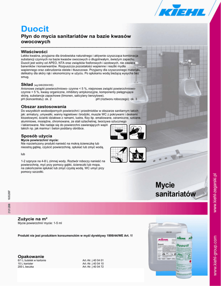 Duocit Płyn do mycia sanitariatów na bazie kwasów owocowych ⎯⎯⎯⎯⎯⎯⎯⎯⎯⎯⎯⎯⎯⎯⎯⎯⎯⎯⎯⎯⎯⎯⎯⎯⎯⎯⎯ Właściwości Lekko kwaśna, przyjazna dla środowiska naturalnego i aktywnie czyszcząca kombinacja substancji czynnych na bazie kwasów owocowych o długotrwałym, świeżym zapachu. Duocit jest wolny od APEO, NTA oraz związków fosforowych i azotowych, nie zawiera barwników i konserwantów. Rozpuszcza pozostałości wapienne i resztki mydła wapiennego oraz zabrudzenia oleiste i tłuszczowe. Przyjazny dla czyszczonego materiału, delikatny dla skóry rąk i ekonomiczny w użyciu. Po spłukaniu wodą bieżącą wysycha bez smug. Skład (wg 648/2004/WE) Anionowe związki powierzchniowo- czynne < 5 %, niejonowe związki powierzchniowoczynne < 5 %, kwasy organiczne, inhibitory antykorozyjne, komponenty pielęgnujące skórę, substancje zapachowe (limonen, salicylany benzylowe). pH (koncentratu): ok. 2 pH (roztworu roboczego): ok. 3 Obszar zastosowania Do wszystkich wodoodpornych powierzchni i przedmiotów w obszarze sanitarnym takich jak: armatury, umywalki, wanny kąpielowe i brodziki, muszle WC z pokrywami i deskami klozetowymi, ścianki działowe z ramami, lustra, flizy itp. emaliowane, ceramiczne, szklane, aluminiowe, mosiężne, chromowane, ze stali szlachetnej, tworzywa sztucznego i lakierowane. Nie nadaje się do powierzchni zawierających wapń takich np. jak marmur i beton poddany obróbce. Sposób użycia Mycie powierzchni/ mycie: Nie rozcieńczony produkt nanieść na mokrą ściereczkę lub nieostrą gąbkę, czyścić powierzchnię, spłukać lub zmyć wodą. 1-2 szpryce na 4-8 L zimnej wody. Roztwór roboczy nanieść na powierzchnię, myć przy pomocy gąbki, ściereczki lub mopa, na zakończenie spłukać lub zmyć czystą wodą. WC umyć przy pomocy szczotki. 21.01.2006 16.05.2007 Mycie sanitariatów Zużycie na m² Mycie powierzchni/ mycie: 1-5 ml Produkt nie jest produktem konsumenckim w myśl dyrektywy 1999/44/WE Art. 1! Opakowanie 6/1 L butelek w kartonie 10 L kanister 200 L beczka Art.-Nr. j 40 04 01 Art.-Nr. j 40 04 10 Art.-Nr. j 40 04 72 www.kiehl-zegarski.pl lub