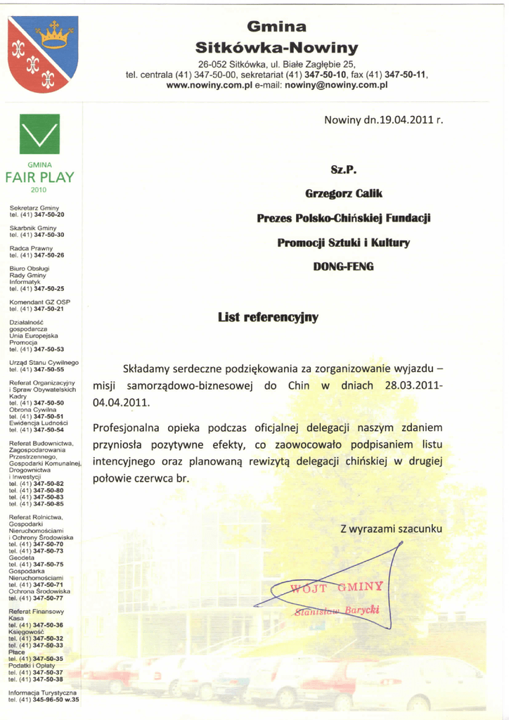 Gmina Sitkowka-Nowiny 26-052 Sitkowka, ul. Biate Zag^bie 25, tel. centrala (41) 347-50-00, sekretariat (41) 347-50-10, fax (41) 347-50-11 www.nowiny.com.pl e-mail: [email protected] Nowinydn.19.04.2011 r. GMINA Sz.P. FAIR PLAY 2010 Sekretarz Gminy tel. (41)347-50-20 Grzegorz Calik Prezes Polsko-Chihskiej Fundacji Skarbnik Gminy tel. (41)347-50-30 Radca Prawny tel. (41)347-50-26 Biuro Obslugi Rady Gminy Informatyk Promocji S/tuki i Kullurv DONG-FENG tel. (41)347-50-25 Komendant GZ OSP tel. (41)347-50-21 DziatalnoSc gospodarcza Unia Europejska Promocja List referencyjny tel. (41)347-50-53 Urzad Stanu Cywilnego tel. (41)347-50-55 Referat Organizacyjny i Spraw Obywatelskich Kadry tel. (41)347-50-50 Obrona Cywilna tel. (41)347-50-51 Ewidencja Ludnosci tel. (41)347-50-54 Referat Budownictwa, Zagospodarowania Przestrzennego, Gospodarki Komunalnej, Drogownictwa i Inwestycji tel. (41)347-50-82 tel. (41)347-50-80 tel. (41)347-50-83 Sktadamy serdeczne podzi^kowania za zorganizowanie wyjazdu misji samorzqdowo-biznesowej do Chin w dniach 28.03.201104.04.2011. Profesjonalna opieka podczas oficjalnej delegacji naszym zdaniem przyniosta pozytywne efekty, co zaowocowato podpisaniem listu intencyjnego oraz planowanq rewizyta. delegacji chihskiej w drugiej potowie czerwca br. tel. (41)347-50-85 Referat Rolnictwa. Gospodarki Nieruchomosciami j Ochrony Srodowiska tel. (41)347-50-70 tel. (41)347-50-73 Geodeta tel. (41)347-50-75 Gospodarka NieruchomoSciami tel. (41)347-50-71 Ochrona Srodowiska tel. (41)347-50-77 Referat Finansowy Kasa tel. (41)347-50-36 Ksiegowosc tel. (41) 347-50-32 tel. (41)347-50-33 Place tel. (41)347-50-35 Podatki i Optaty tel. (41)347-50-37 tel. (41)347-50-38 Informacja Turystyczna tel. (41) 345-96-50 w.35 Z wyrazami szacunku